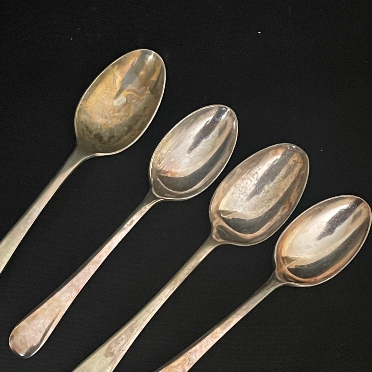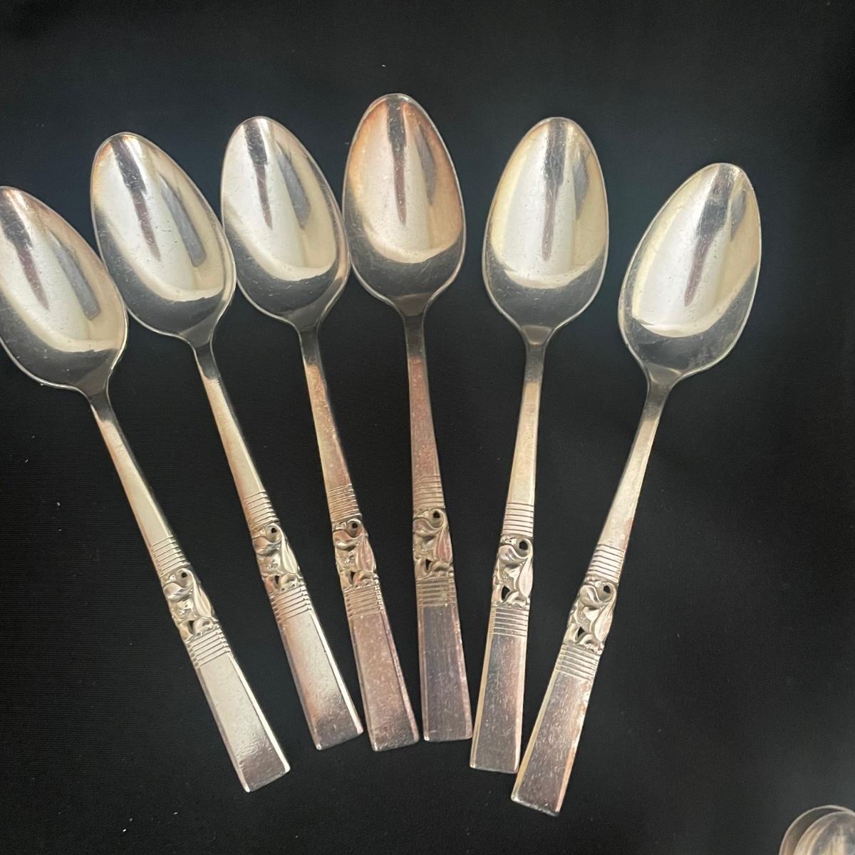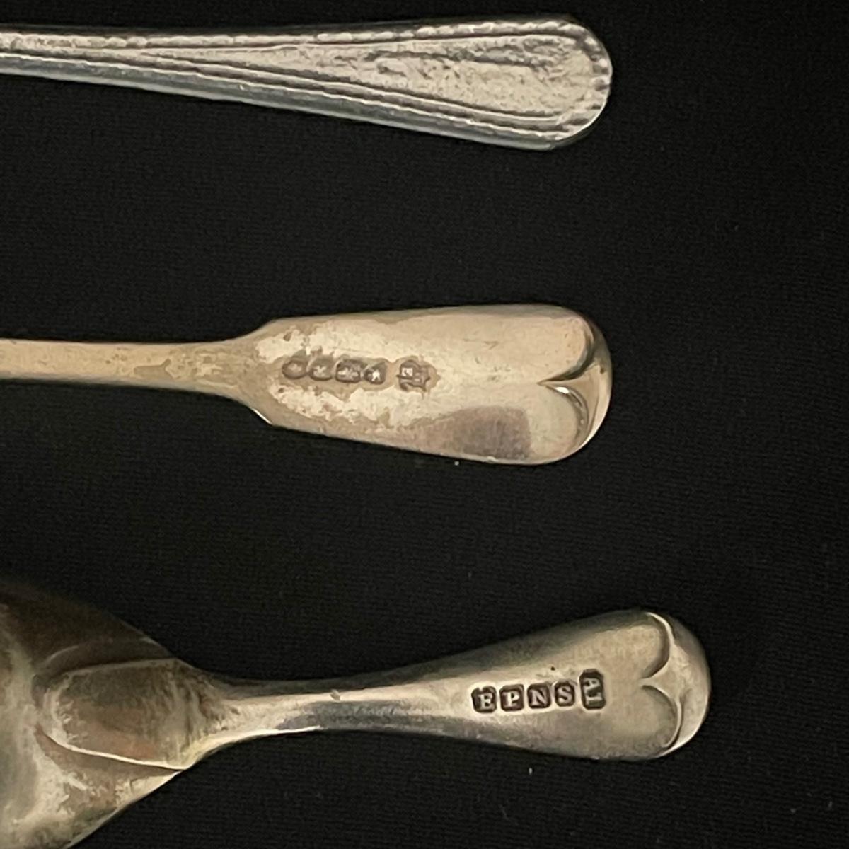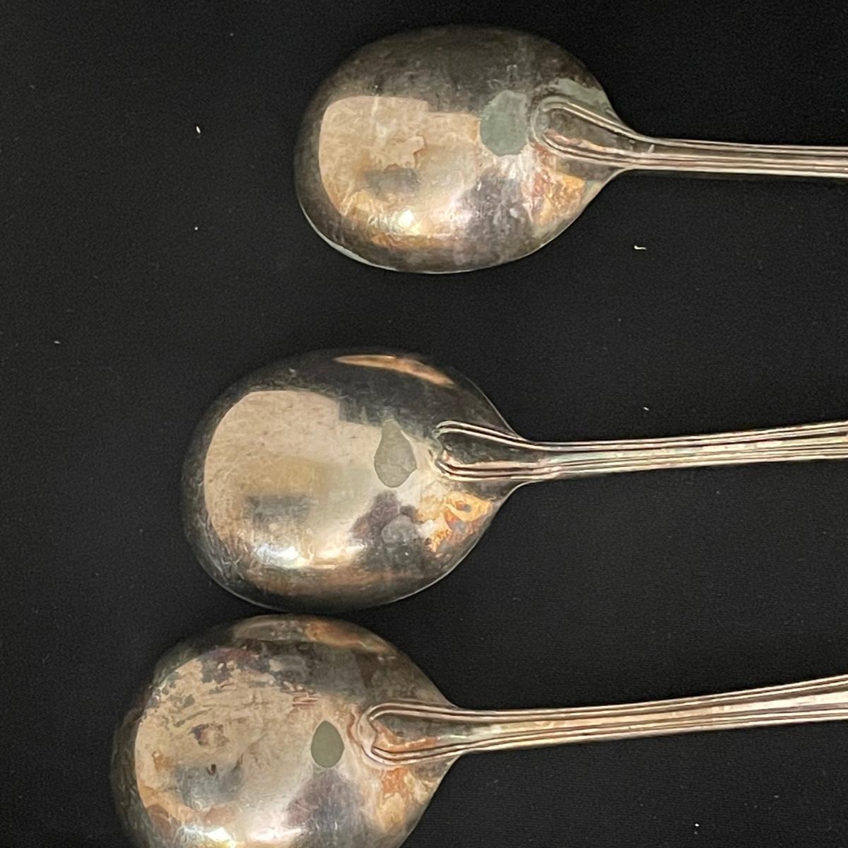 Thirty spoons here that includes tea spoons and larger spoons. One ornate teaspoon is marked sterling, the rest are mostly silver plate, see images for markings.