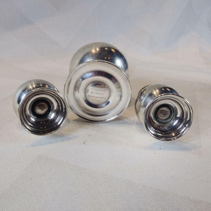 This auction lot is for a 3 piece set of Sterling Silver Sugar, Salt & Pepper Shakers - Group #2 The Sugar Shaker is marked Candlewick International and is marked weighted - it weights as it sits 66-grams on our scale. The Salt and Pepper Shakers are NOT weighed. Their combined weight is 34-grams on our scale. All the items are in very good condition. Note: the starting price is the reserved price.