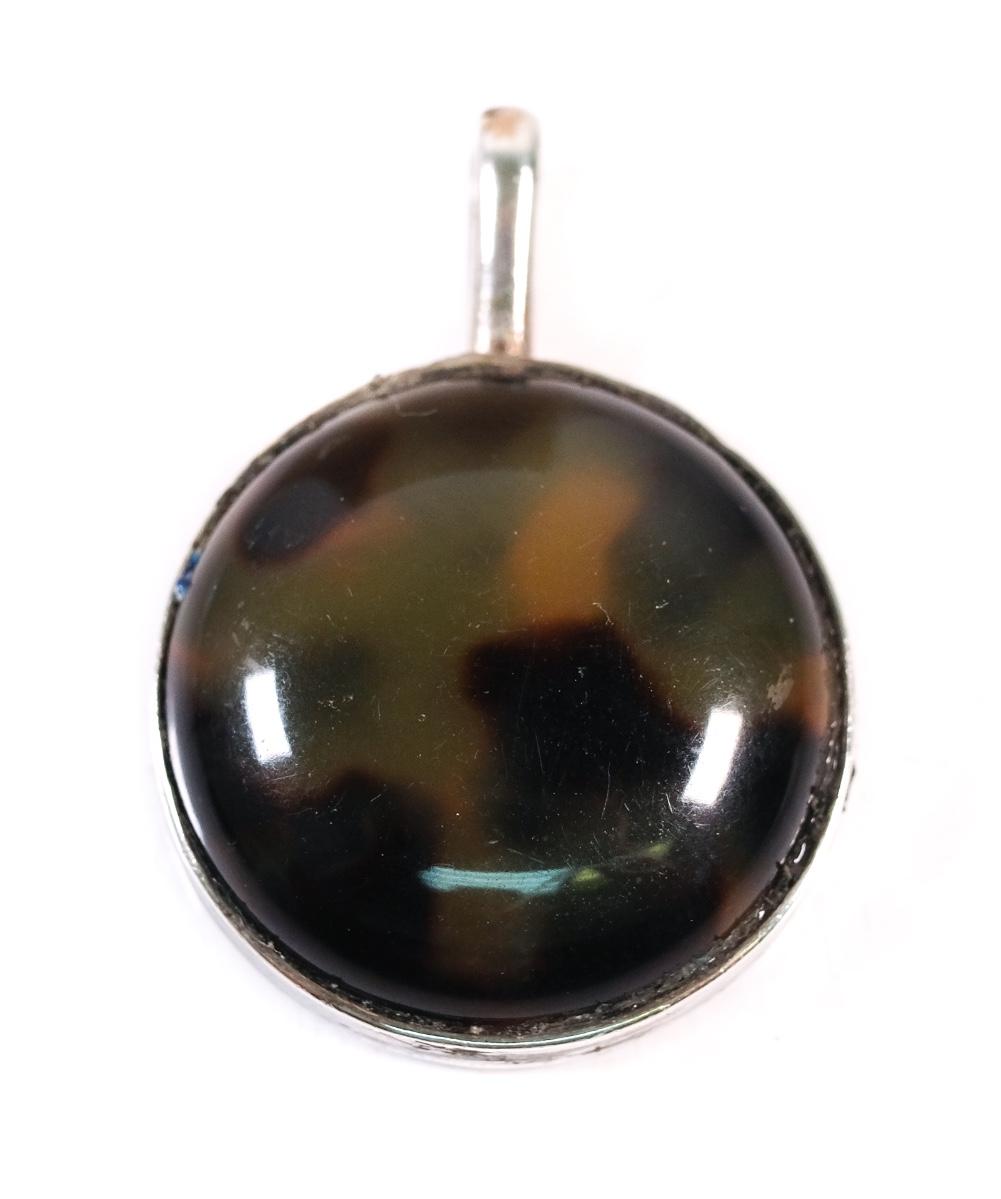 Sterling tortoise color resin pendant. Stamped 925. Measures approx. 1.5". Weighs approx. 14 grams.