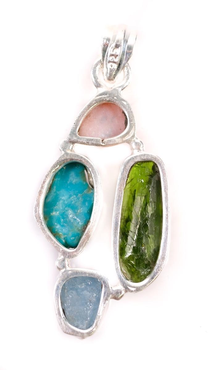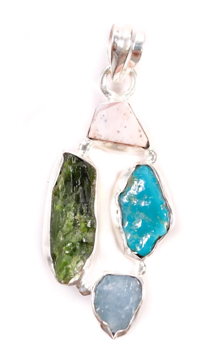 Sterling Turquoise, raw Aqua & Moldavite Pendant. Stamped 925. Measures approx. 1.75". Weighs approx. 5.9 grams.