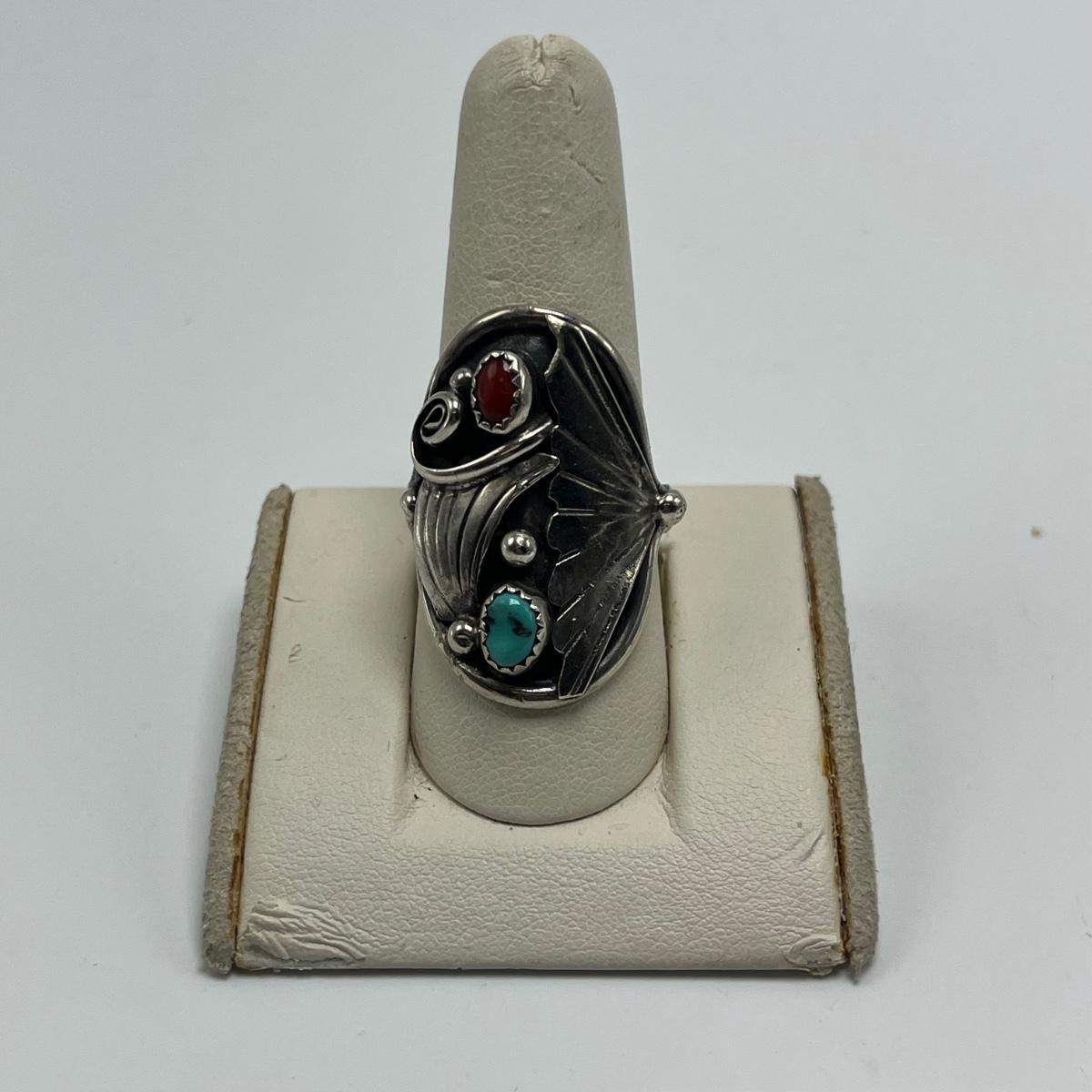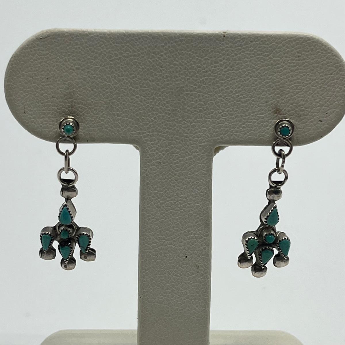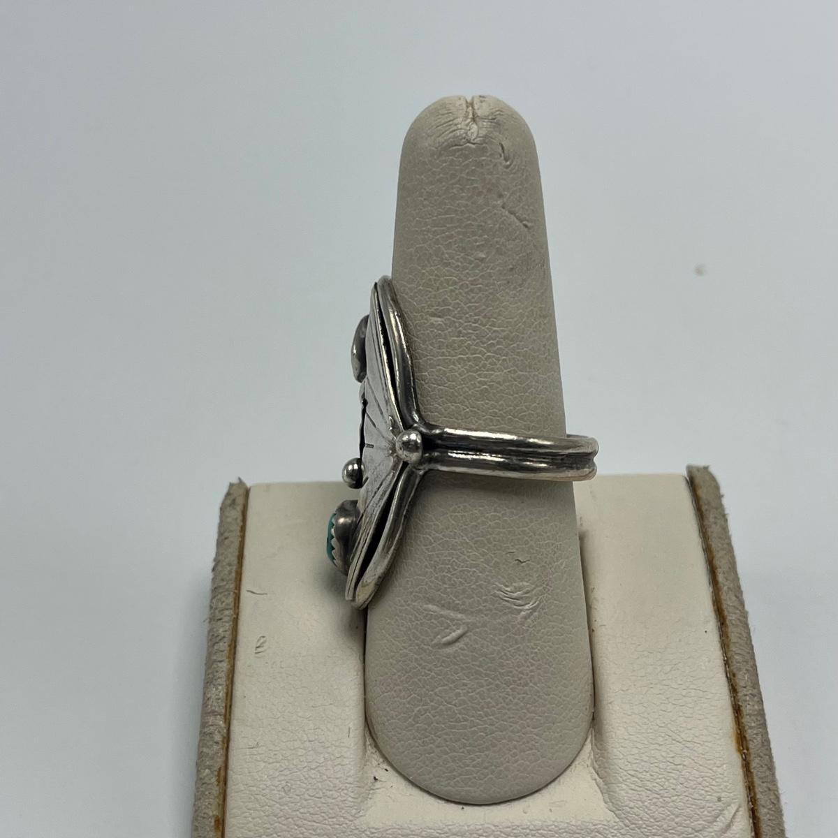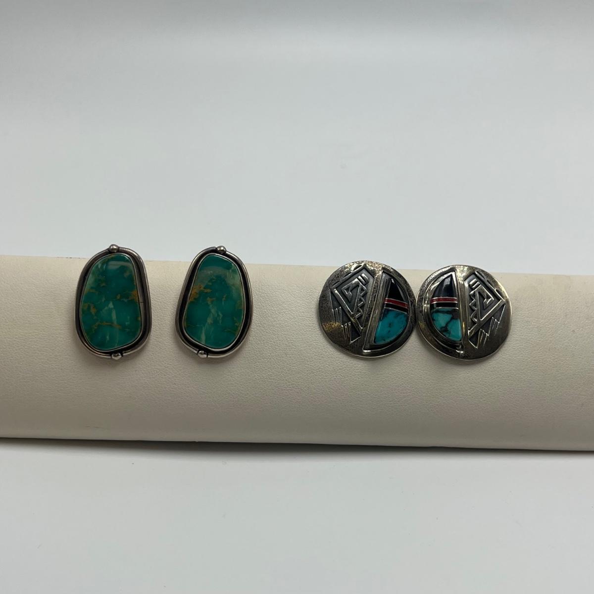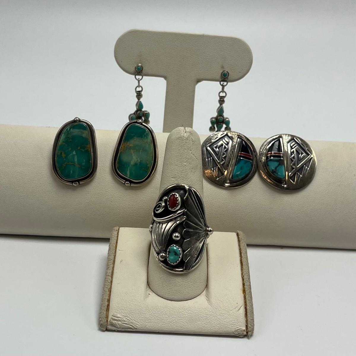 Lot includes two pairs of silver earrings marked sterling with turquoise-colored stones, silver colored ring with turquoise colored stone and silver colored earrings with turquoise-colored stones. See images for other known markings. All sales are final. No returns or refunds. Please bid accordingly.
