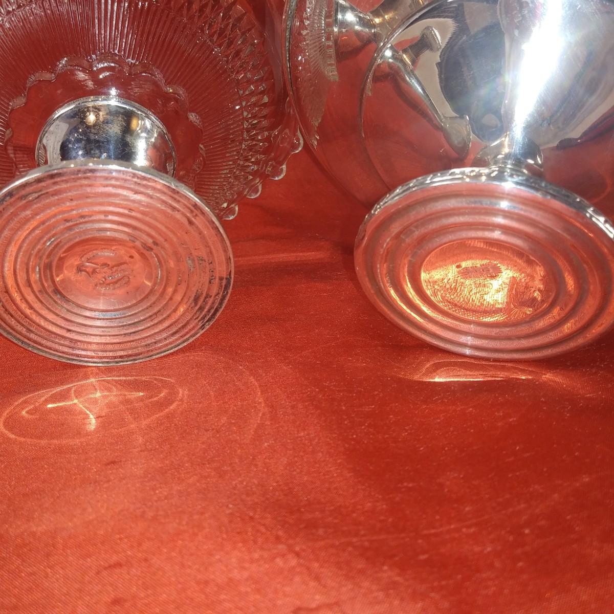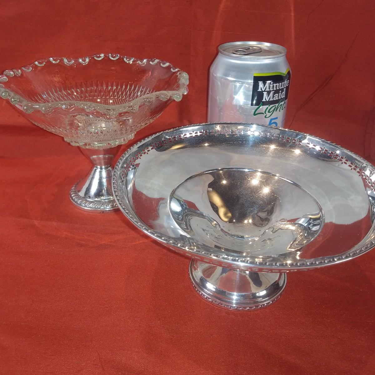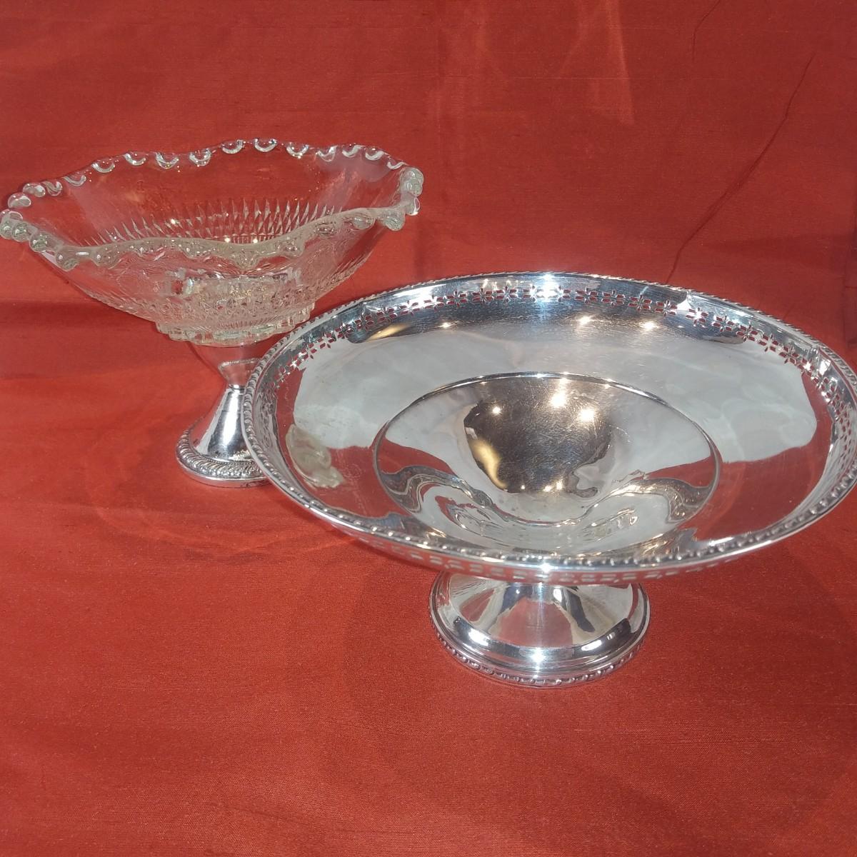 this auction lot is for two Sterling Weighted Compotes. These are 2 lovely sterling silver compotes. One is glass with weighted sterling base and the other is all sterling with a weighted base. The glass compote is about 6-inches in diameter and the other one is about 6.25-inches in diameter. Both are in very good condition.