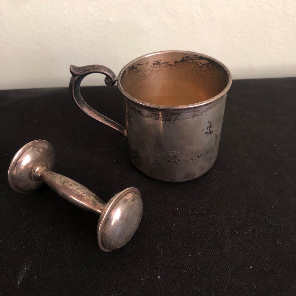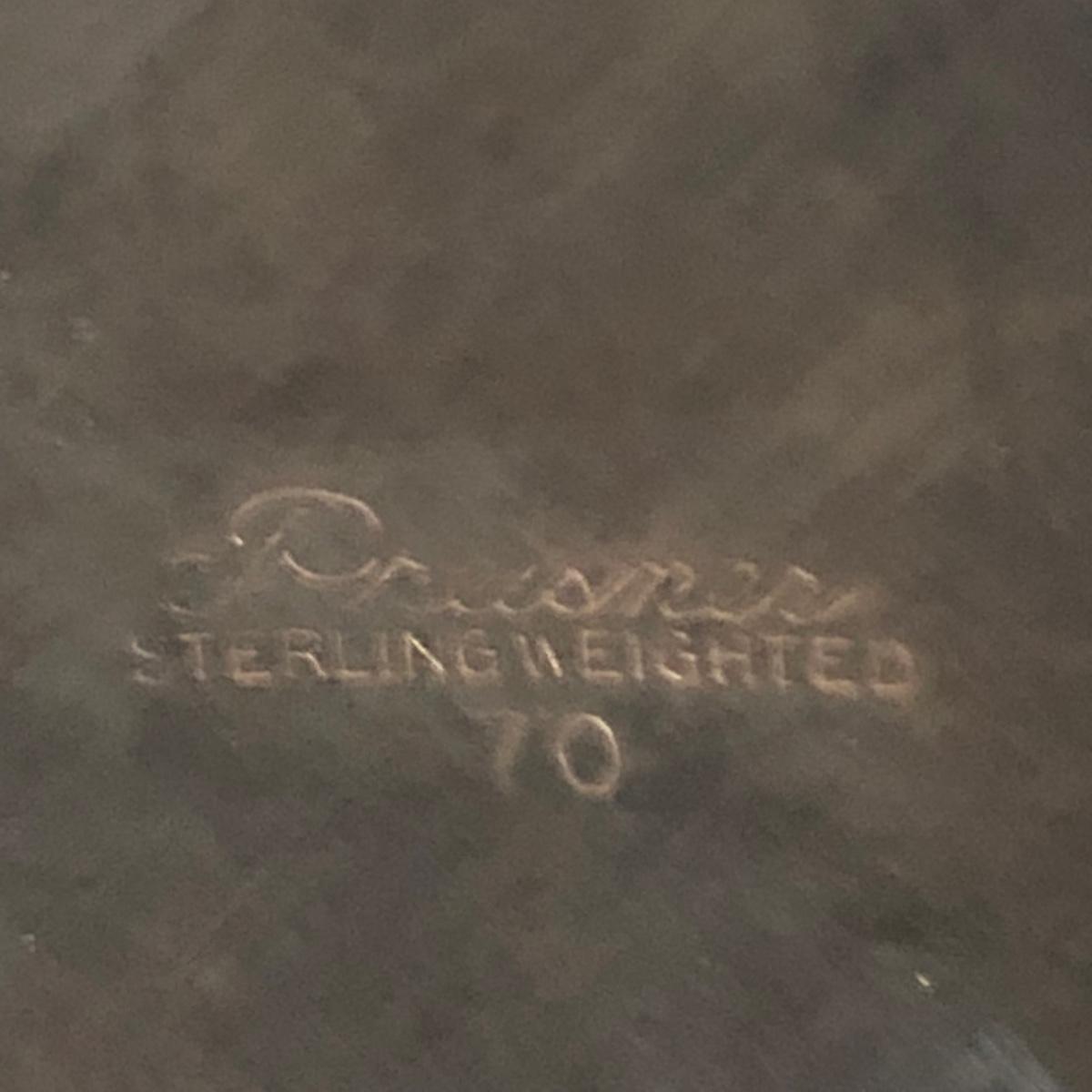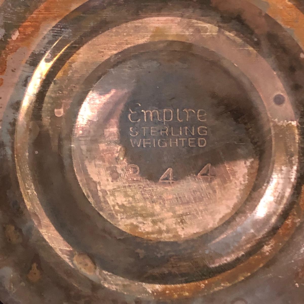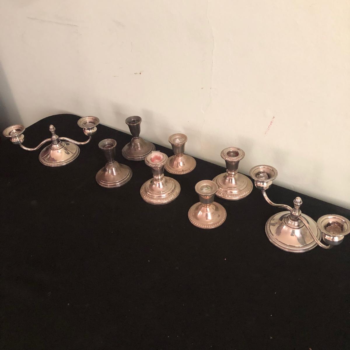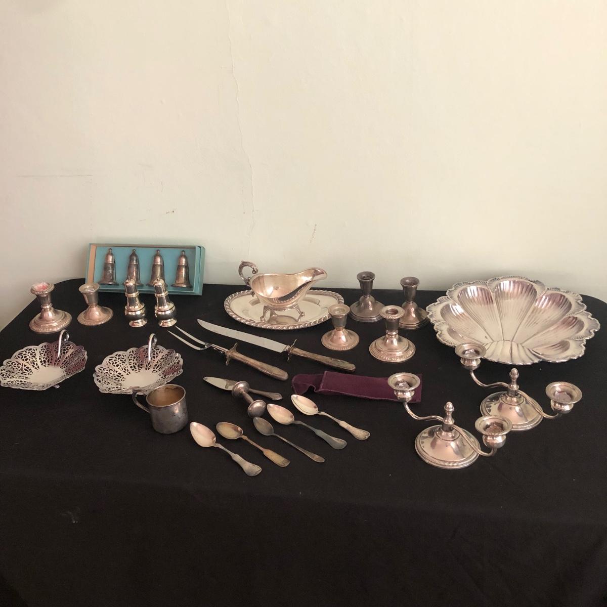 This lot contains 29 pieces. The two Lovelace dishes (with three legs and a handle) measures 6” in diameter. The Gorham fleury dish measures 12” x 12” and has Gorham YC623 on the back. The cup is Newport Sterling 1626 and the rattle is Lunt Sterling 1180. The salt and pepper shakers are TWR Sterling and stand over 4.5” tall. The serving knife and fork are marked “Sterling Handles.” The gravy boat and tray are Aniston SP. The four salt & pepper shakers in a box are by Empire Silver Co. And lastly, the eight candle stick holders are sterling weighted. There are also five sterling spoons. Shipping Available.