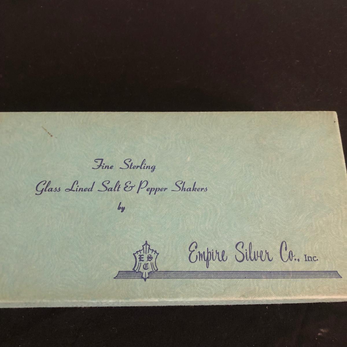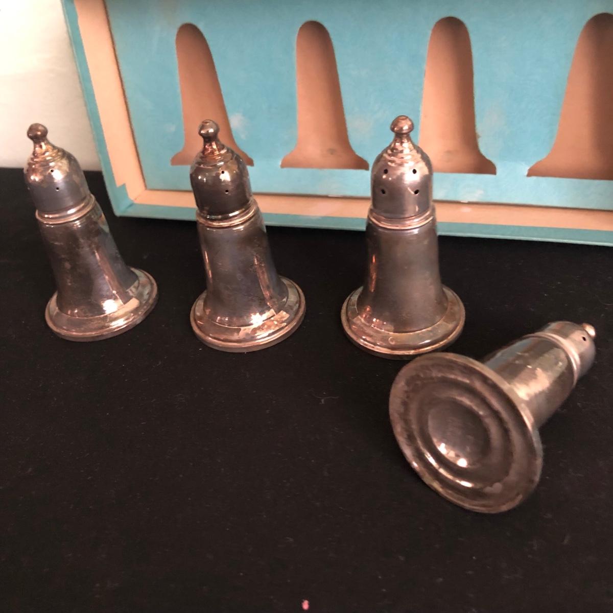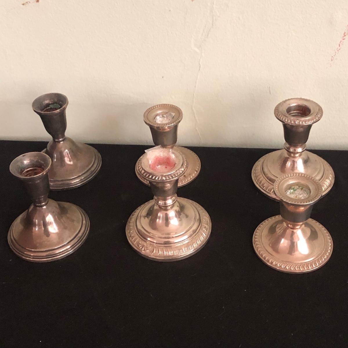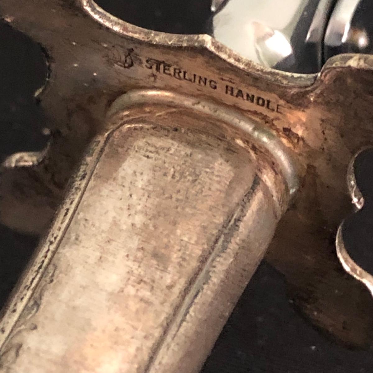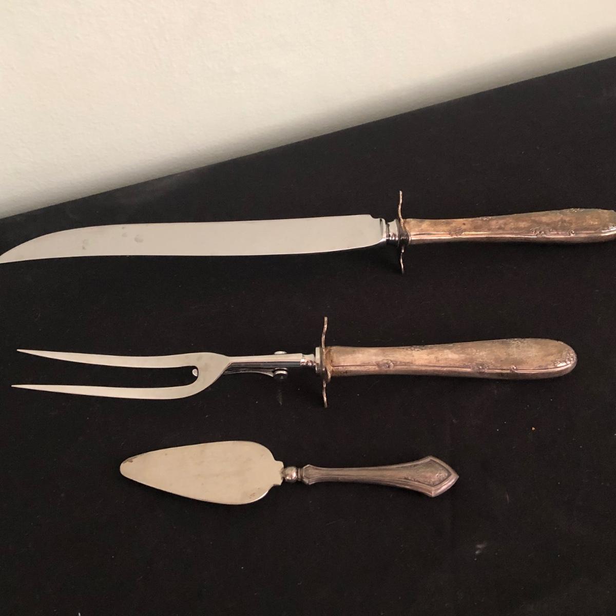 This lot contains 29 pieces. The two Lovelace dishes (with three legs and a handle) measures 6” in diameter. The Gorham fleury dish measures 12” x 12” and has Gorham YC623 on the back. The cup is Newport Sterling 1626 and the rattle is Lunt Sterling 1180. The salt and pepper shakers are TWR Sterling and stand over 4.5” tall. The serving knife and fork are marked “Sterling Handles.” The gravy boat and tray are Aniston SP. The four salt & pepper shakers in a box are by Empire Silver Co. And lastly, the eight candle stick holders are sterling weighted. There are also five sterling spoons. Shipping Available.