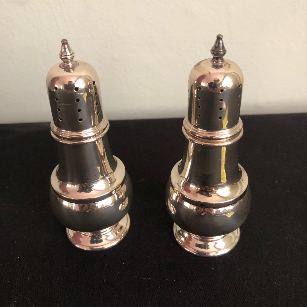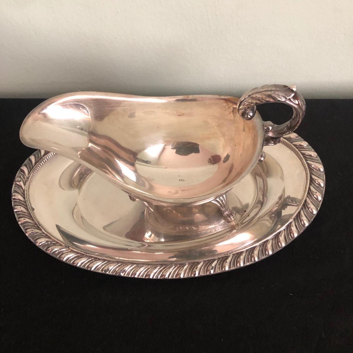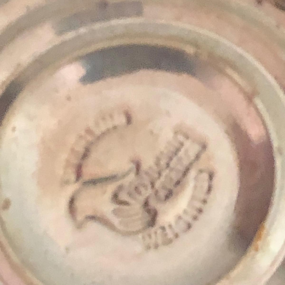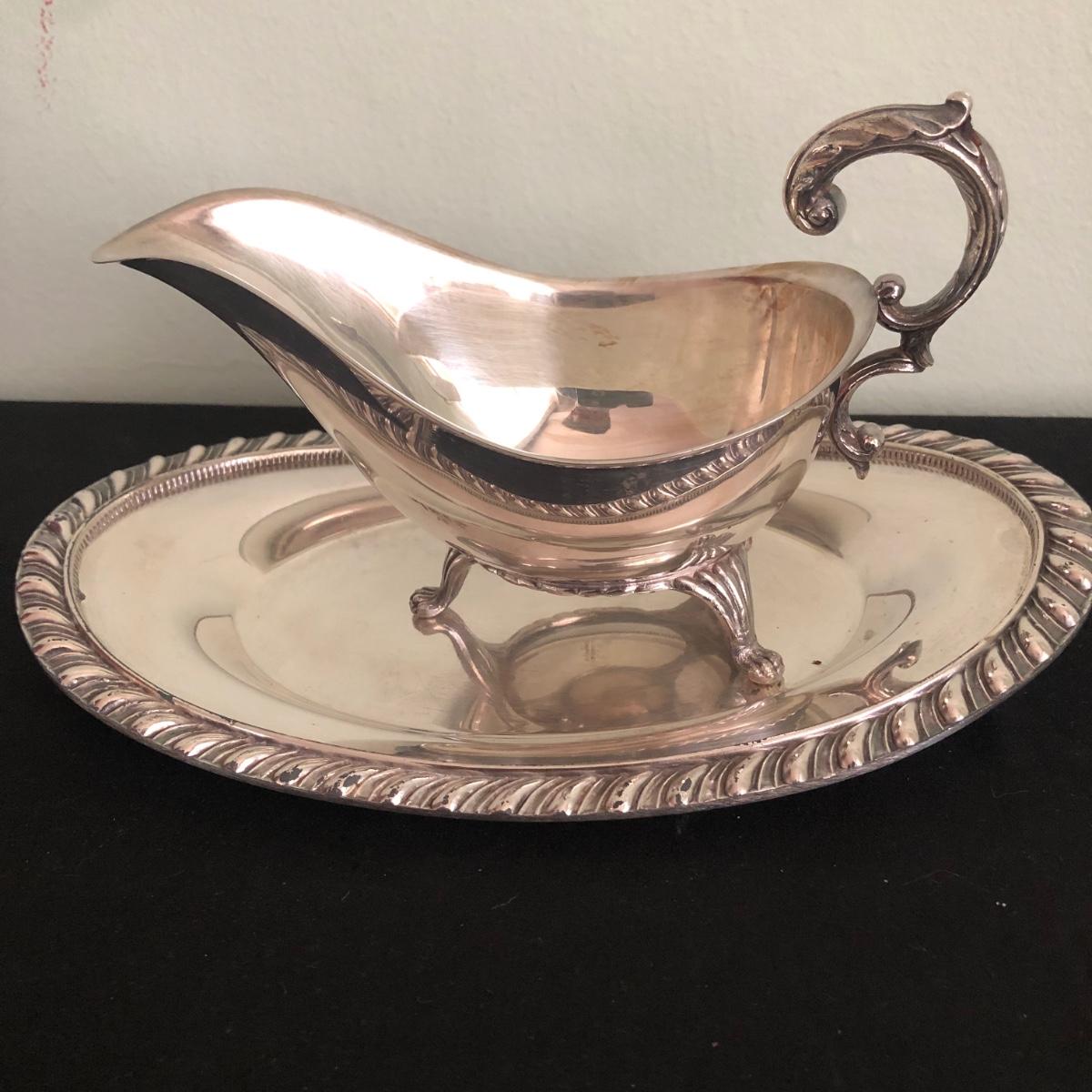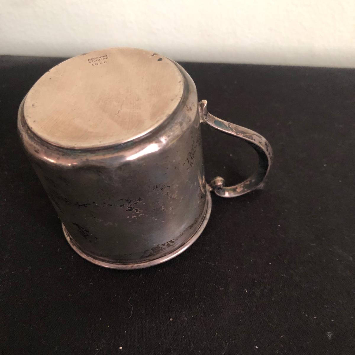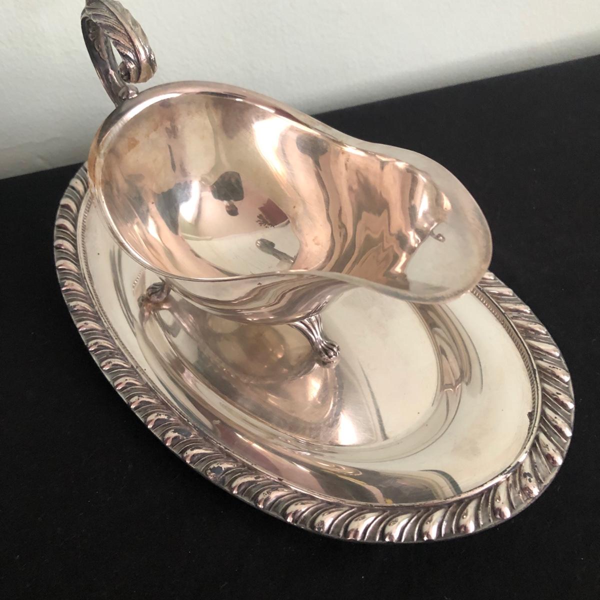 This lot contains 29 pieces. The two Lovelace dishes (with three legs and a handle) measures 6” in diameter. The Gorham fleury dish measures 12” x 12” and has Gorham YC623 on the back. The cup is Newport Sterling 1626 and the rattle is Lunt Sterling 1180. The salt and pepper shakers are TWR Sterling and stand over 4.5” tall. The serving knife and fork are marked “Sterling Handles.” The gravy boat and tray are Aniston SP. The four salt & pepper shakers in a box are by Empire Silver Co. And lastly, the eight candle stick holders are sterling weighted. There are also five sterling spoons. Shipping Available.
