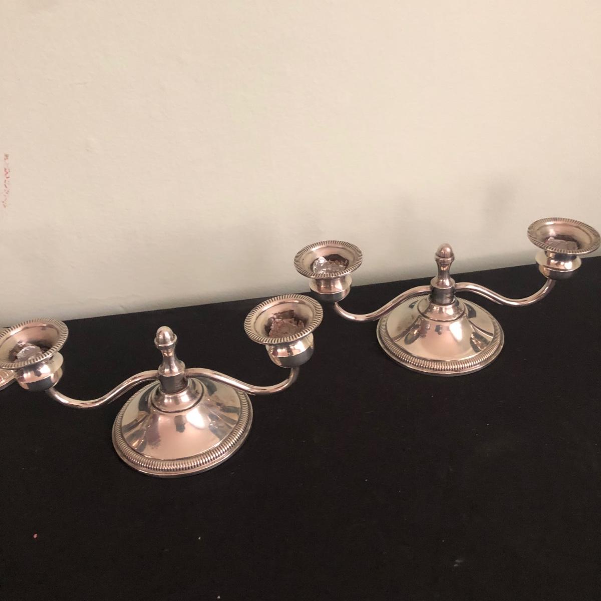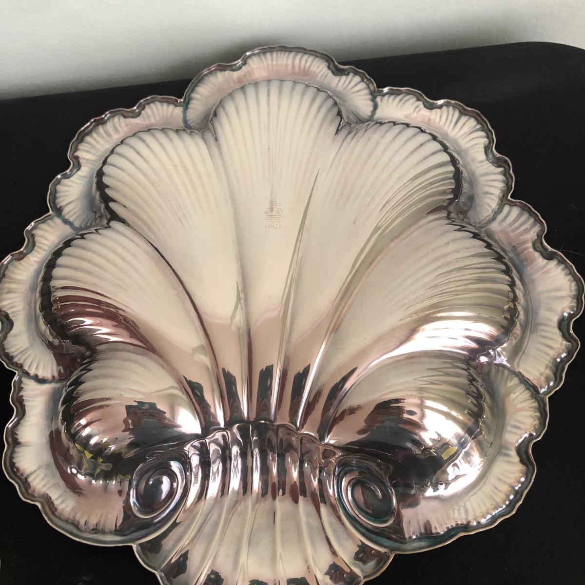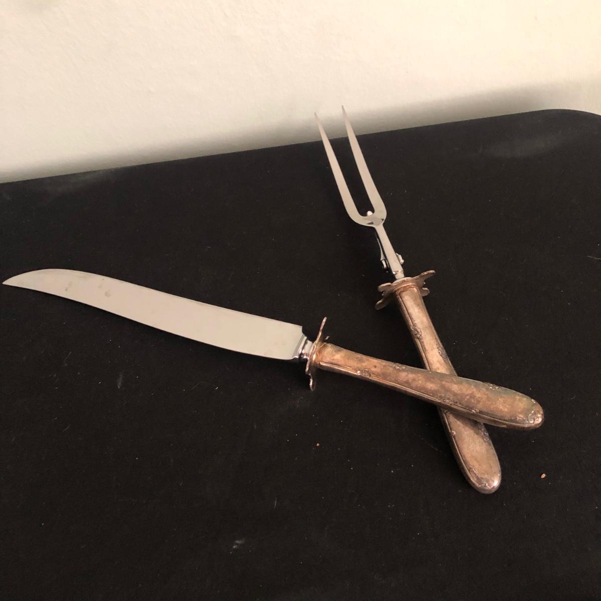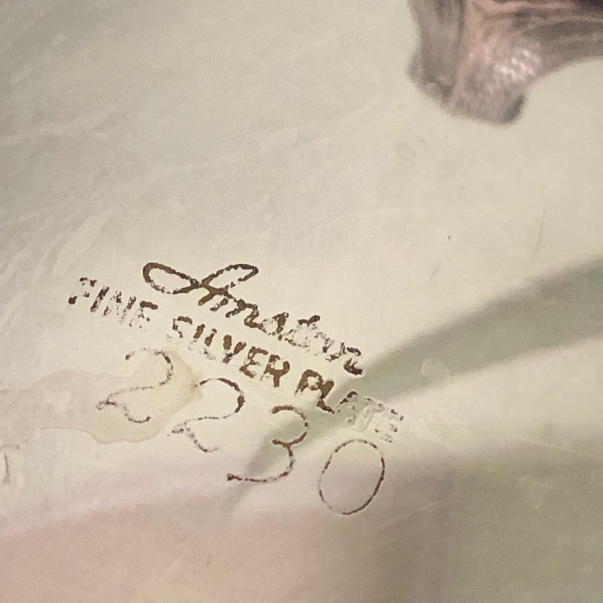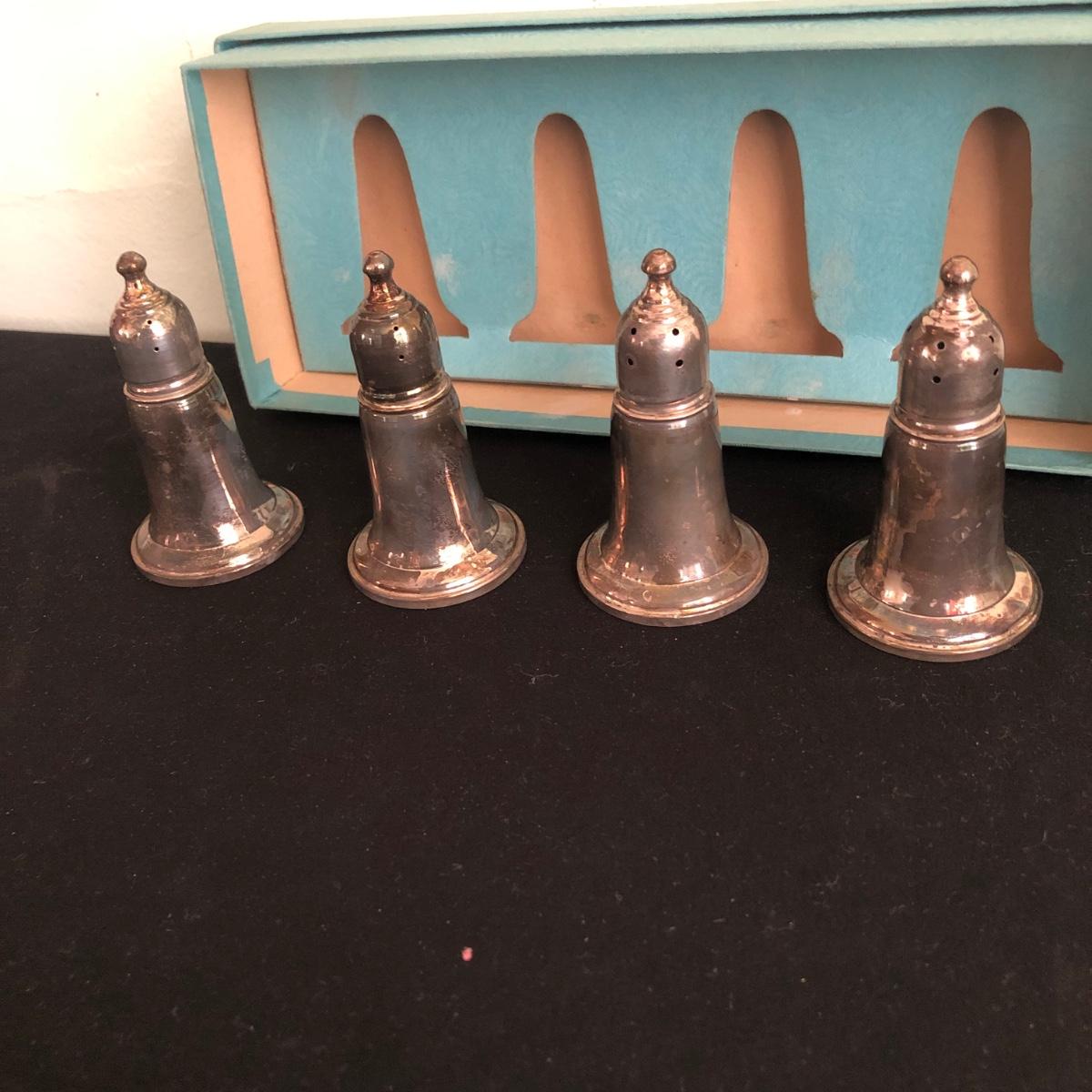 This lot contains 29 pieces. The two Lovelace dishes (with three legs and a handle) measures 6” in diameter. The Gorham fleury dish measures 12” x 12” and has Gorham YC623 on the back. The cup is Newport Sterling 1626 and the rattle is Lunt Sterling 1180. The salt and pepper shakers are TWR Sterling and stand over 4.5” tall. The serving knife and fork are marked “Sterling Handles.” The gravy boat and tray are Aniston SP. The four salt & pepper shakers in a box are by Empire Silver Co. And lastly, the eight candle stick holders are sterling weighted. There are also five sterling spoons. Shipping Available.