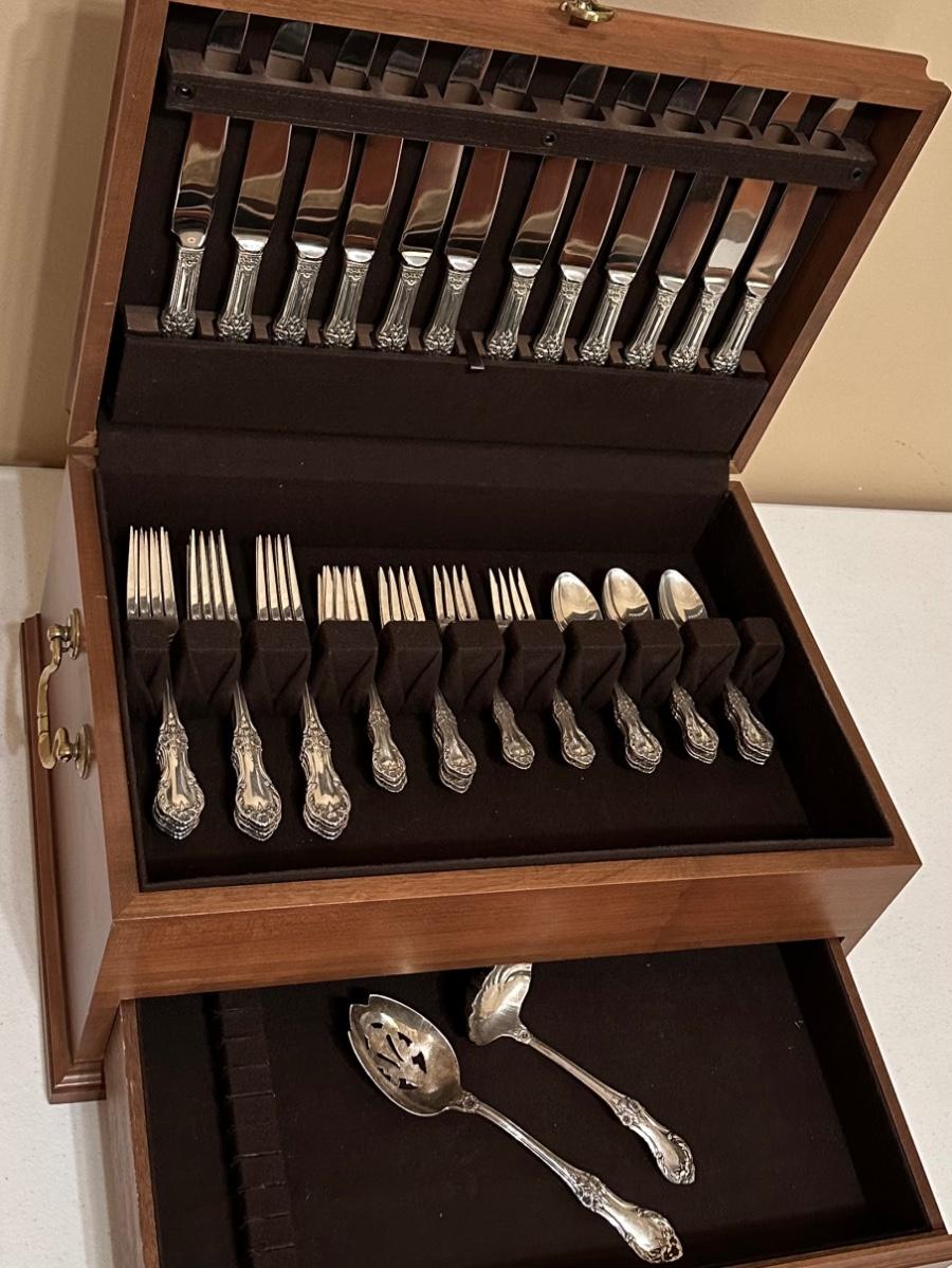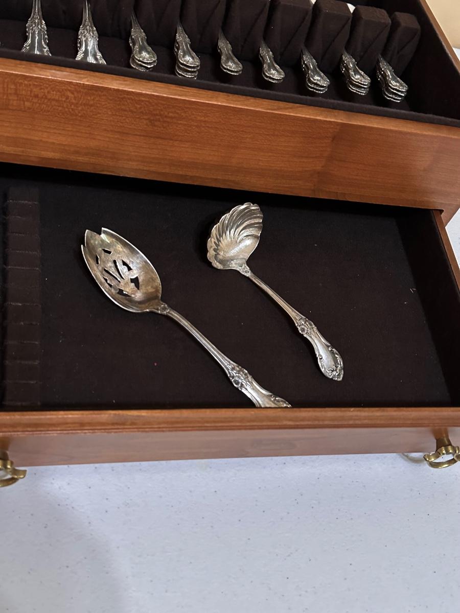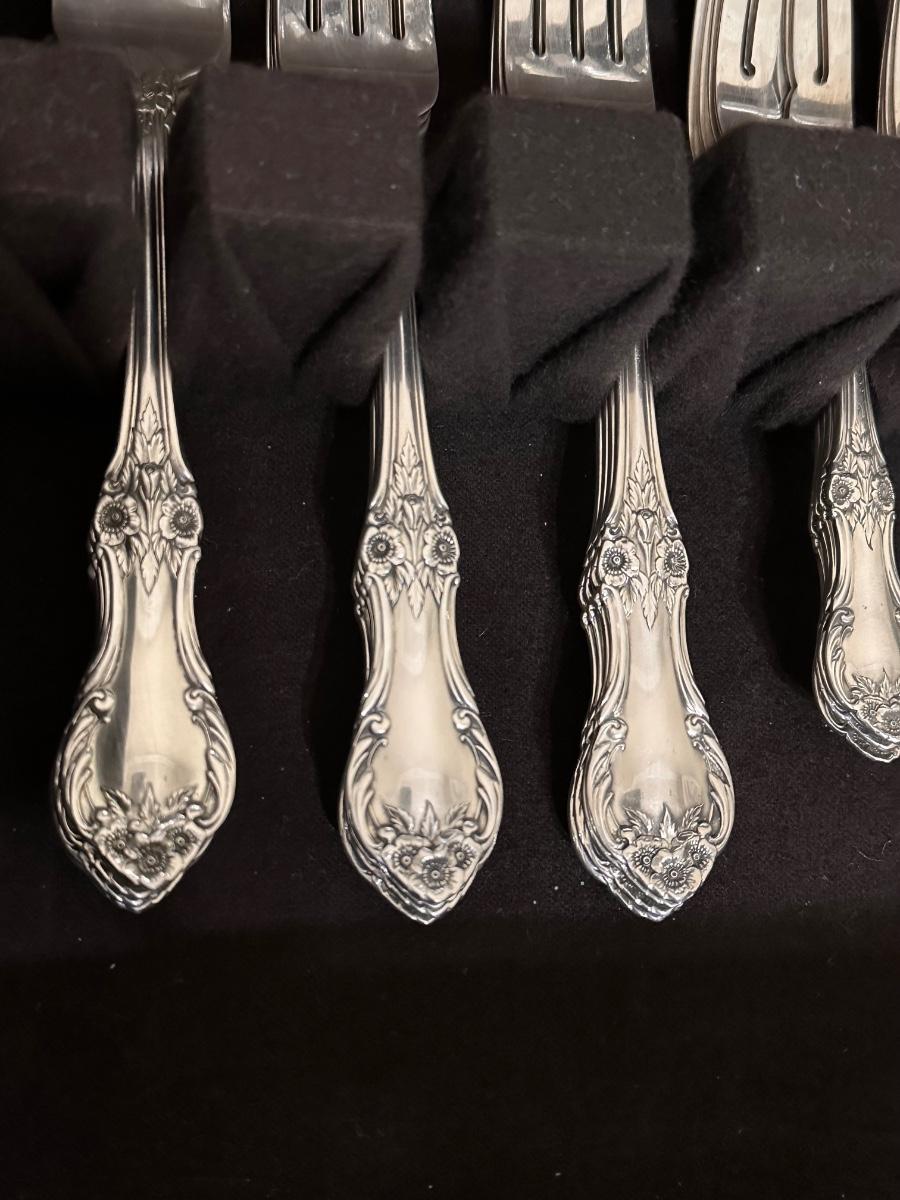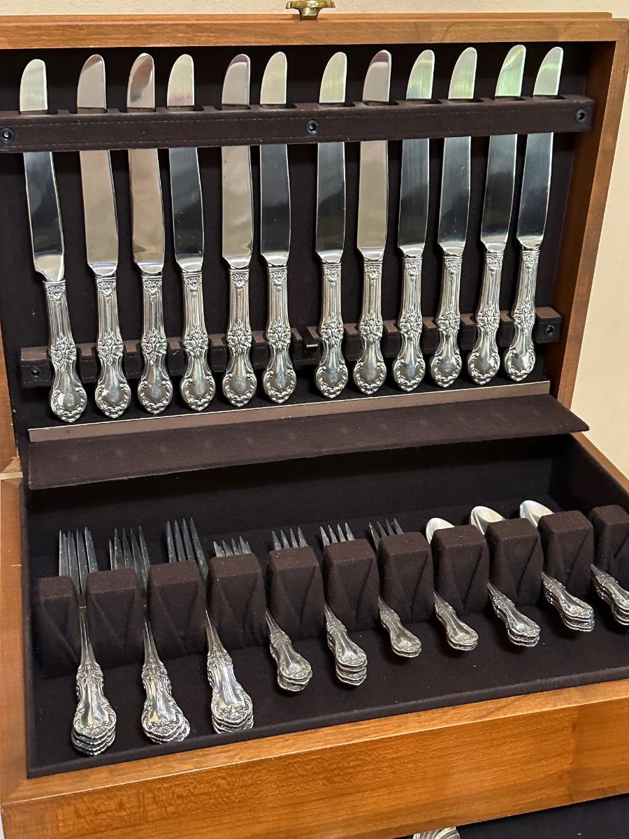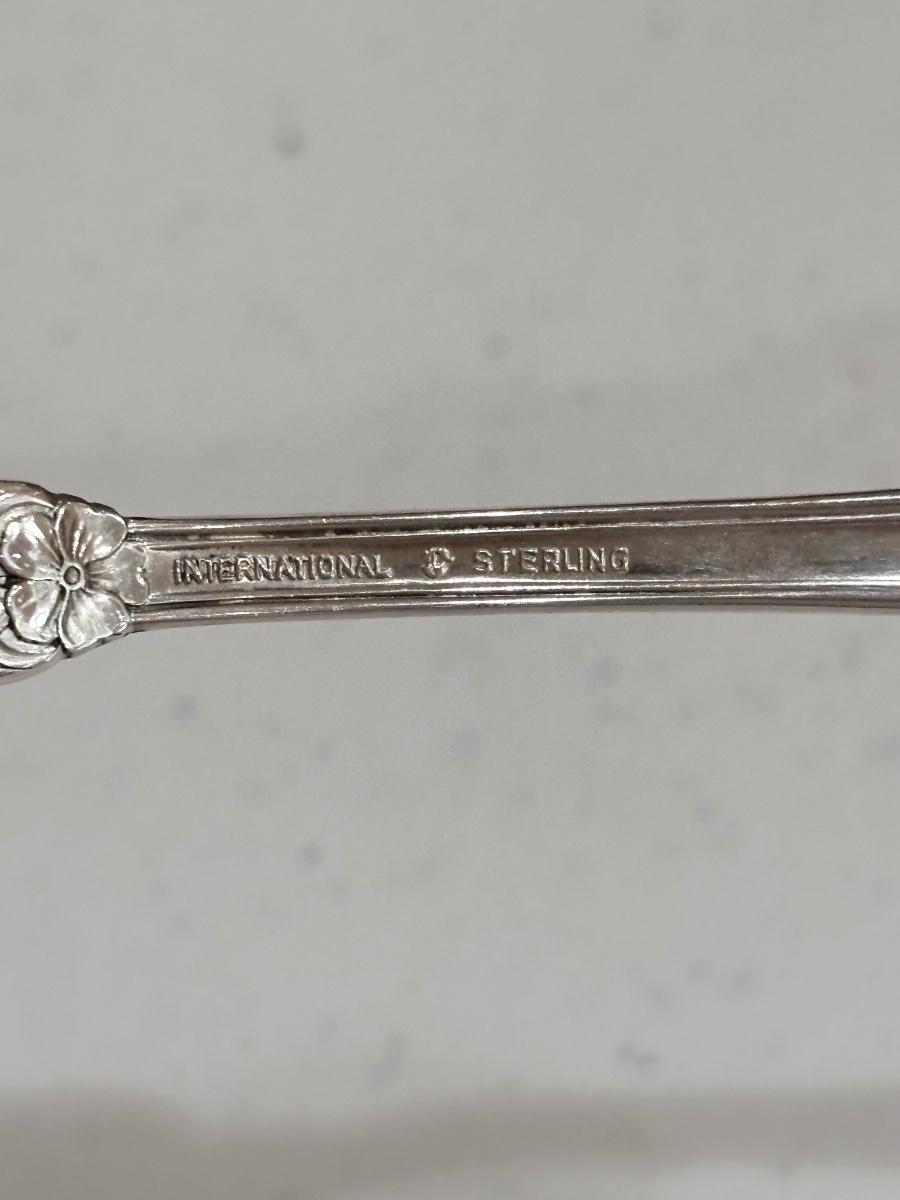 International Sterling ~50 Piece set includes: ~ 12 of each, Dinner Fork, Salad Fork, Butter Knives & teaspoons ~ includes serving spoon and ladle ~ 1644 grams (knives were not weighed)