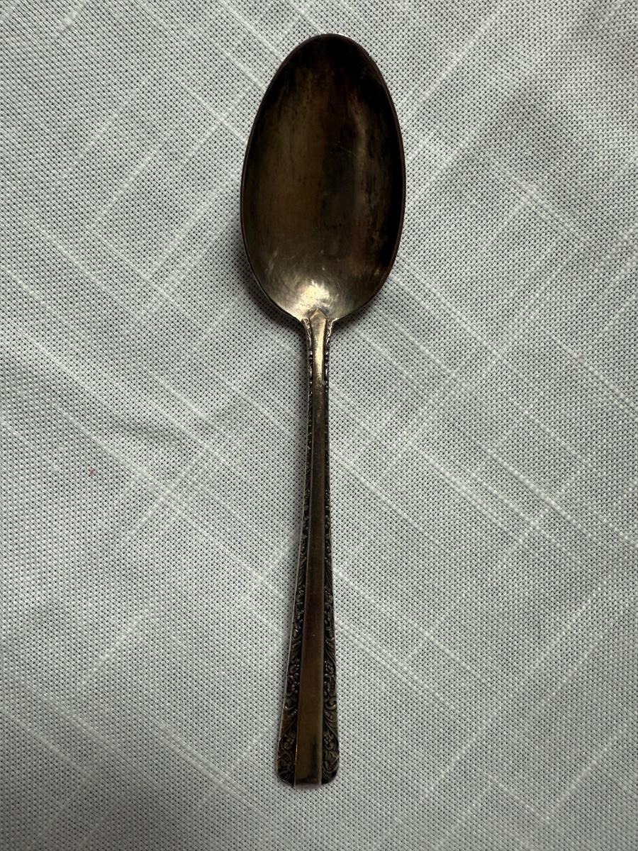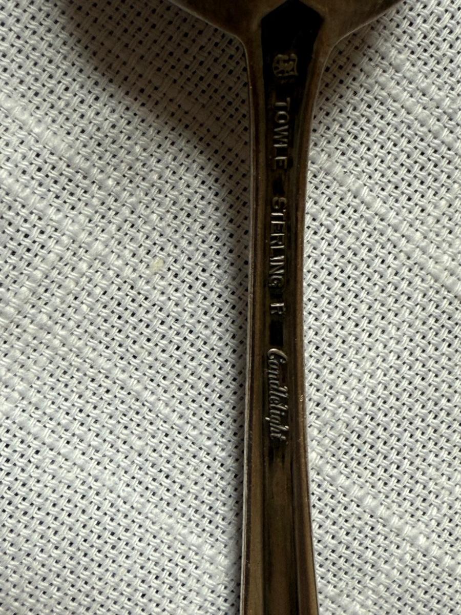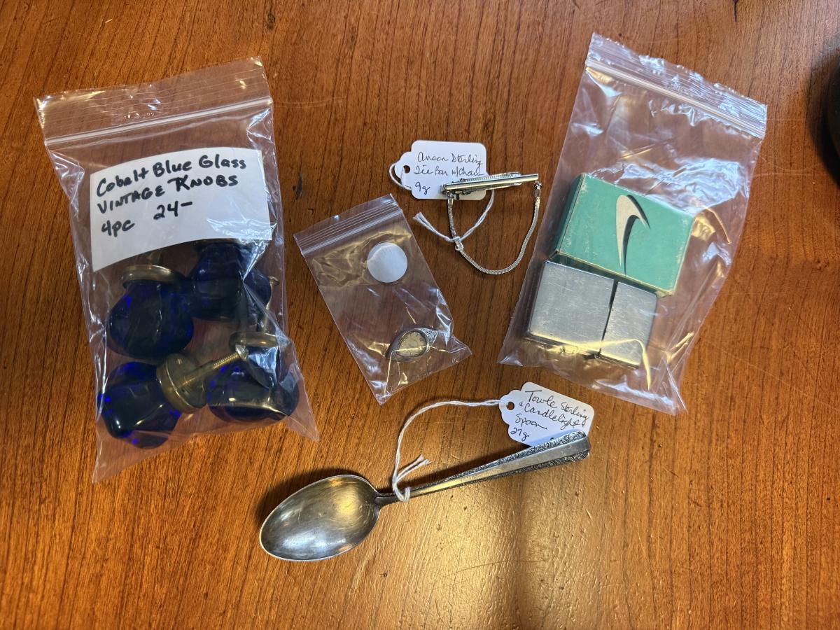Sterling spoon, sterling tie bar, cobalt blue glass knobs, watch part