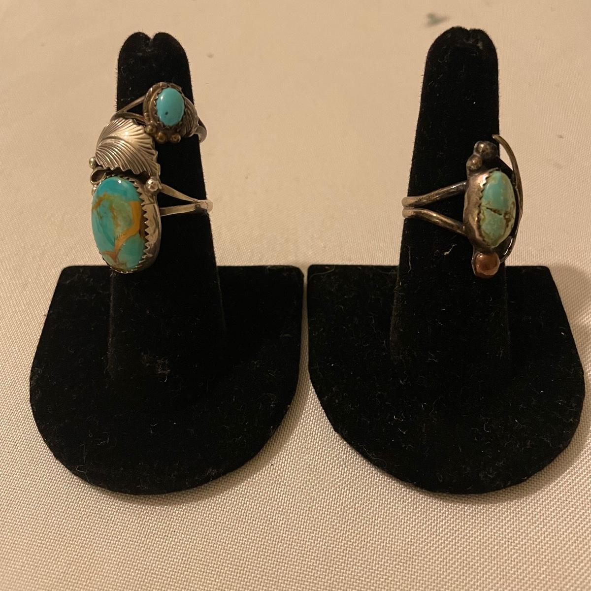 Three rings are included here, two are marked Sterling, the third has no mark. All have turquoise stones (no guarantees that they are real turquoise). See images for sizes, etc.