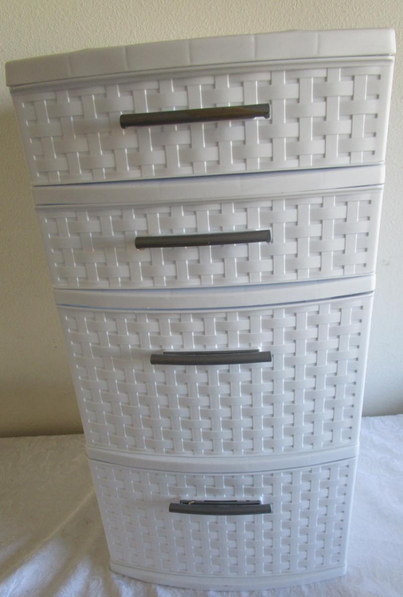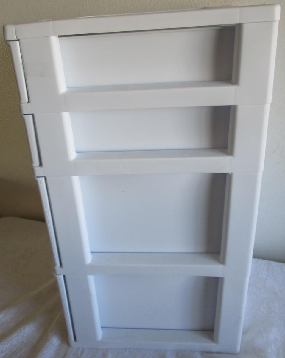 2 smaller drawers 3" x 13"and two larger drawers 7"x 13", White with gray handles; 13" x 12.5"x24"
