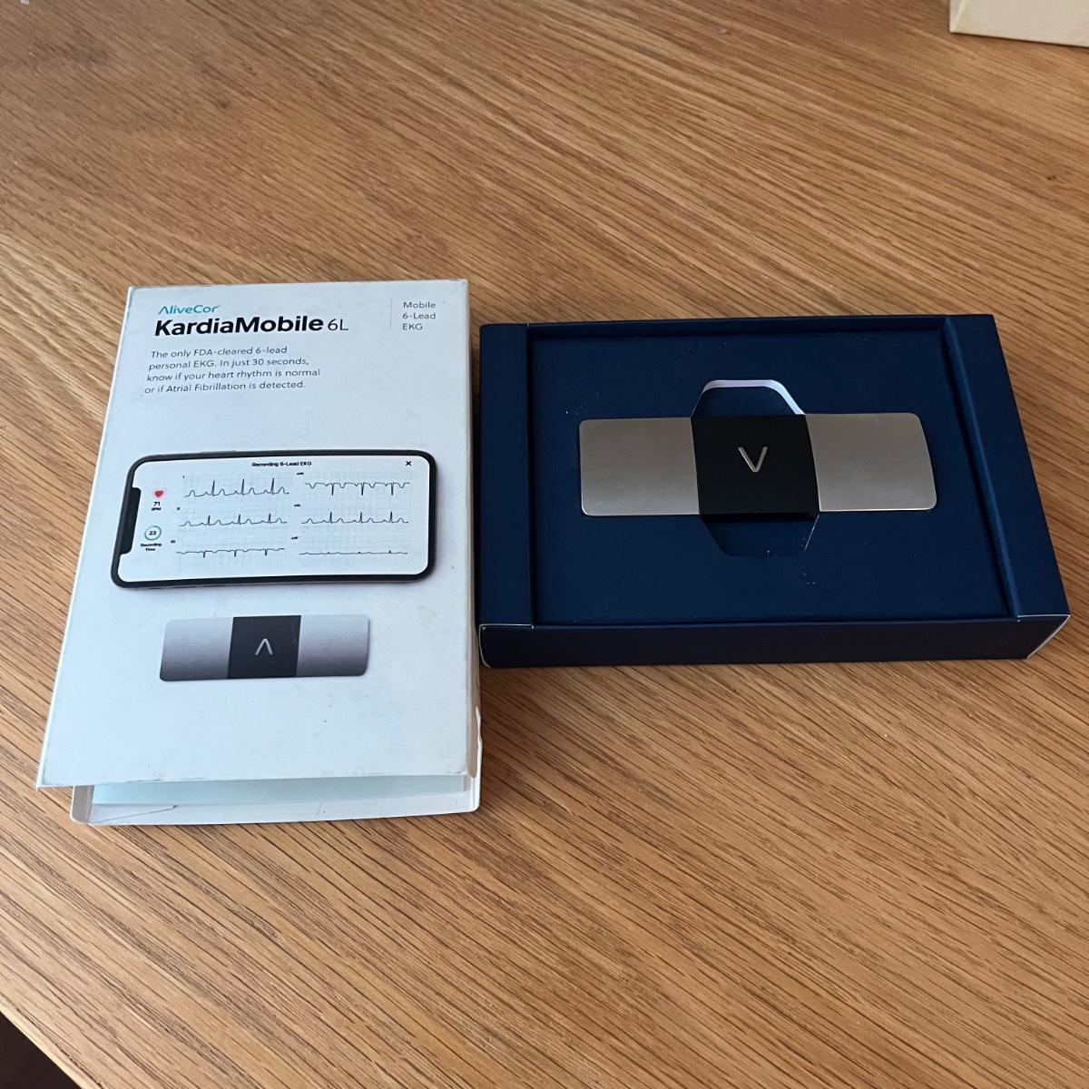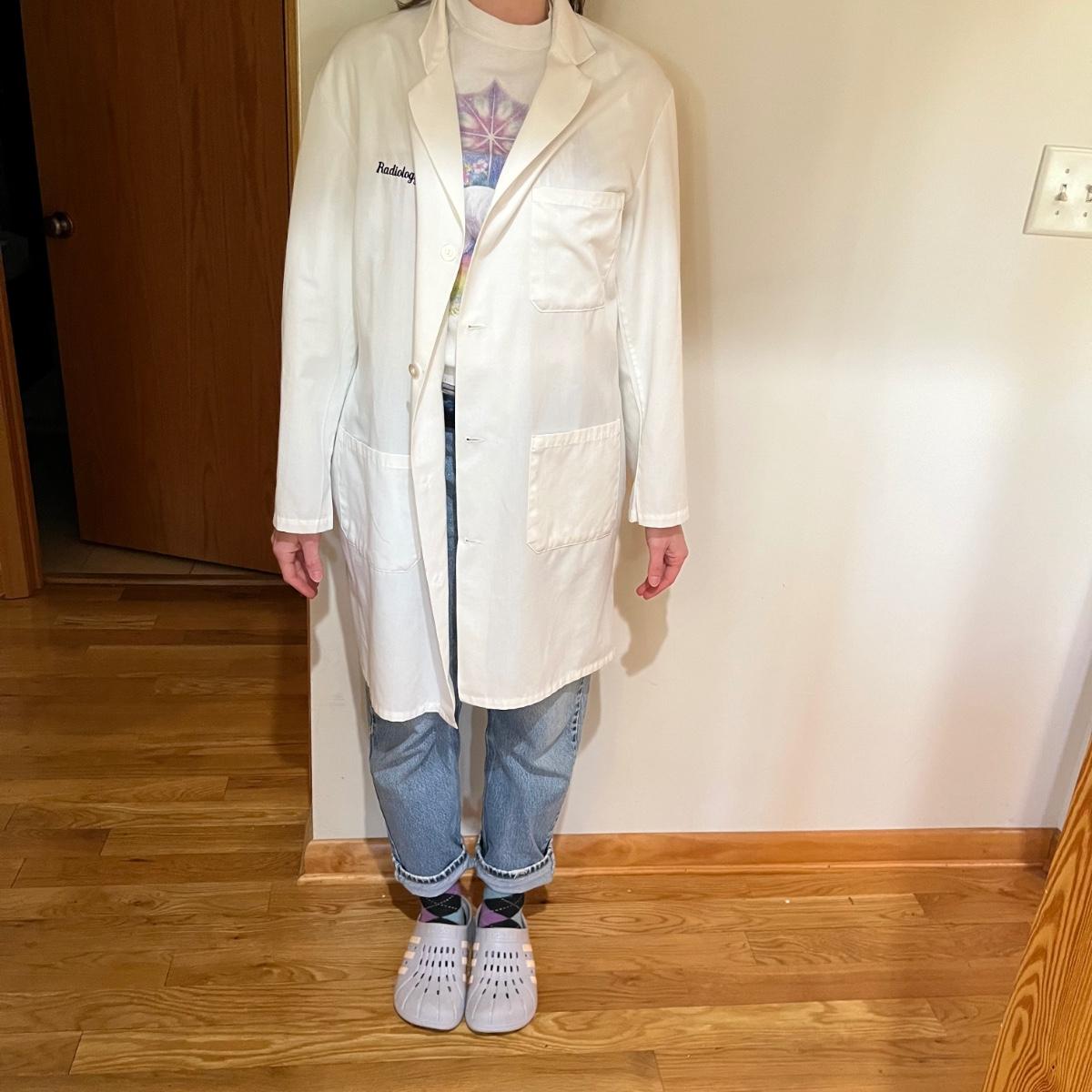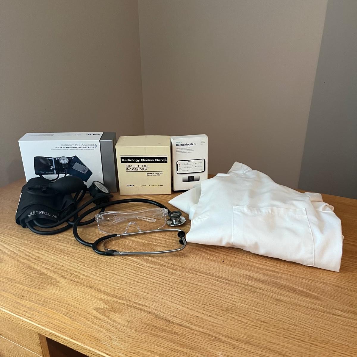 Lot includes a Sicoa stethoscope, Calibrate Sphygmomanometer, Kardiamobile EKG, Radiology review cards and a white coat. Size medium.
