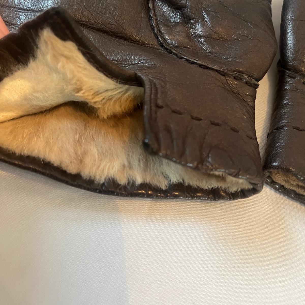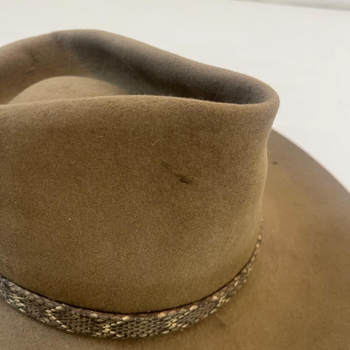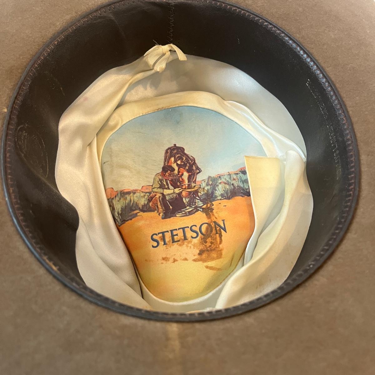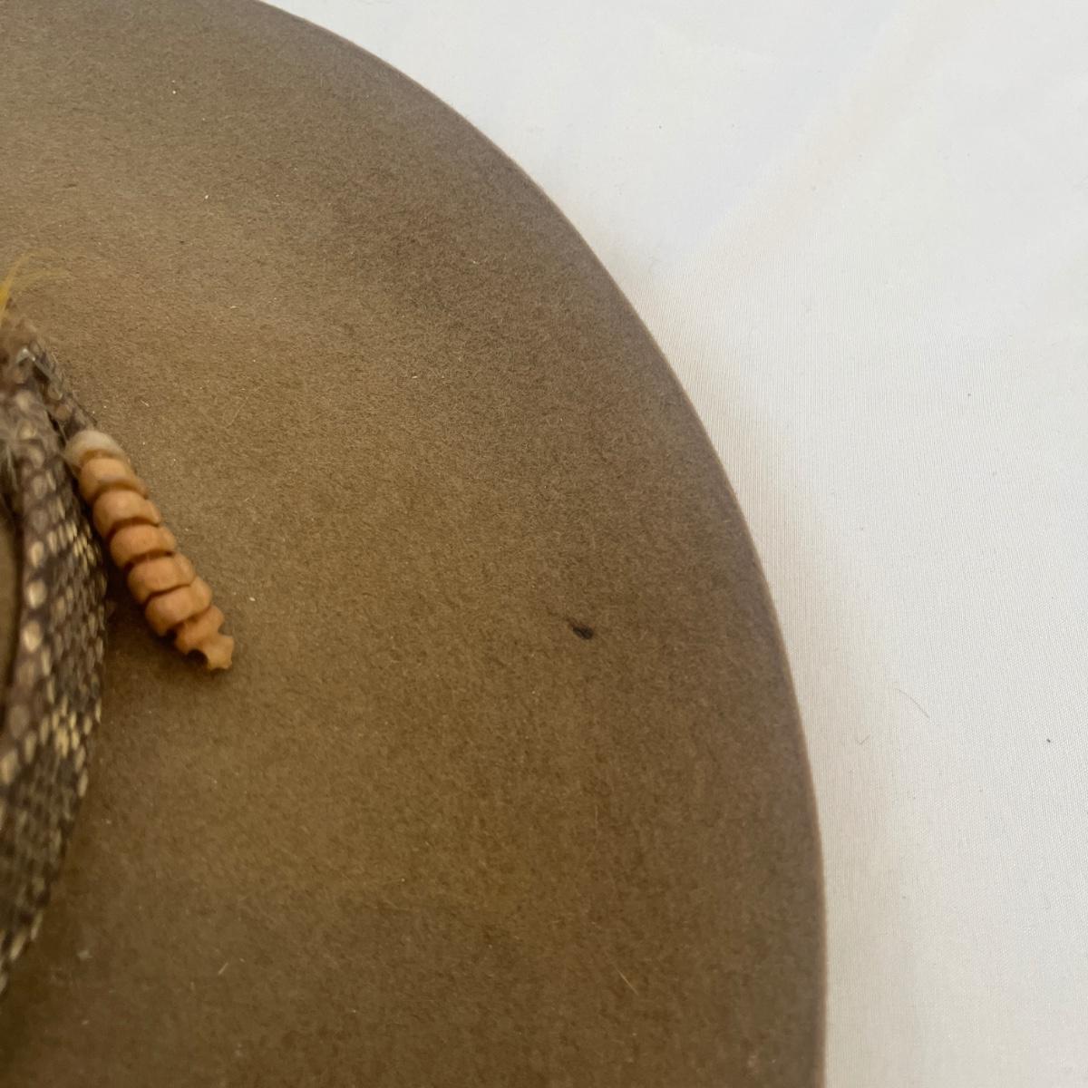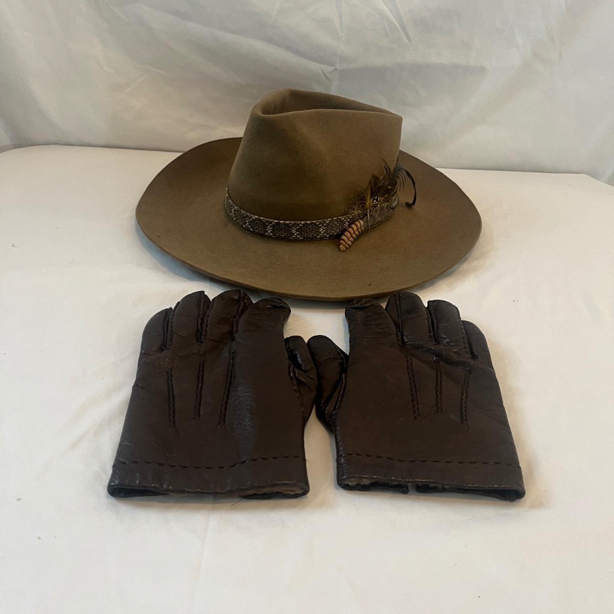 Lot includes a Stetson XXXX felt hat with what appears to be a rattlesnake hat band with rattle. Also includes a pair of what appear to be fur-lined leather gloves. Hat is a size 7 1/4 approximately. There are some slight discoloration areas on the hat, see photos for details.