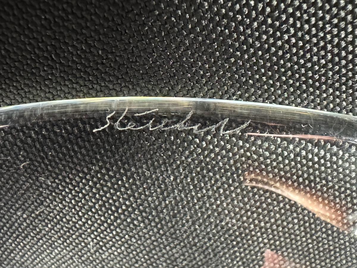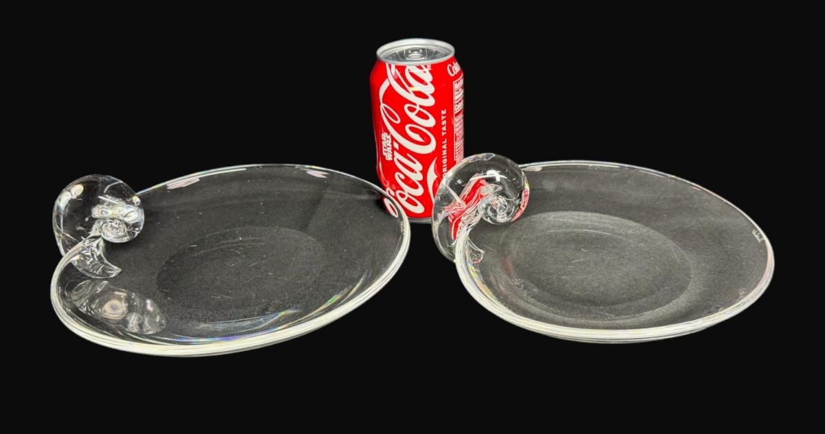 Designed with nautilus scroll snail handle. Two pieces. Both are signed. Age related wear and some scratches on base. Each measures 8.75" in diameter. [CS]