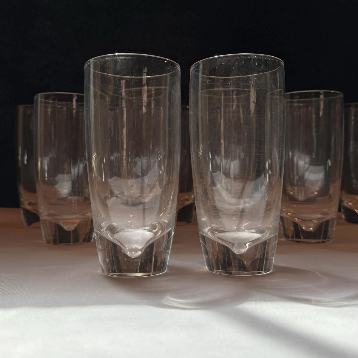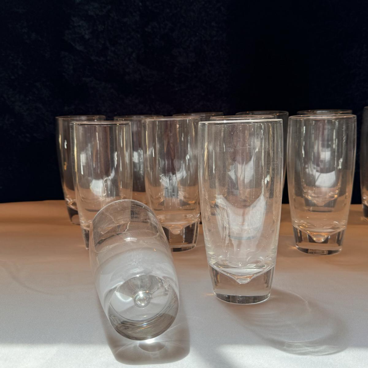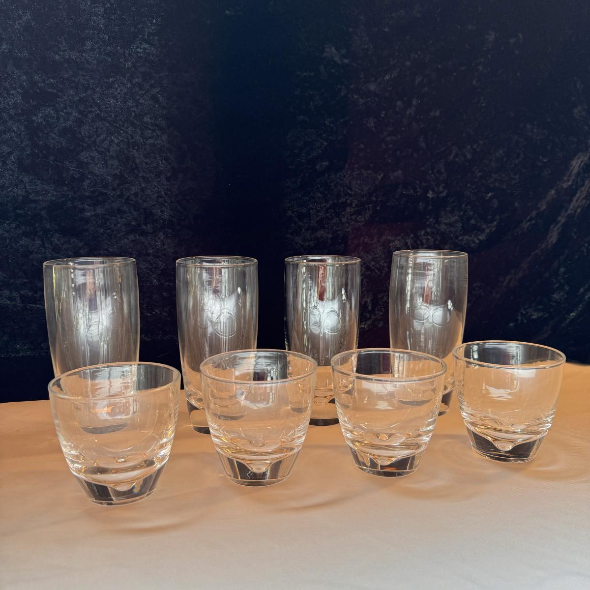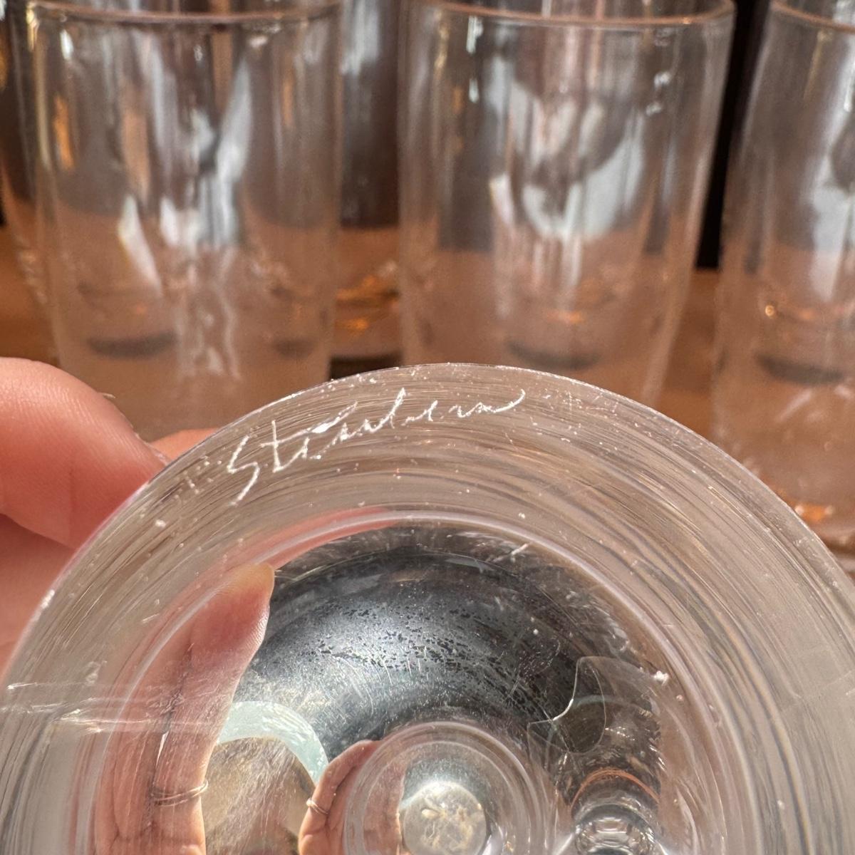 This lot includes twelve tall Steuben glasses and four shorter ones. The tall glasses measure 3” x 6.5”H and the shorter 3.5” x 3.5”H. All glasses have “Steuben” etched on the bottom. Shipping available.