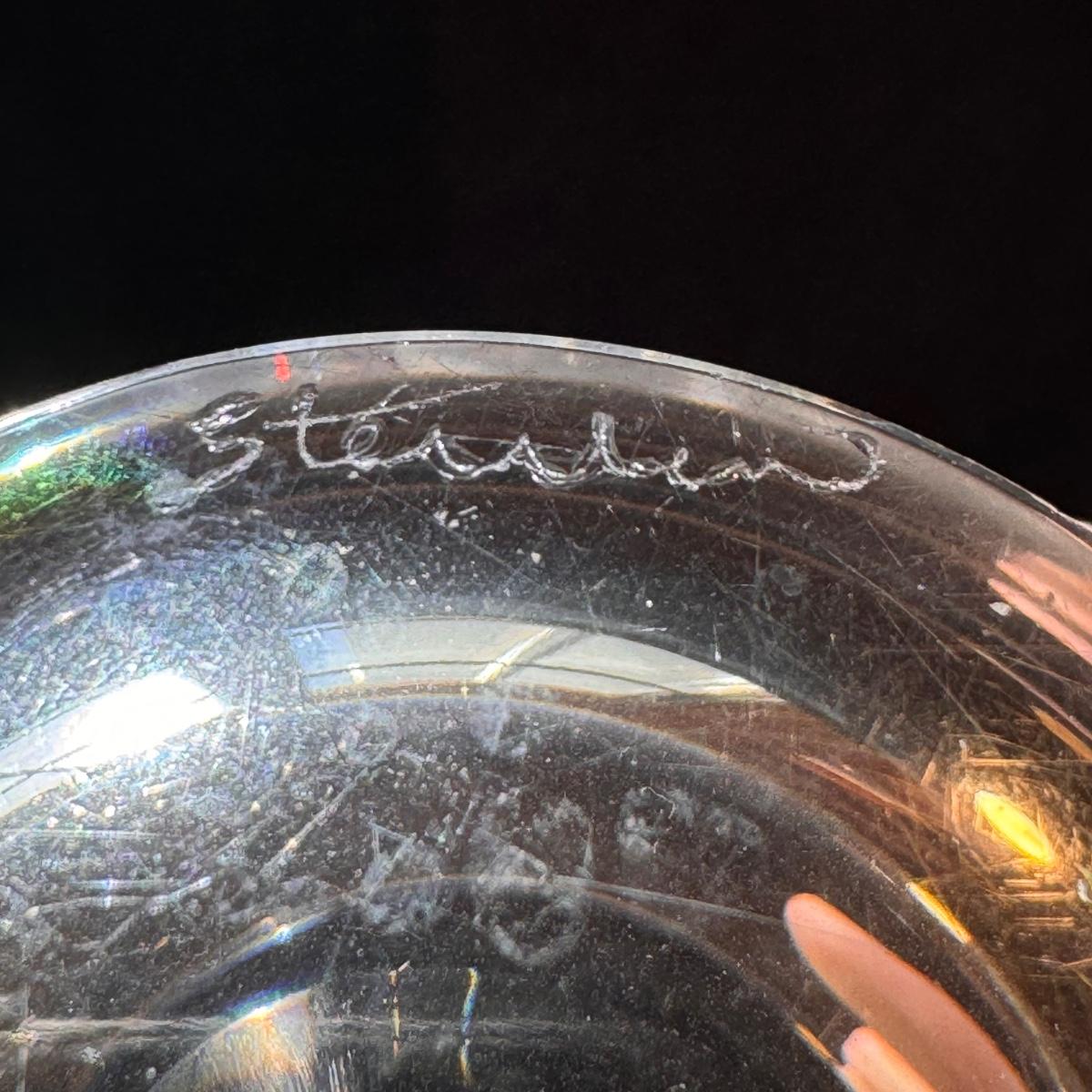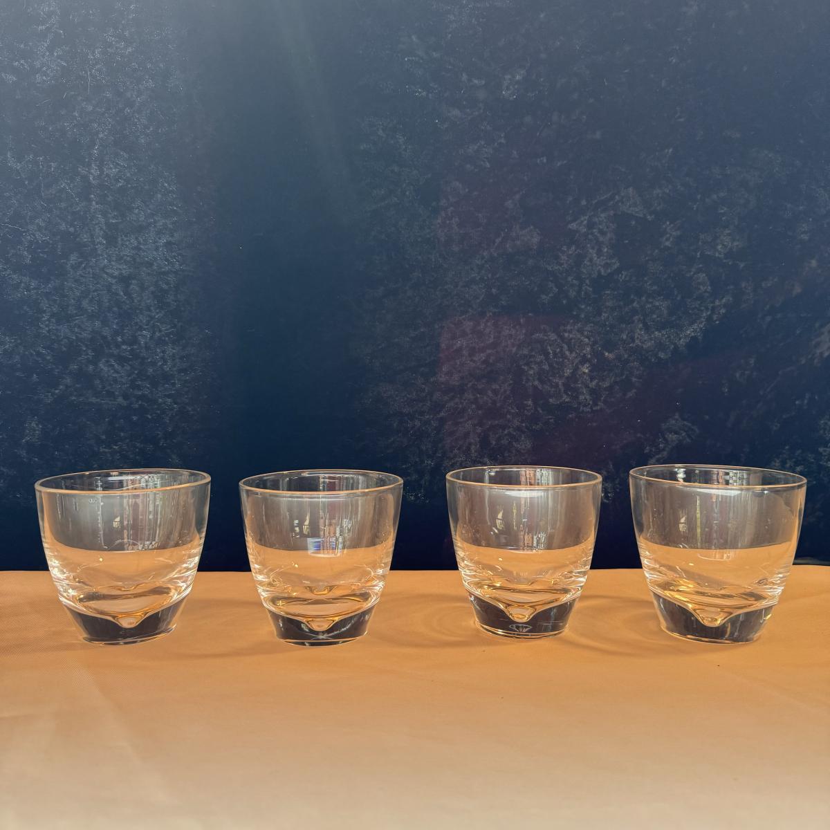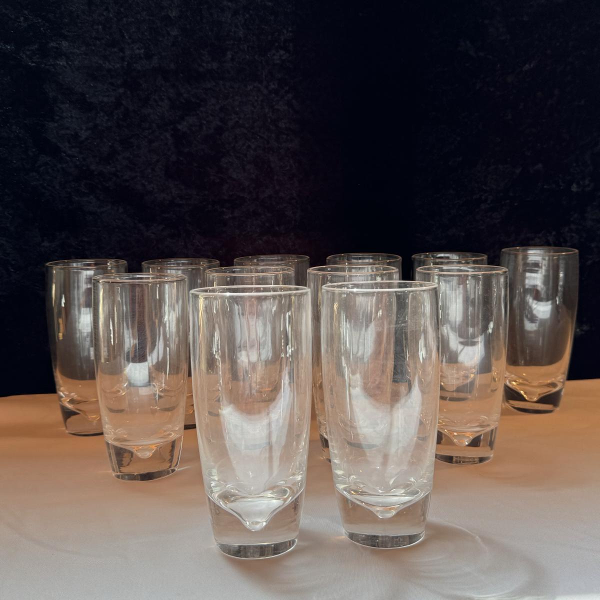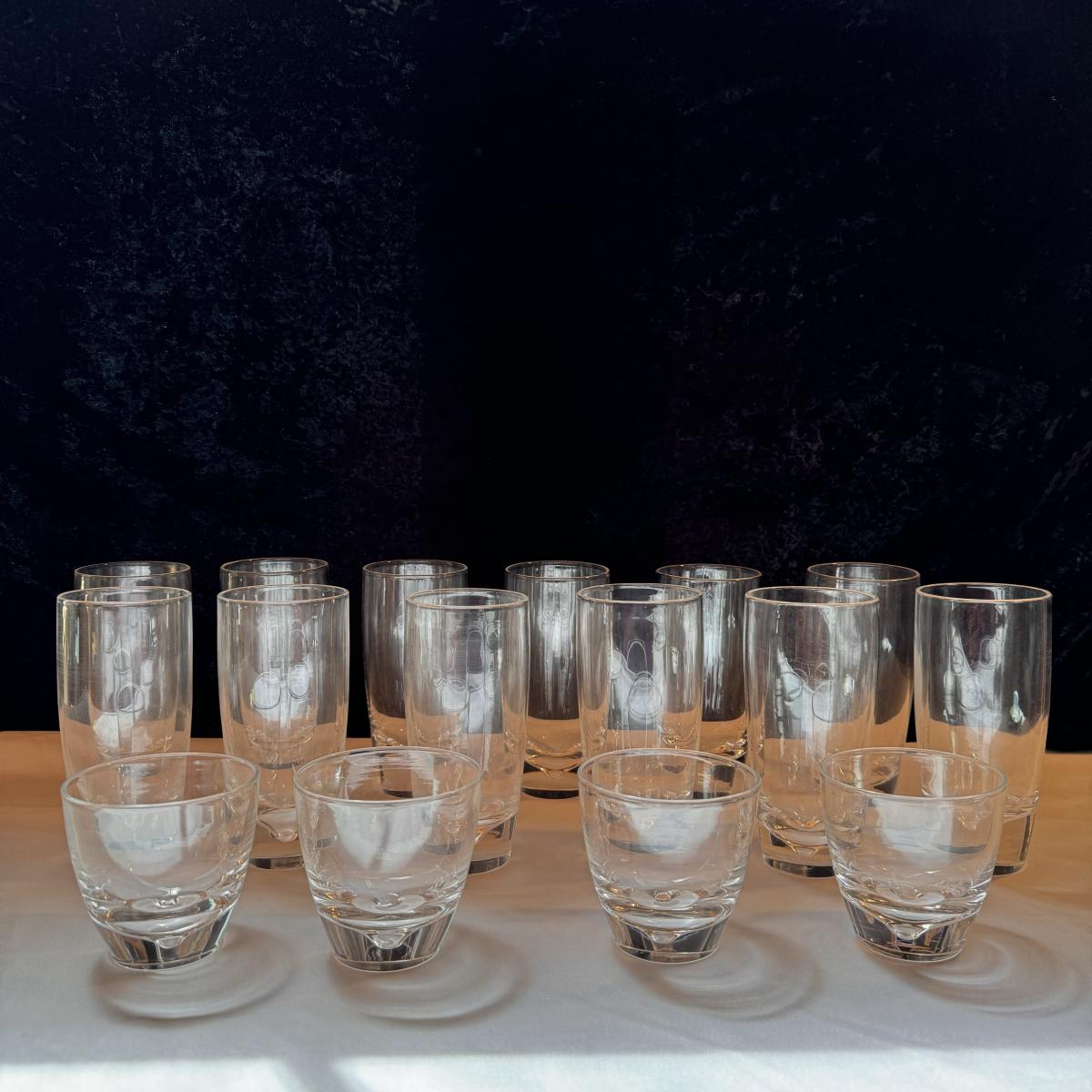 This lot includes twelve tall Steuben glasses and four shorter ones. The tall glasses measure 3” x 6.5”H and the shorter 3.5” x 3.5”H. All glasses have “Steuben” etched on the bottom. Shipping available.