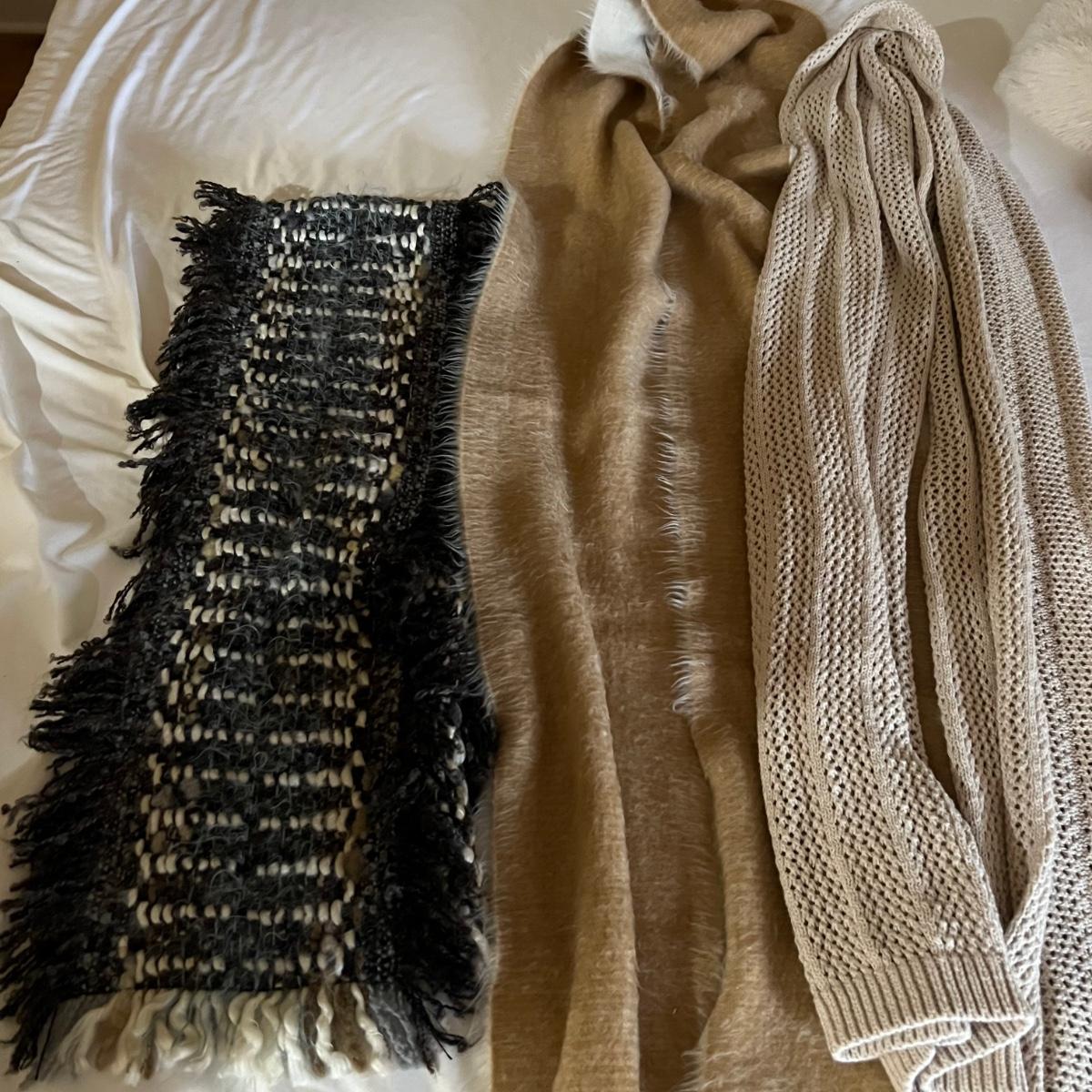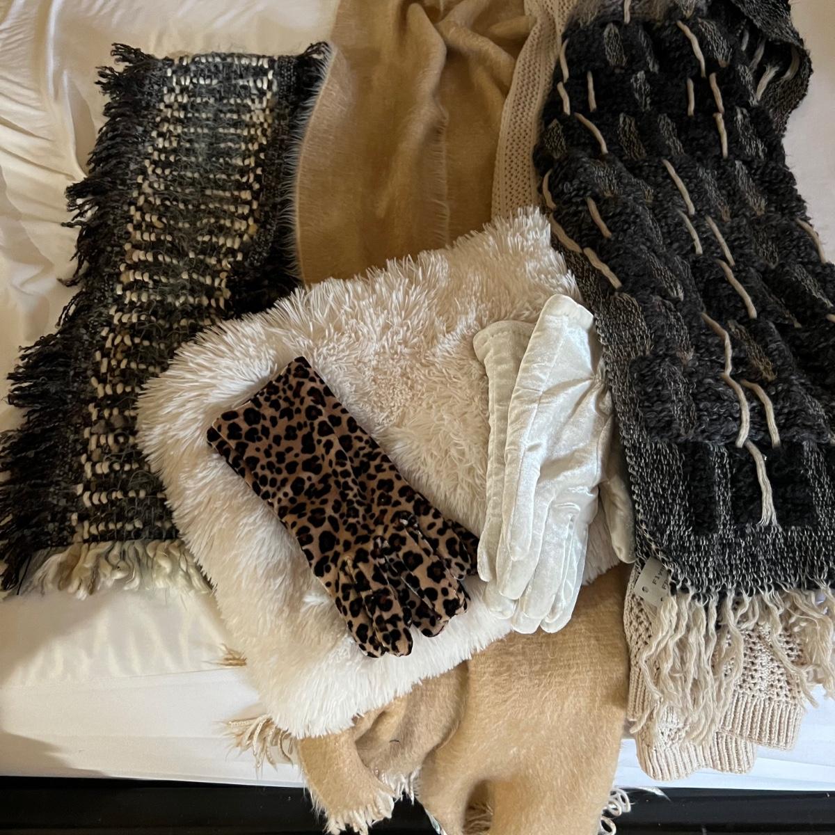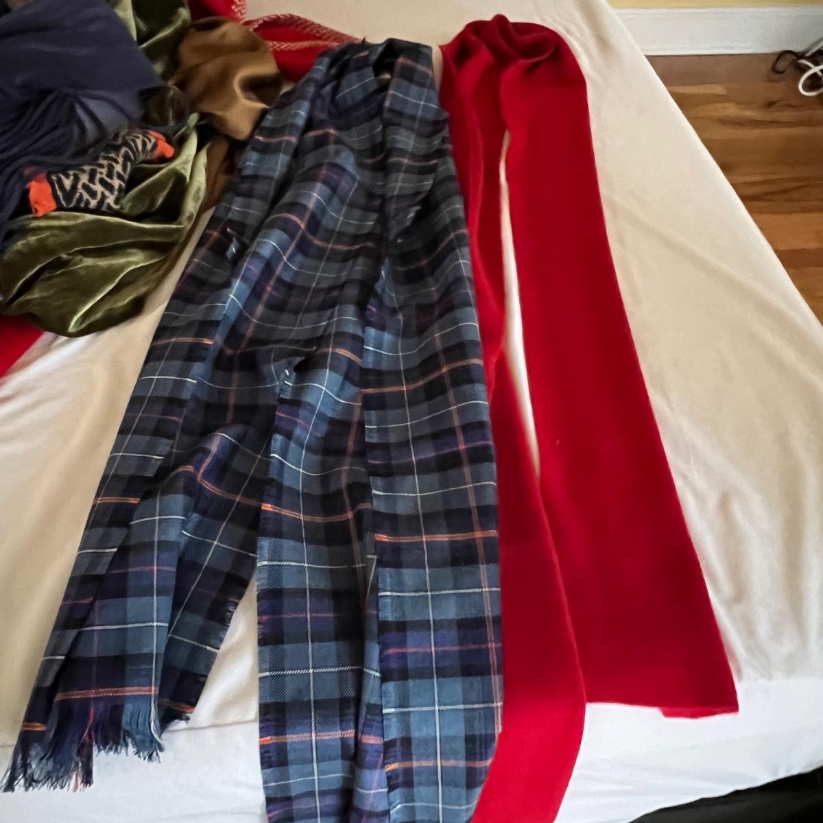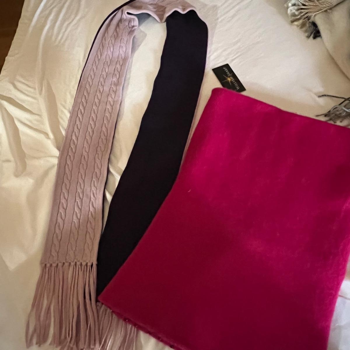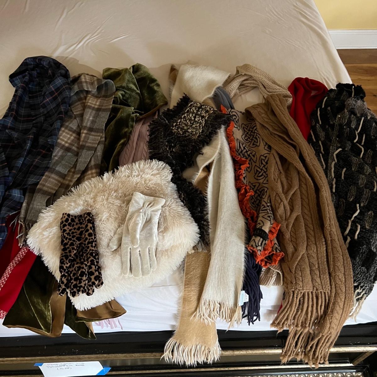 An assortment of great brand names in this lot of eleven scarves that includes a couple that are cashmere and some still have tags on. Any labels found are in photos. Two pairs of soft warm gloves included that have no size but fit medium to large. The plaid scarf has one small hole.