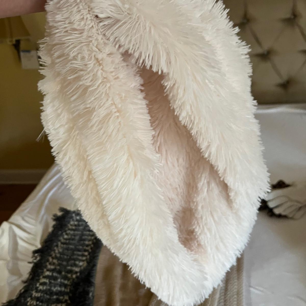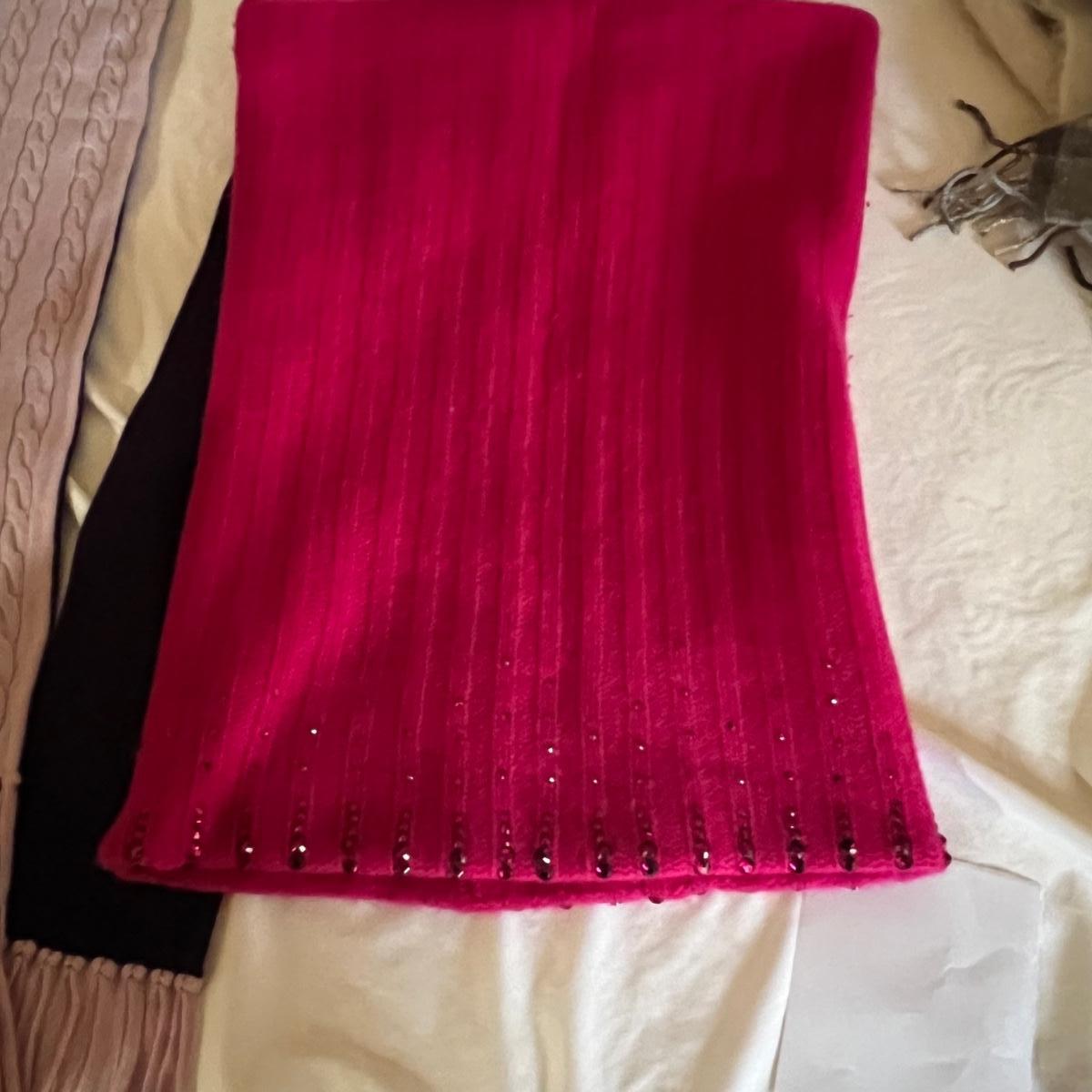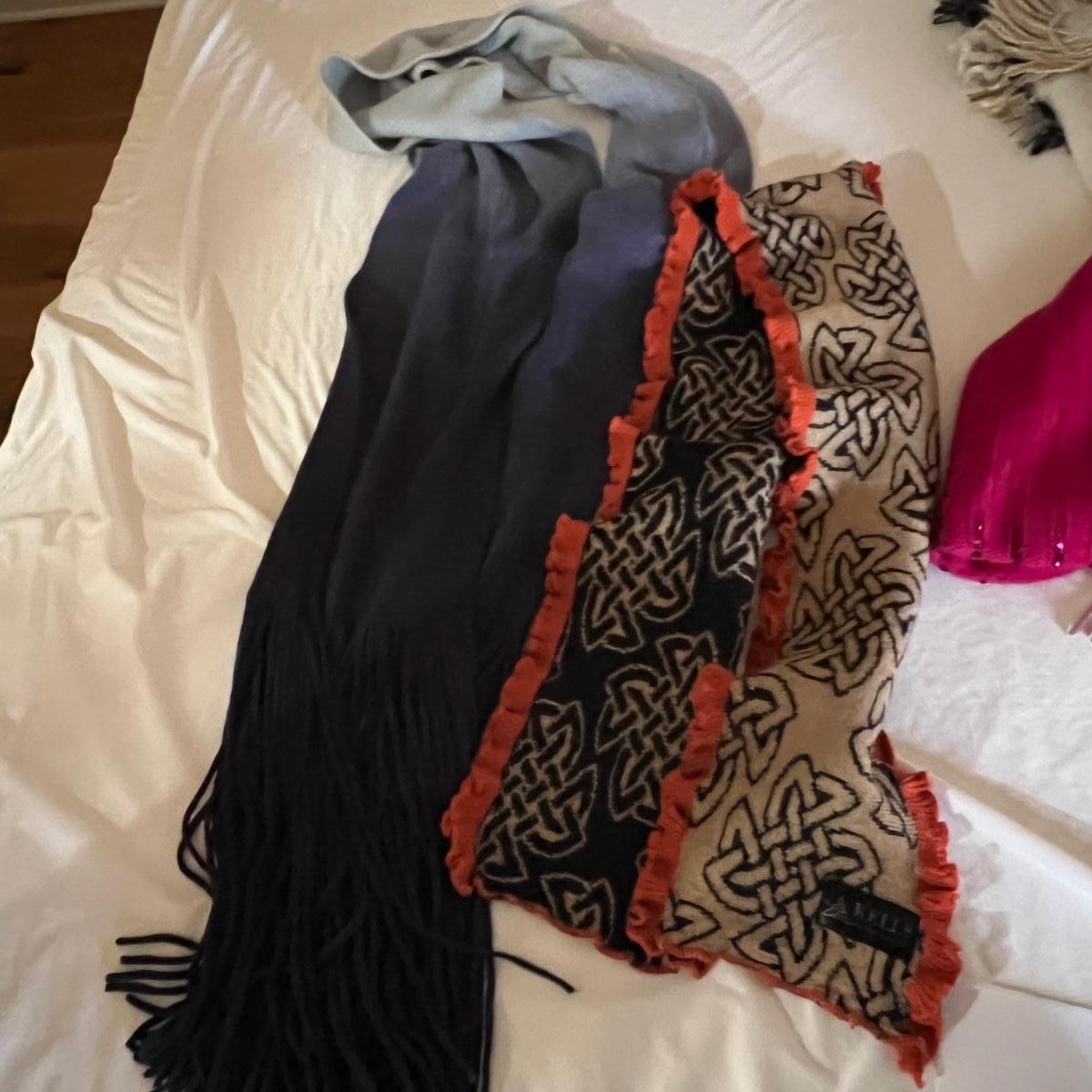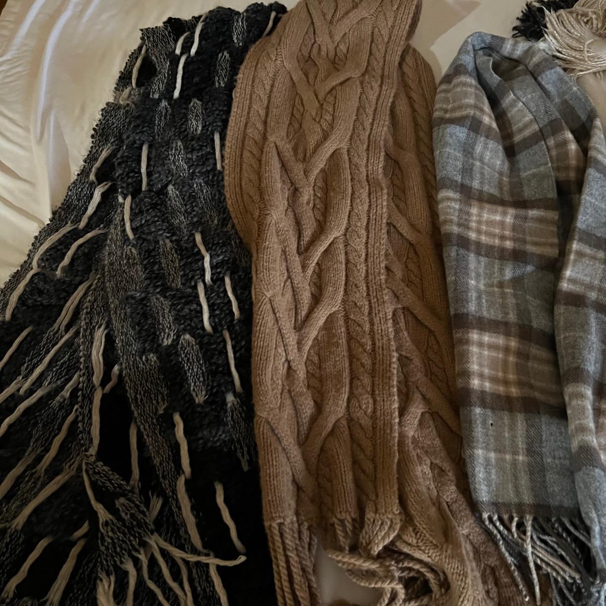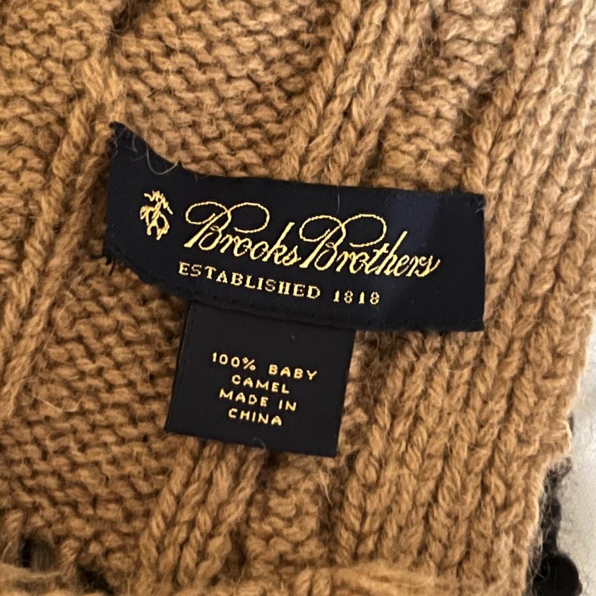 An assortment of great brand names in this lot of eleven scarves that includes a couple that are cashmere and some still have tags on. Any labels found are in photos. Two pairs of soft warm gloves included that have no size but fit medium to large. The plaid scarf has one small hole.