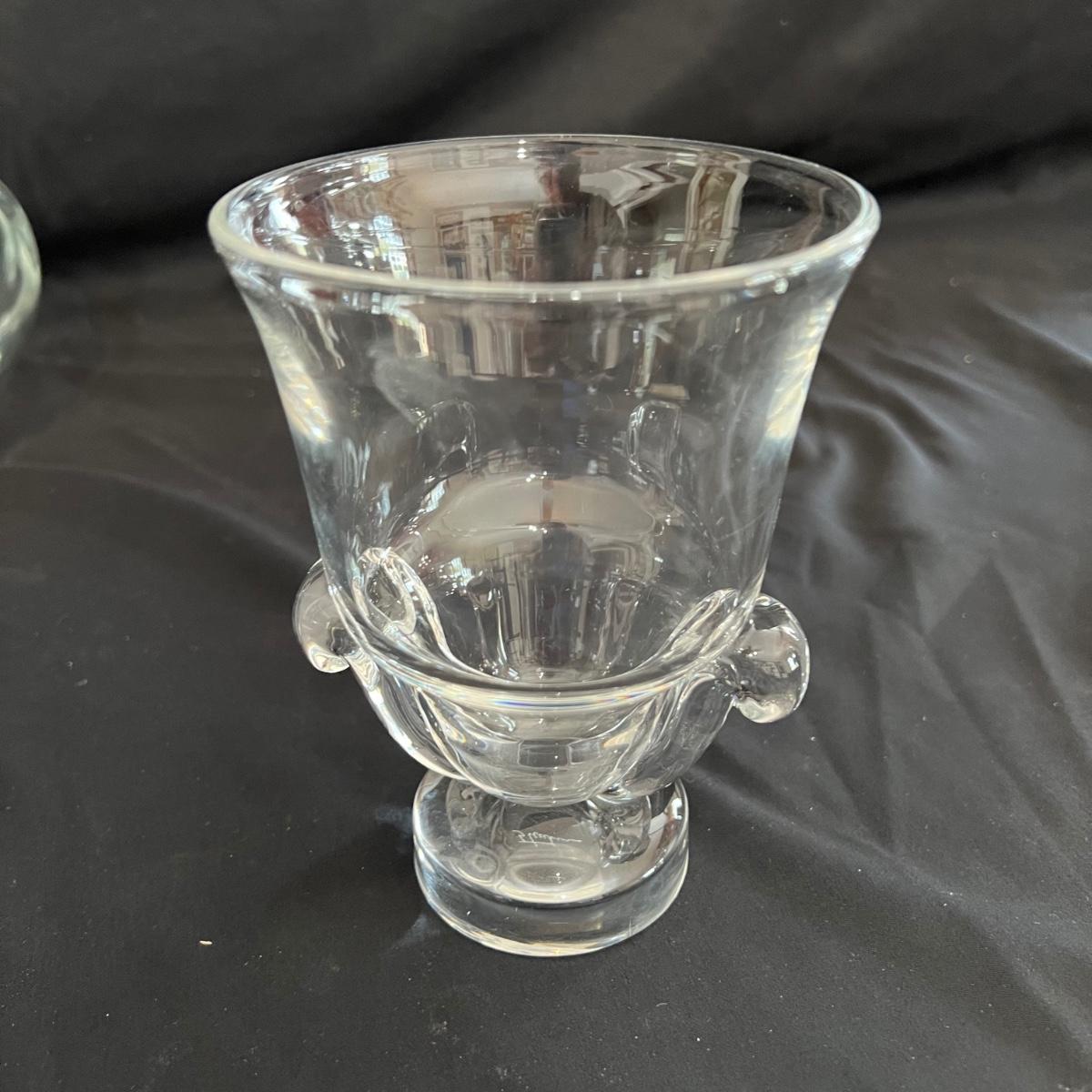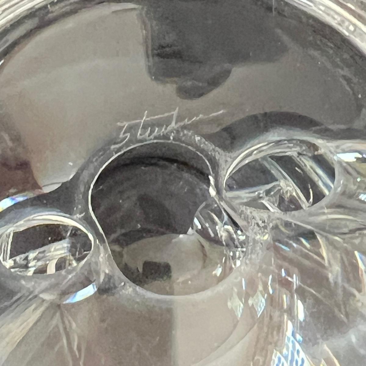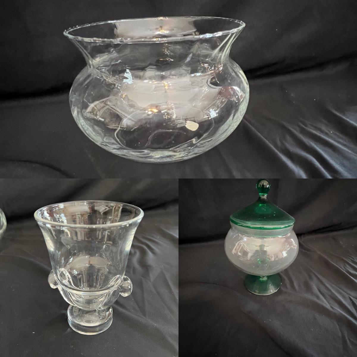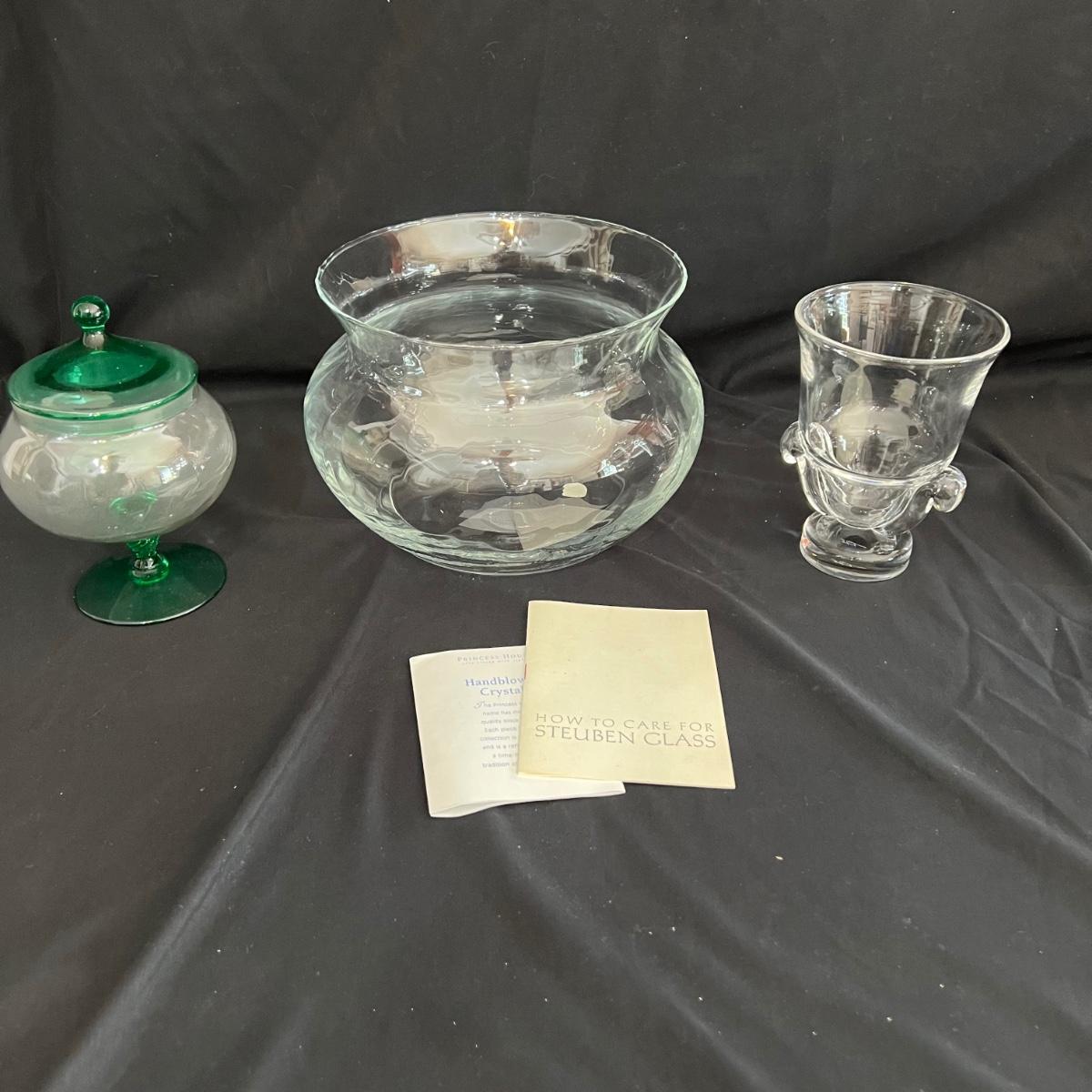 Three pieces of glass decor. One large bowl is Princess House and measures approximately 8”D x 6.25”H. The Steuben vase measures approximately 4.25”D x 6”H and the covered dish measures approximately 5”D x 7”H.