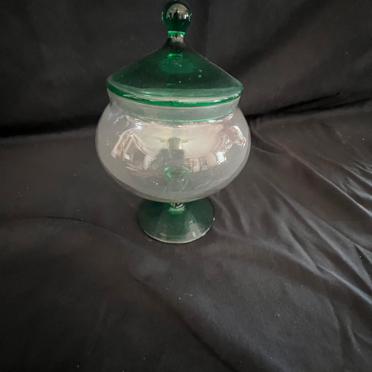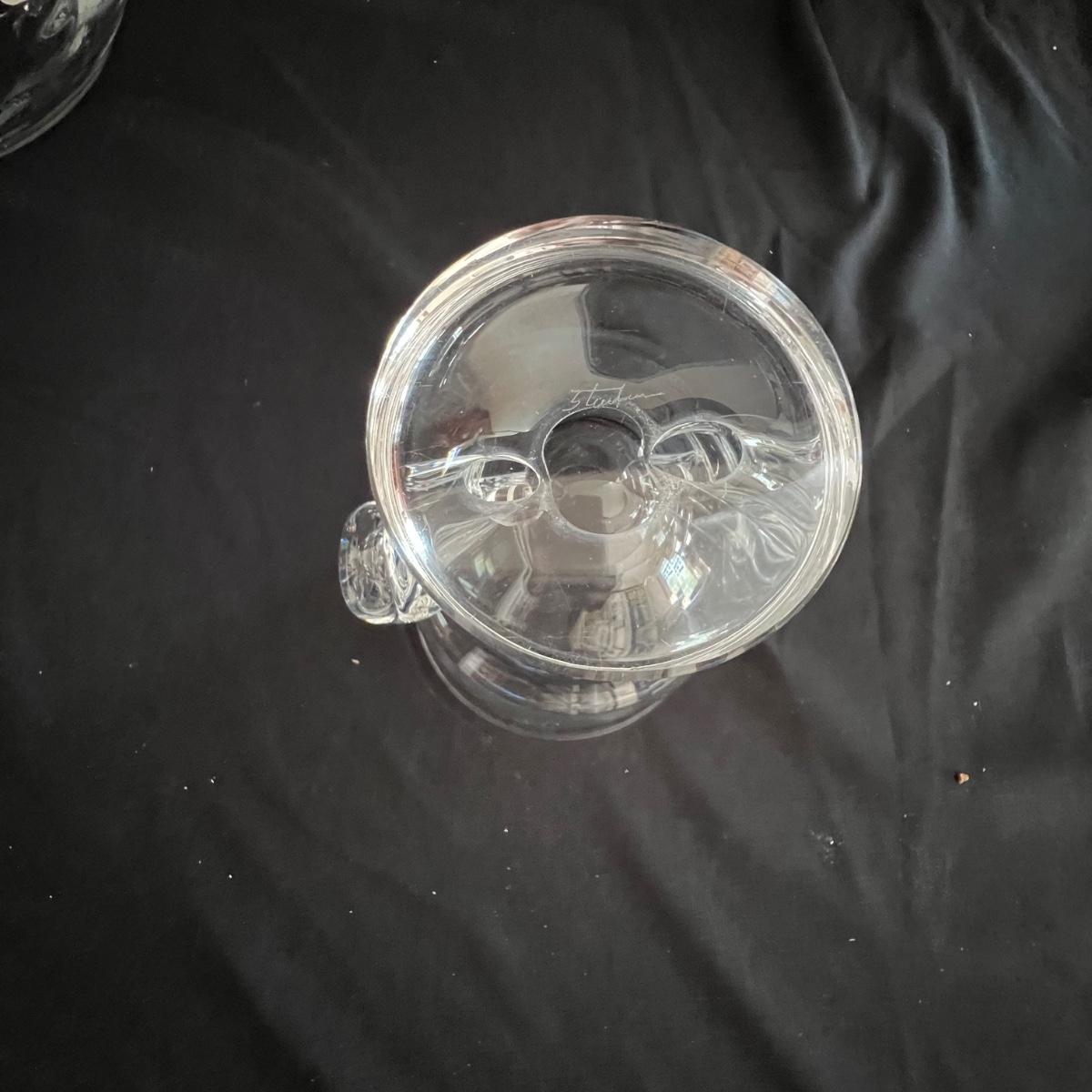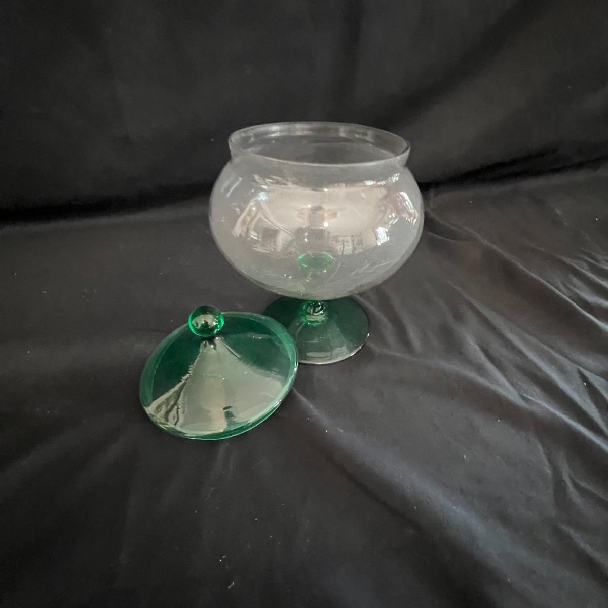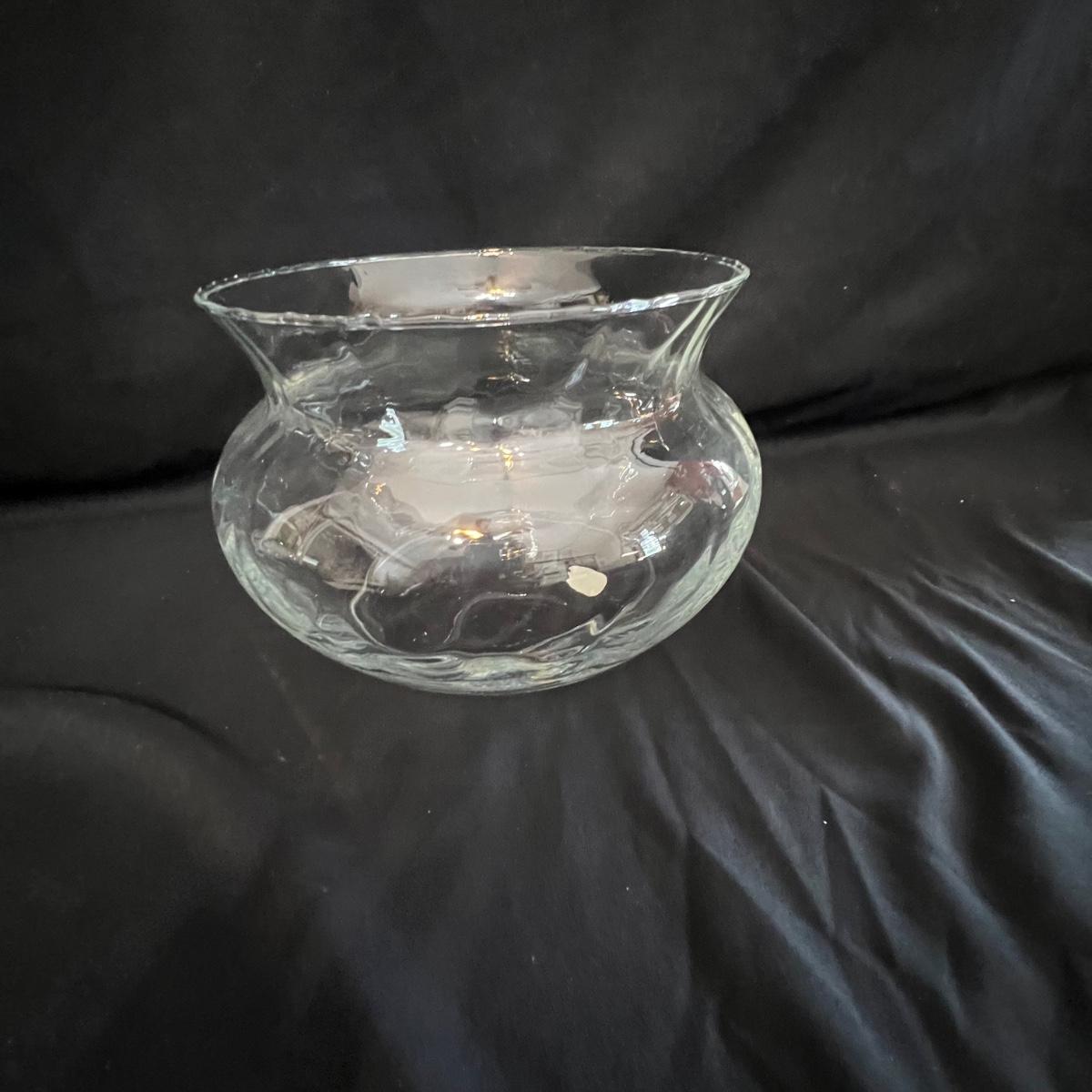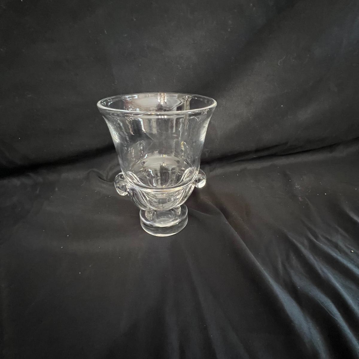 Three pieces of glass decor. One large bowl is Princess House and measures approximately 8”D x 6.25”H. The Steuben vase measures approximately 4.25”D x 6”H and the covered dish measures approximately 5”D x 7”H.