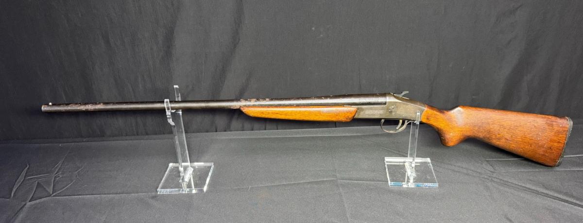 This is a single shot break-action shotgun. It shoots 2 3/4” shells. It has a nice hardwood stock and forearm. It had a production run from 1961 to 1970. Barrel length is 28 inches. Overall length is 44 inches. There is some surface rust on the barrel. No visible serial number. Not tested. [KD]