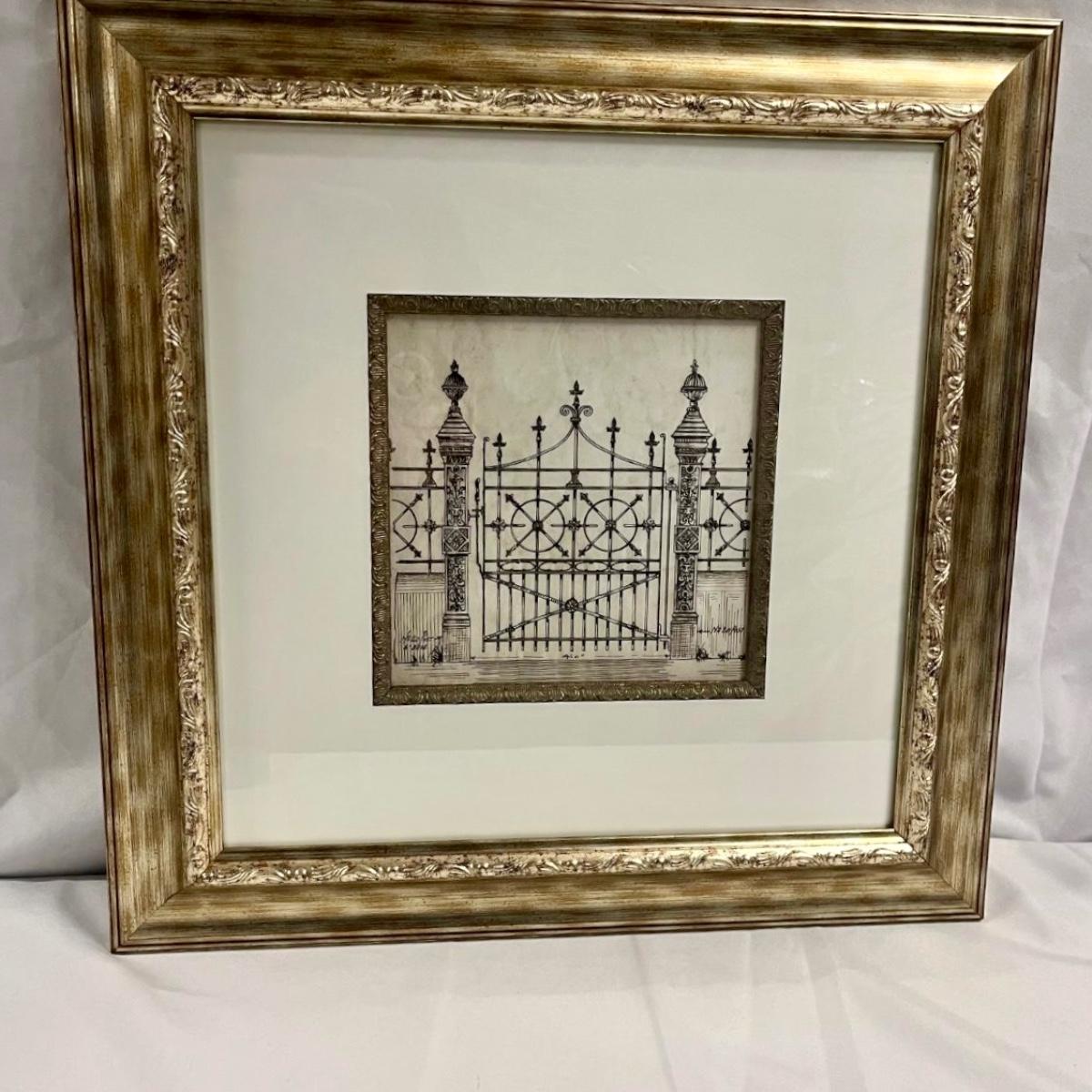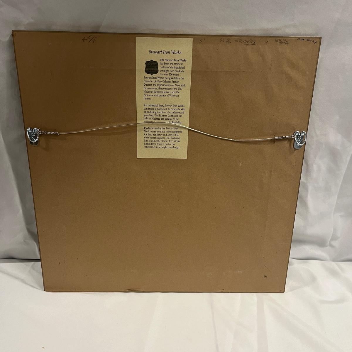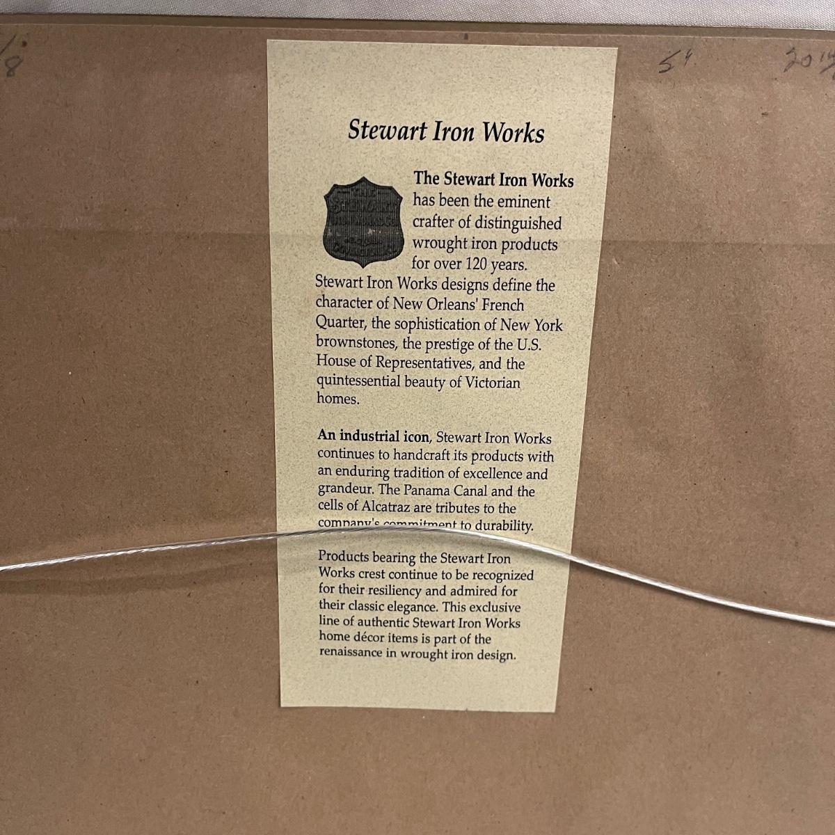 This metal framed and matted artwork is what appears to be a blueprint style of a Stewart Iron Works gate with a Fleur-De-Lis design. Frame measures 21” x 21”.