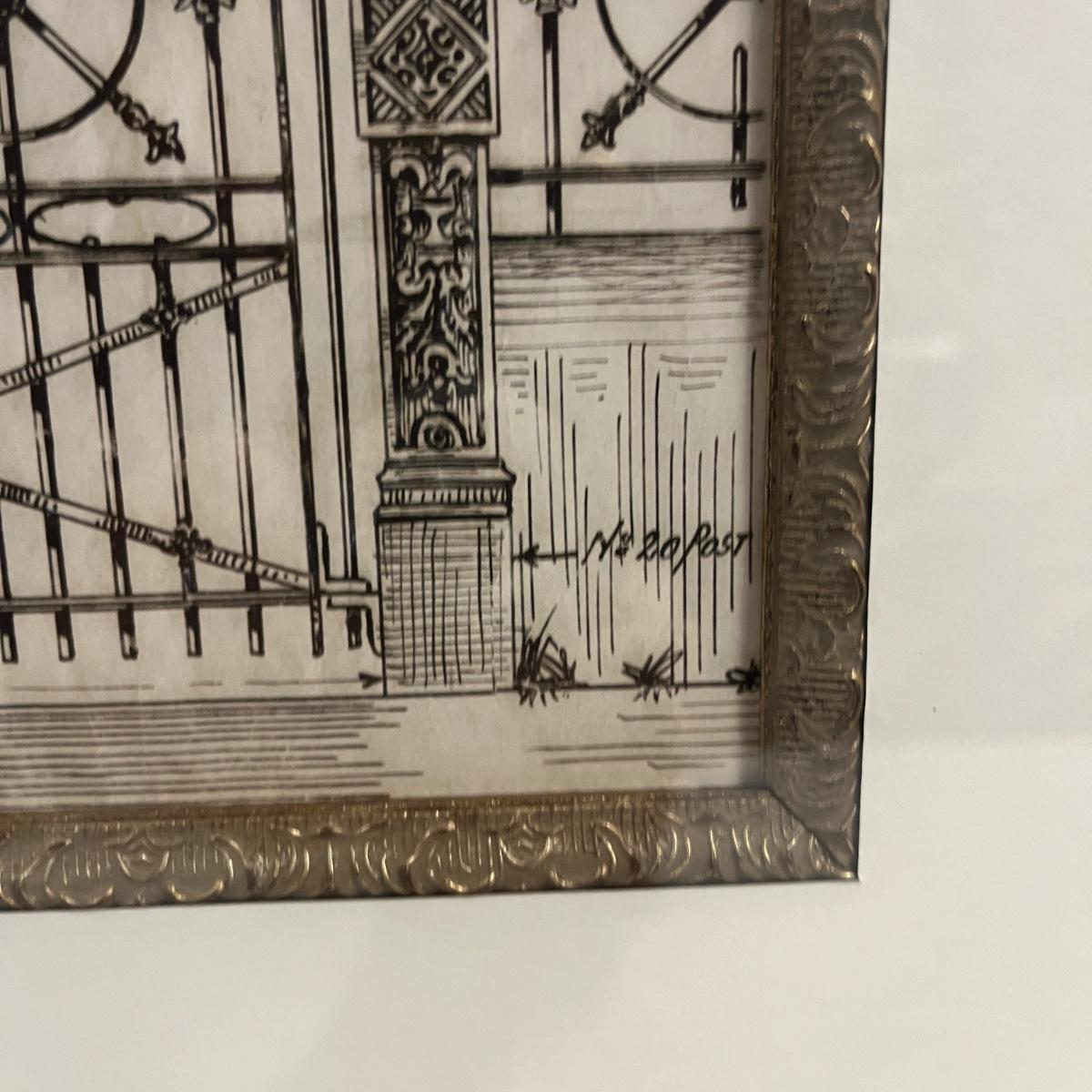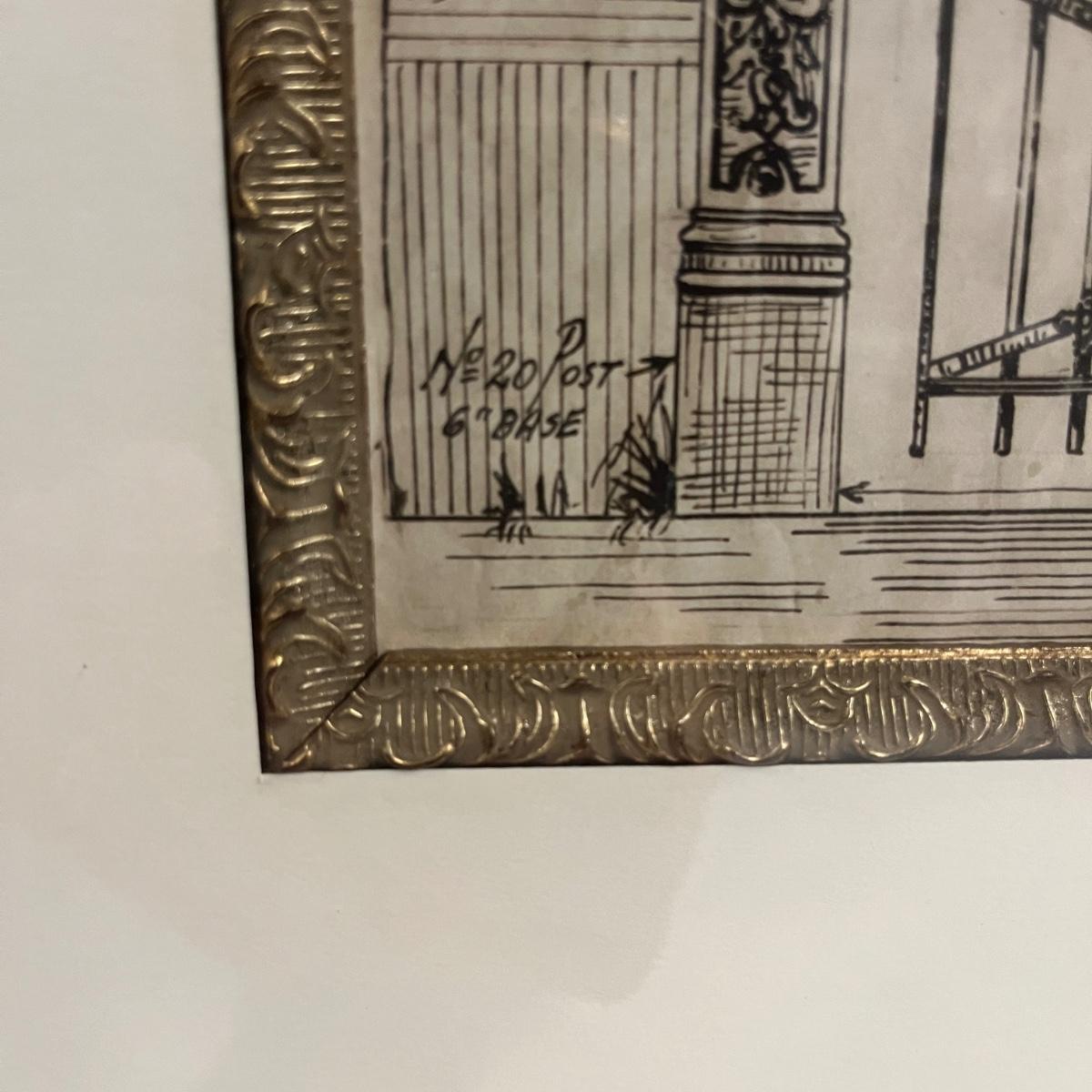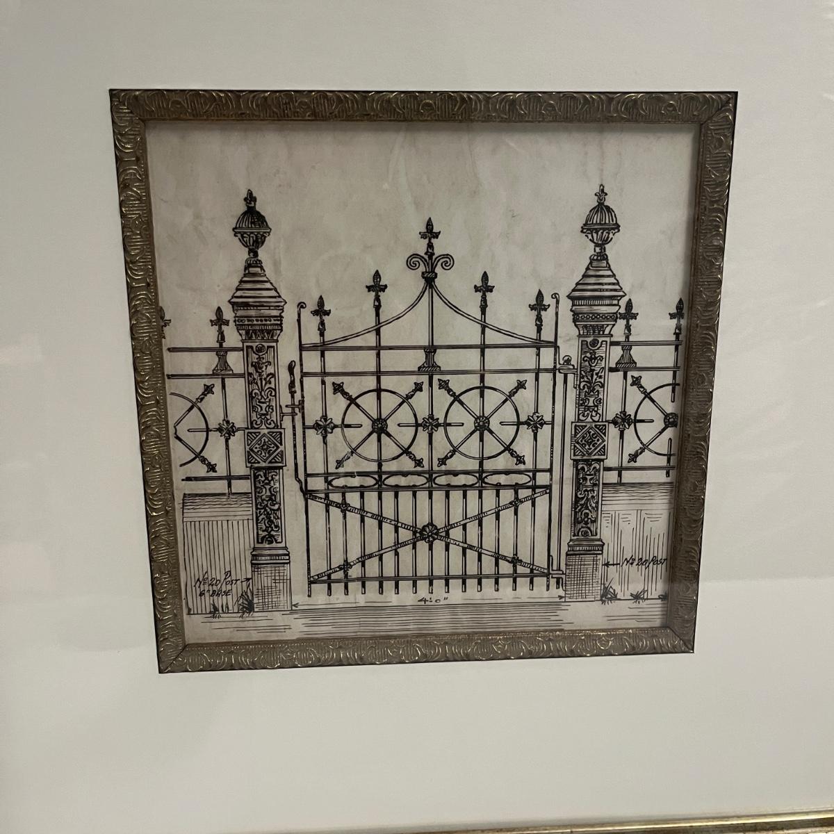 This metal framed and matted artwork is what appears to be a blueprint style of a Stewart Iron Works gate with a Fleur-De-Lis design. Frame measures 21” x 21”.