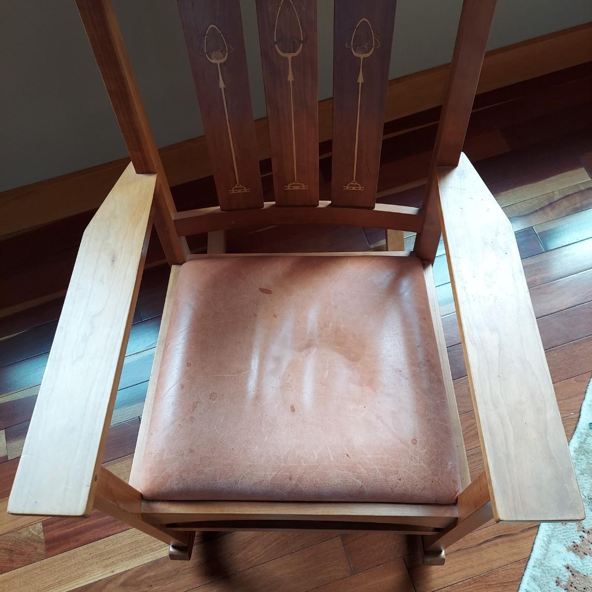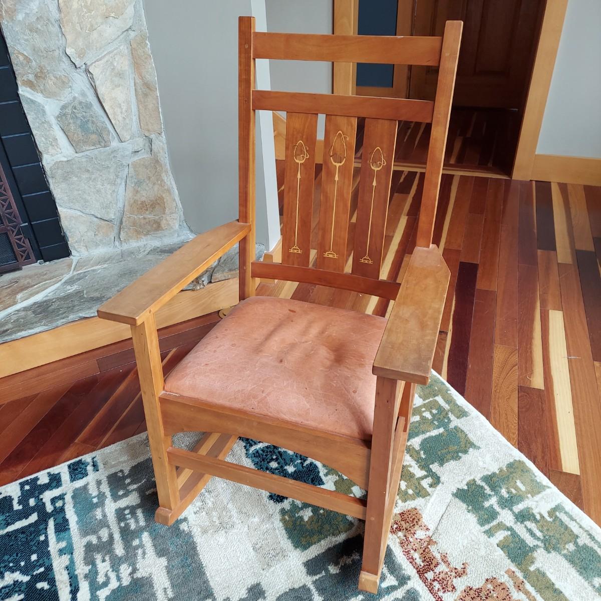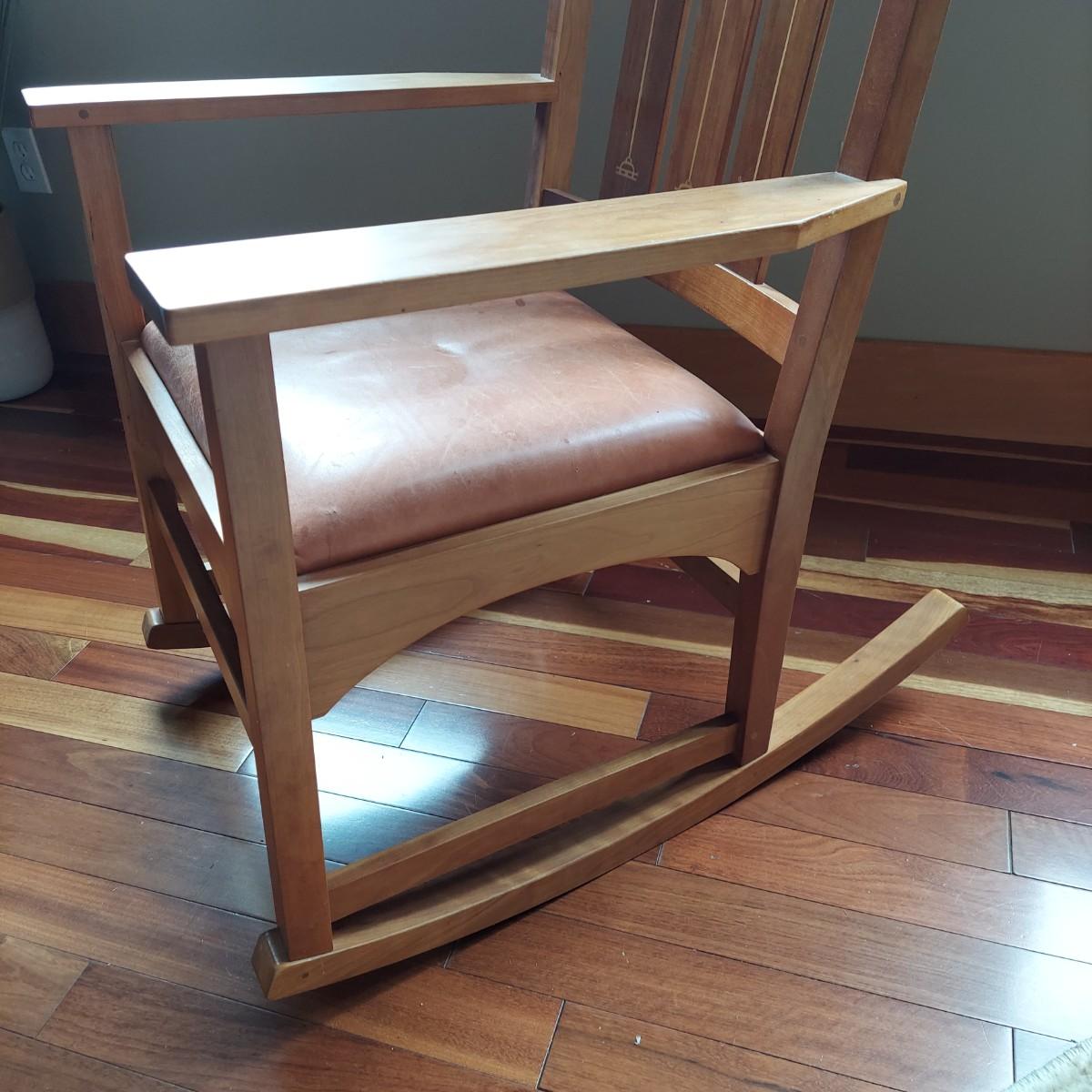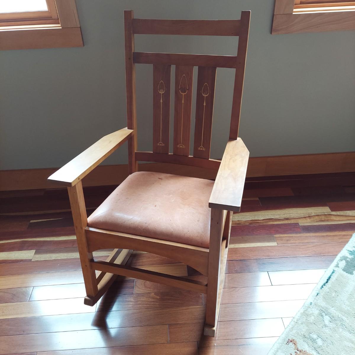 Stickley brand Arts and Crafts style rocking chair. Mission craftsman design with contrasting wood inlay on the back and leather seat. Measures approximately 25 x 30 x 41"H with a seat height of approximately 17". Local Pickup Only.