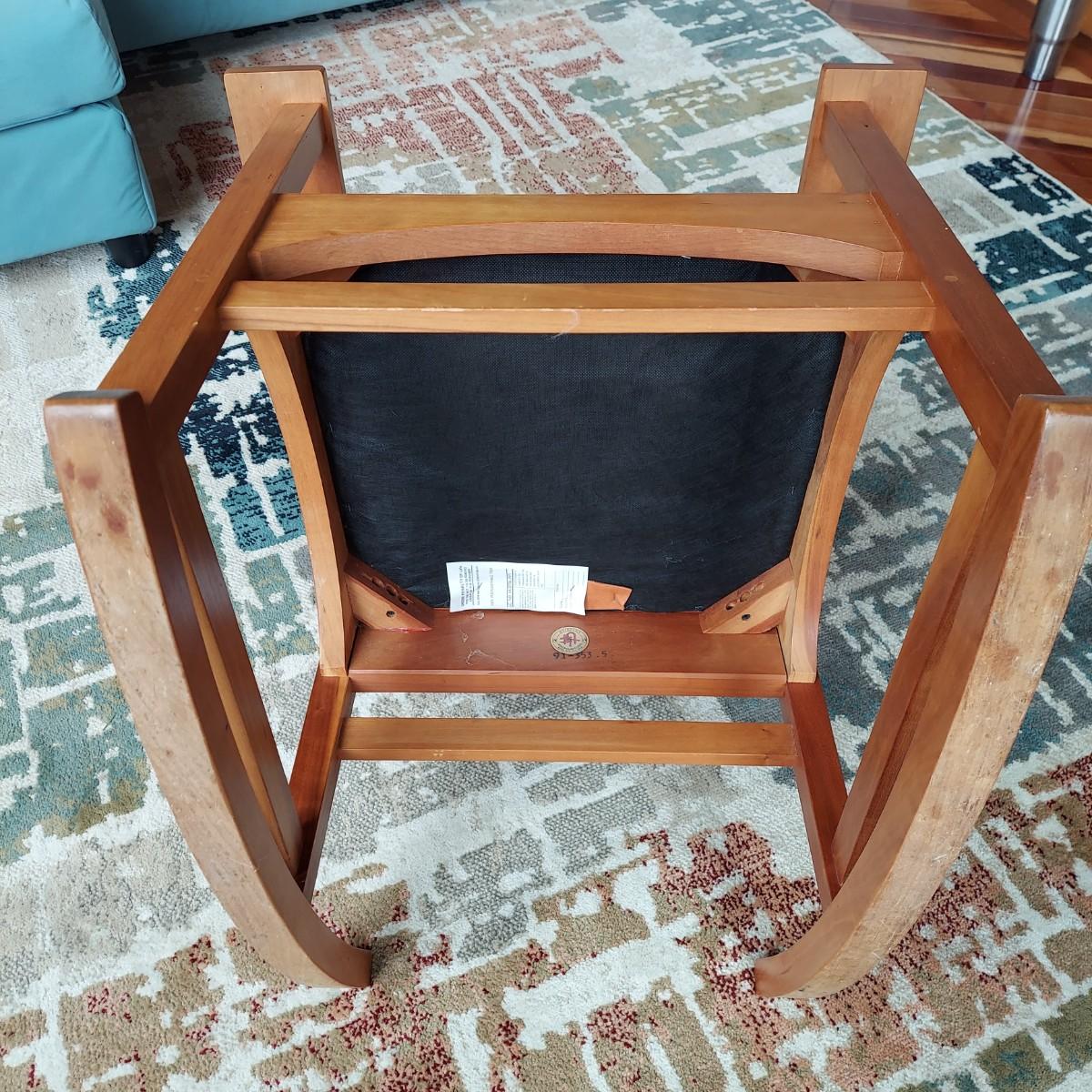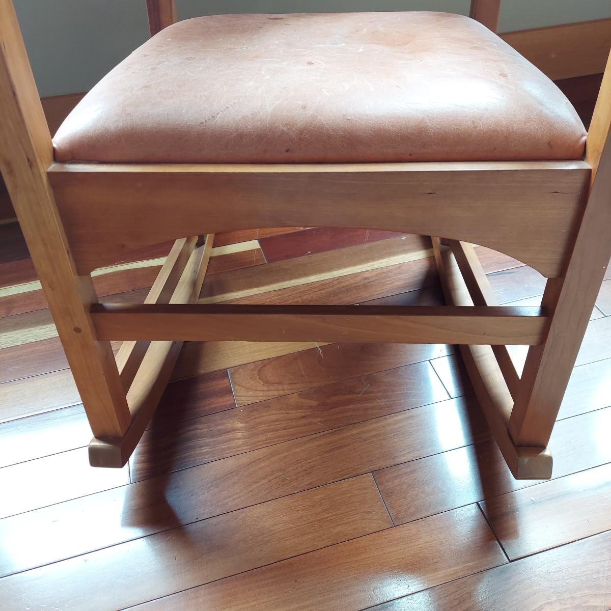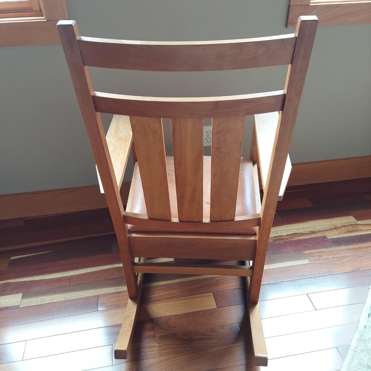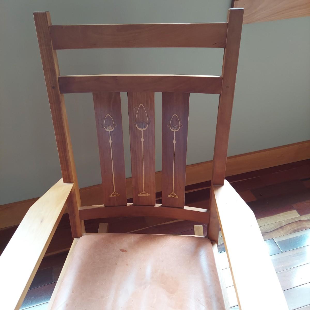 Stickley brand Arts and Crafts style rocking chair. Mission craftsman design with contrasting wood inlay on the back and leather seat. Measures approximately 25 x 30 x 41"H with a seat height of approximately 17". Local Pickup Only.