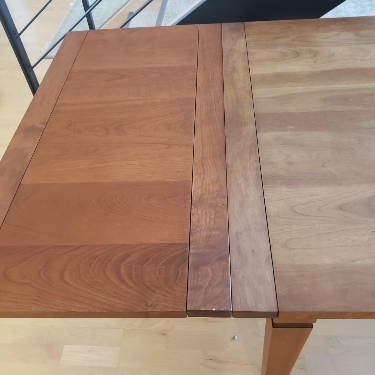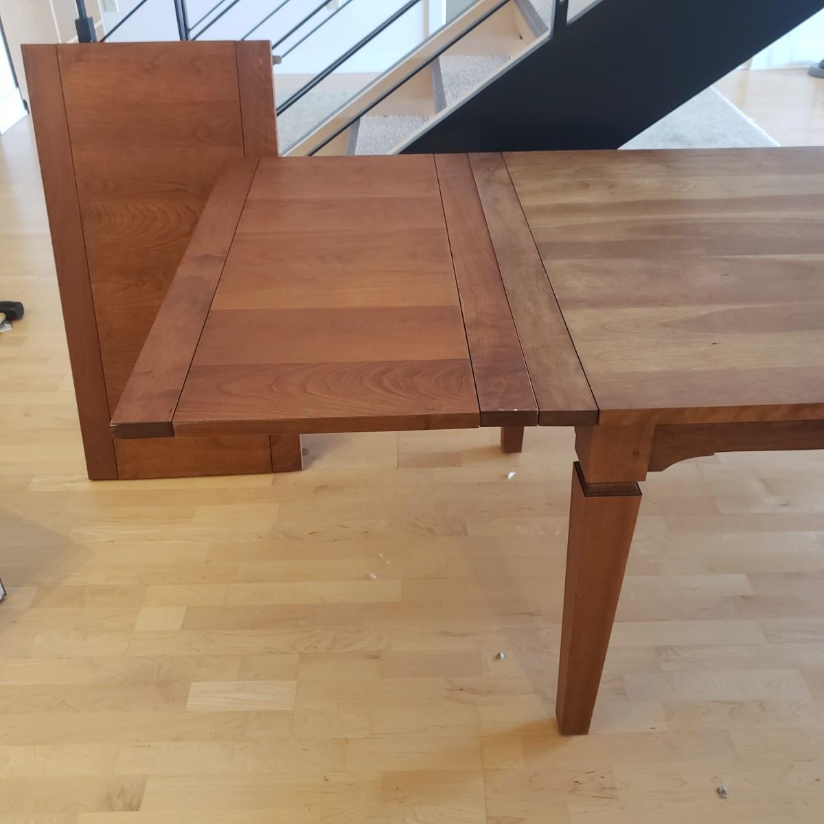 This solid wood Stickley table has two leaves included. The table alone measures 60" x 40" x 30"H. Each leaf measures 21" x 40". With both leaves on the table is 102" long. The leaves attach by two long boards pulled out and fit in a pin hole. The table has wear, as seen next to the two leaves. One leaf has a blemish, see last picture.