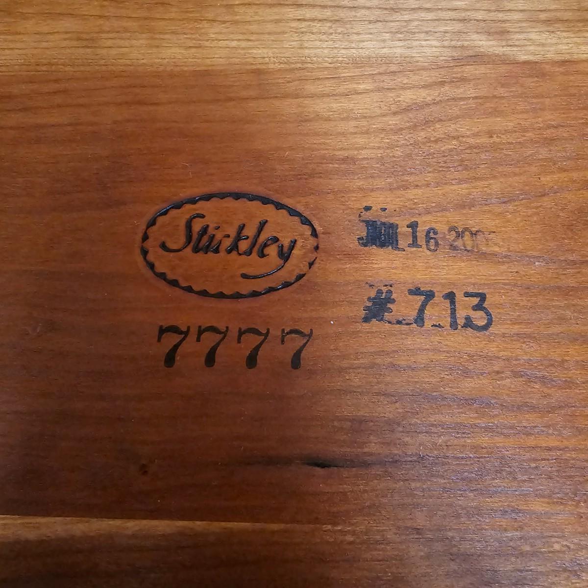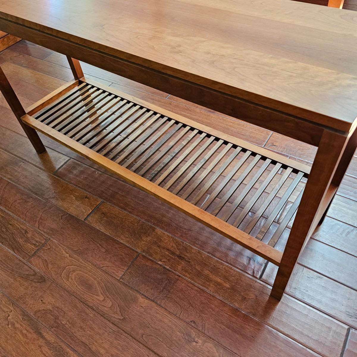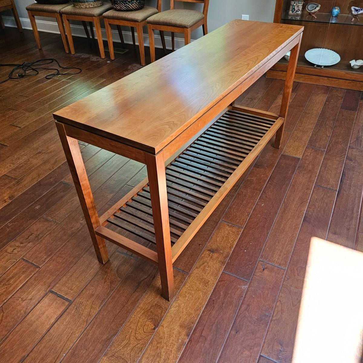 Solid wood table by Stickley in their traditional mission style. Table is elegant and has signature spaced boards on bottom shelf. Table measures 54" x 16" x 30"H. See photos for details. Local pickup only. Winning bidder must bring assistance to help move and load this item due to its weight and/or size.