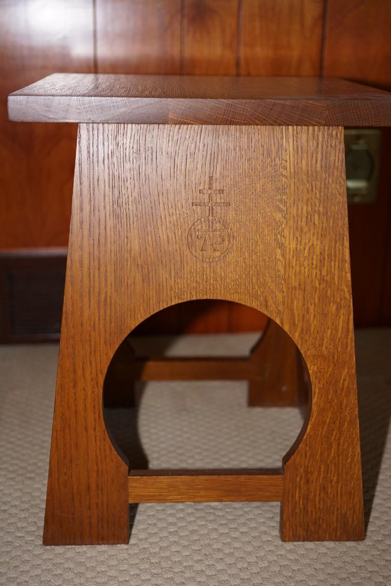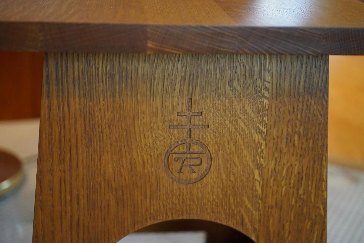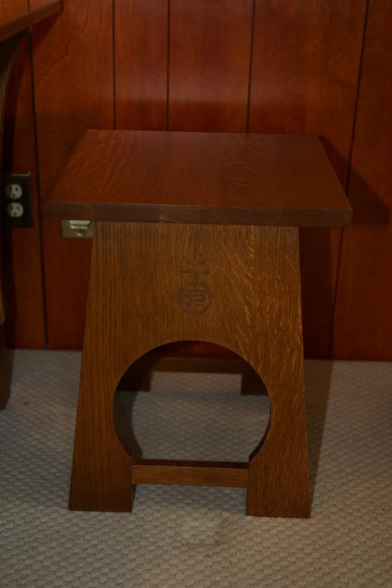 a reproduction of a Roycroft taboret style table. Stamped with the Roycroft mark.