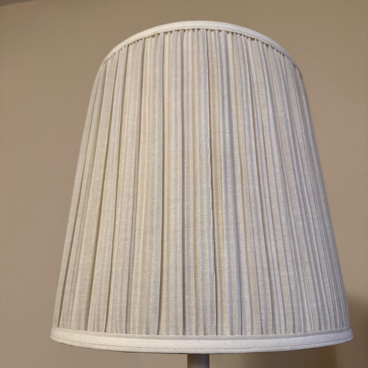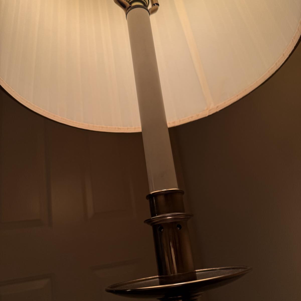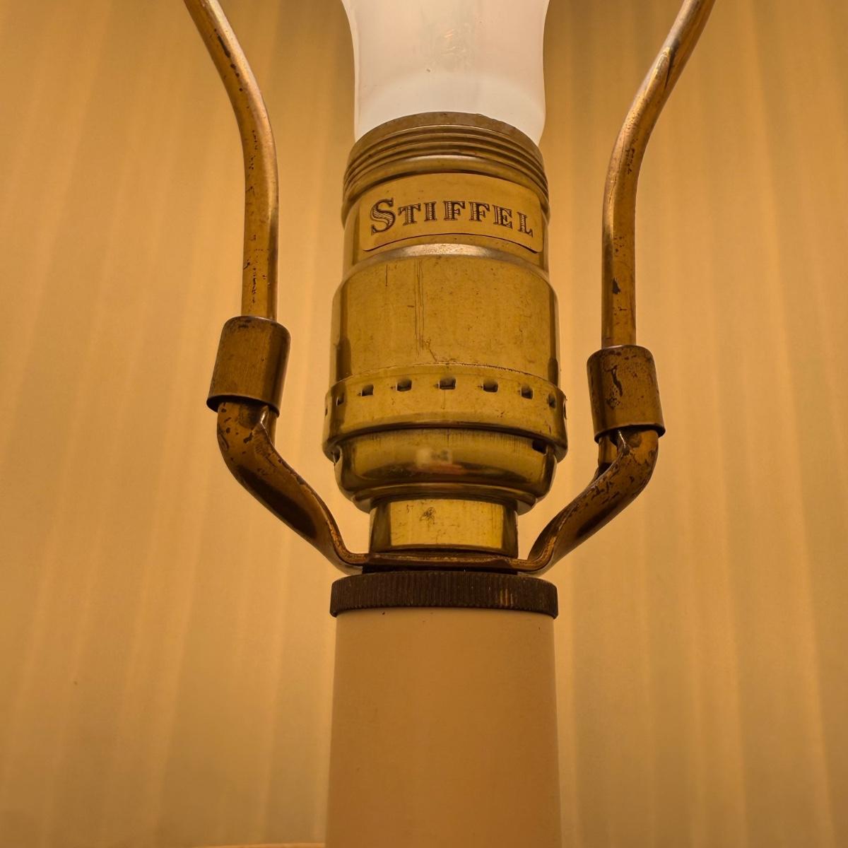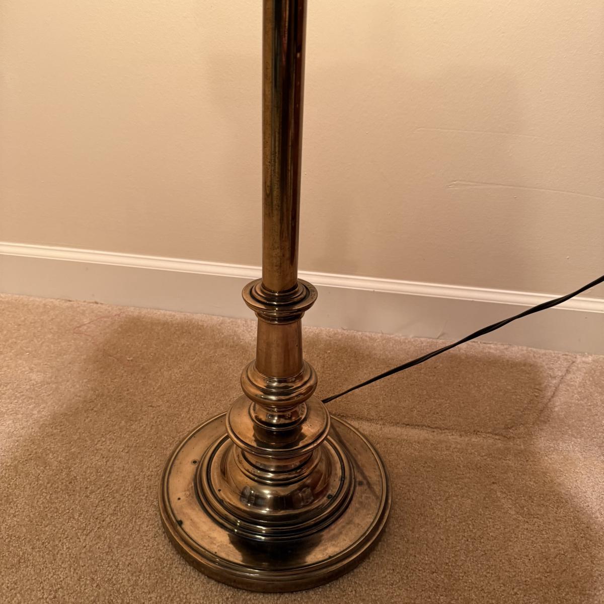 Candlestick style brass floor lamp with attached wood table has a Stiffel brand sticker attached. The white column is metal and the lamp has an off-white fabric shade. Attached square table has lovely burl-like patterning. There is a small area with crackled finish that only shows when the light hits it just right. Lamp base is 10”D and lamp is 54”H. Table is 15”sq. This one-way lamp powered on when plugged in, though its rotary switch is a bit touchy.