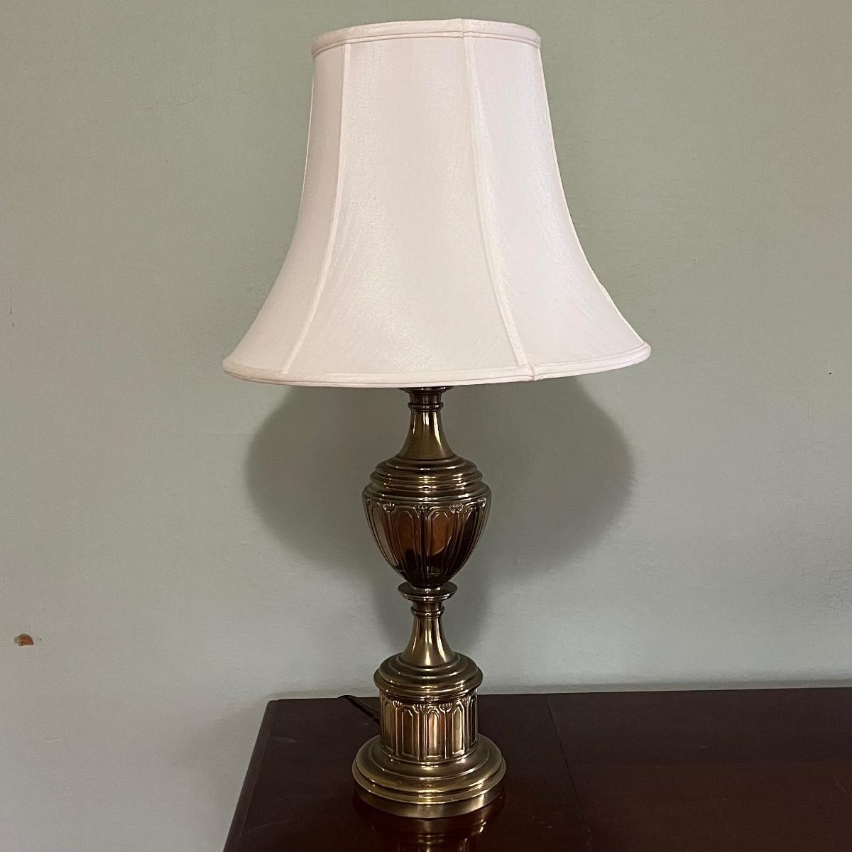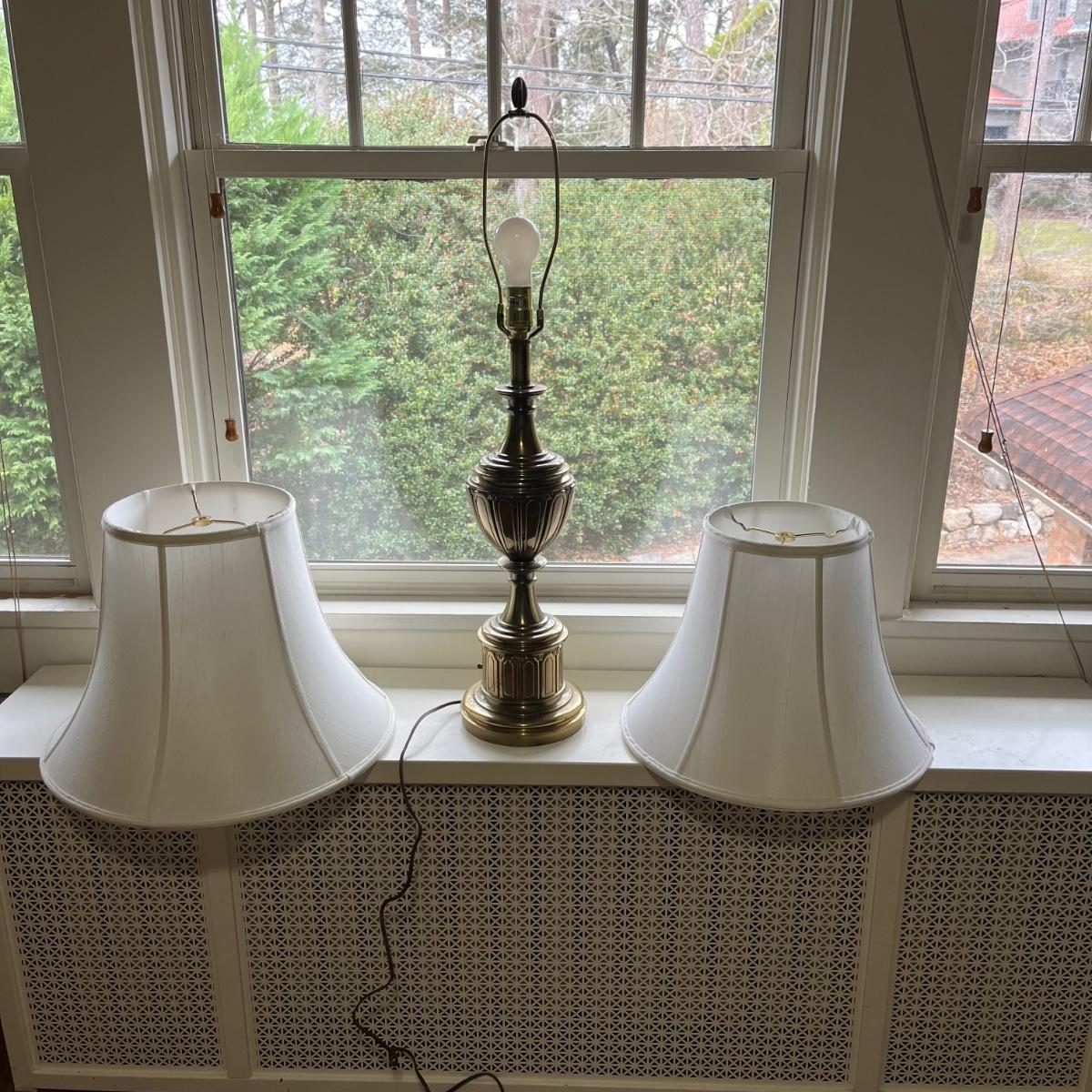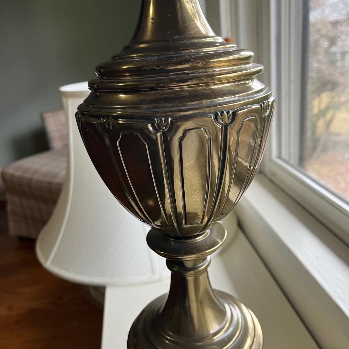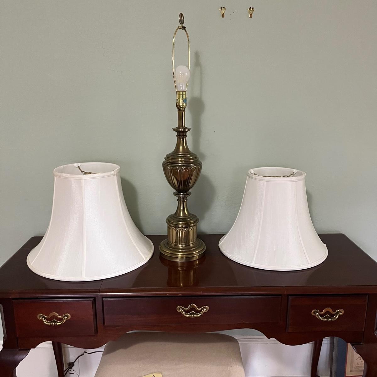 One Stiffel brand brass lamp measures 33.5”H x 7”D at base. Lamp is solid and fairly heavy. It comes with one fluted shade and a brass finial, as well as a smaller accompanying shade in the same style and fabric. Smaller shade is 16”D x 12”H.