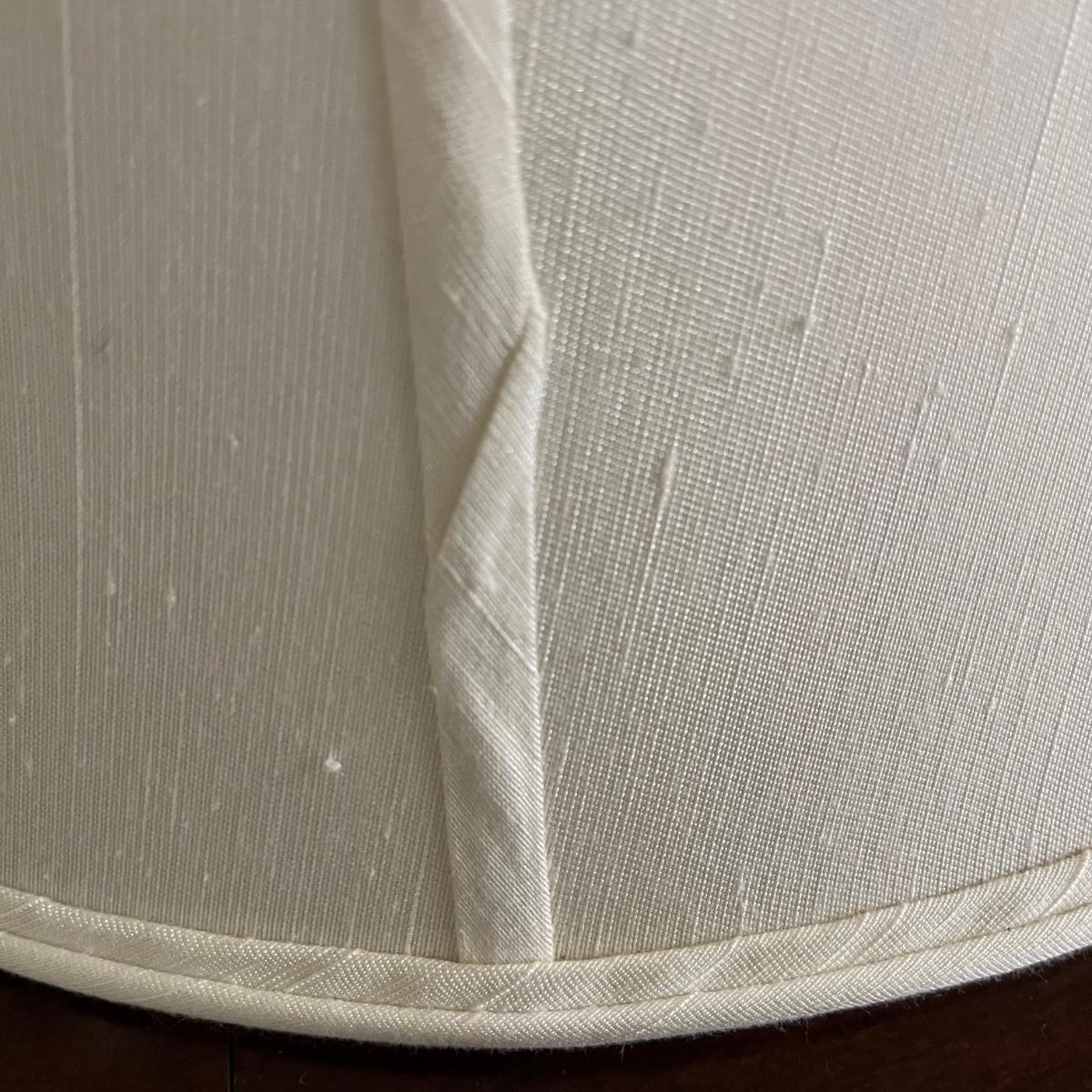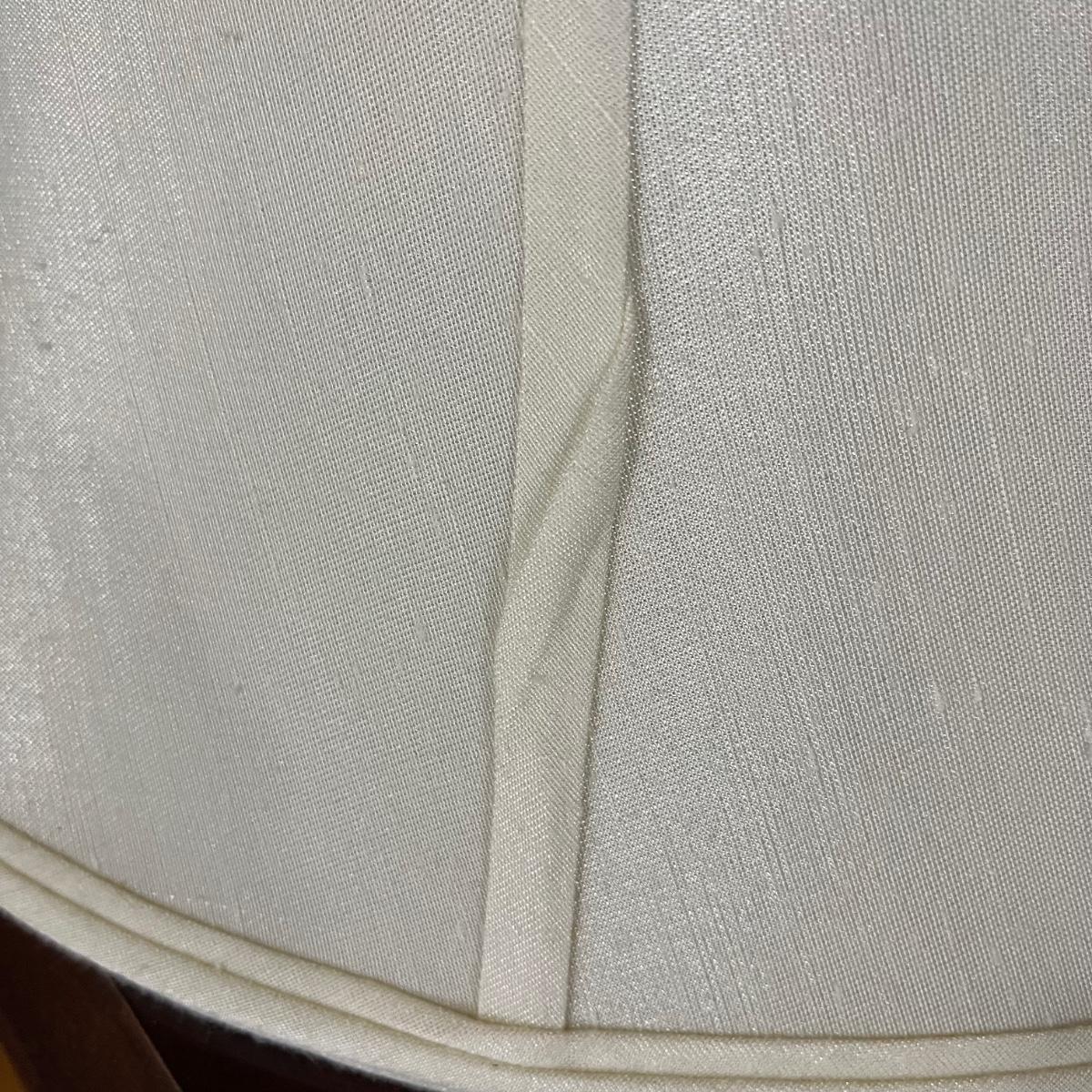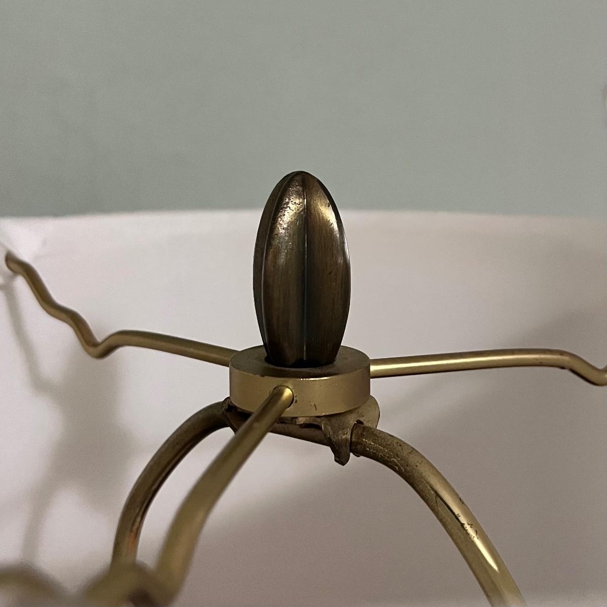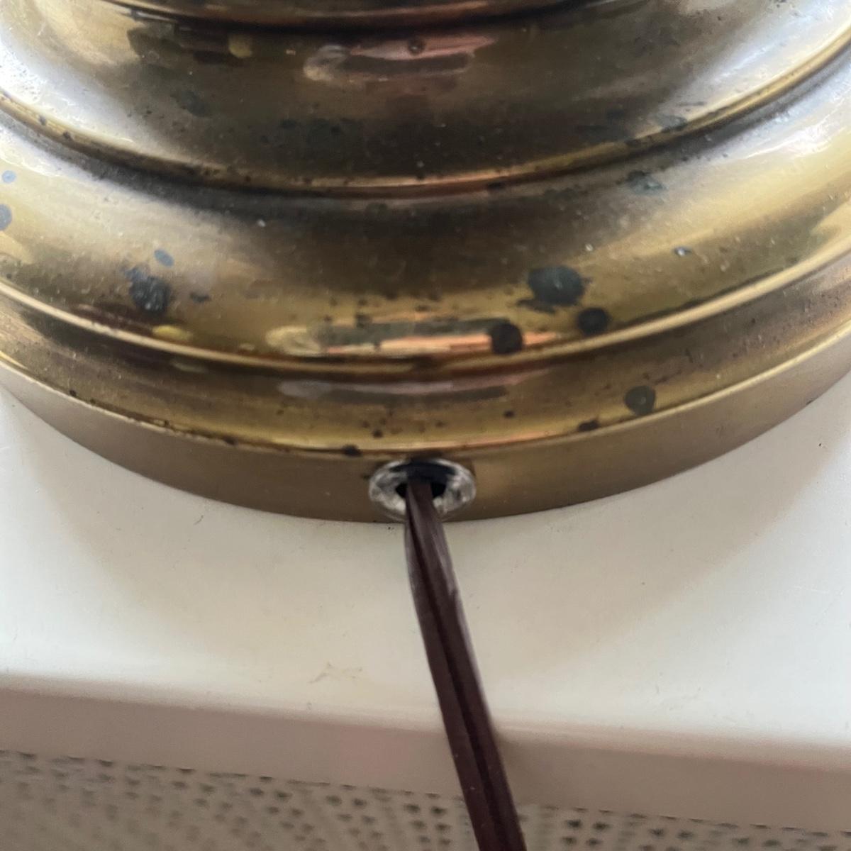 Lamp has a three way rotary switch and powers up when plugged in. There is wear on the brass base and both lamp shades have one overlapped seam. Shipping available.
