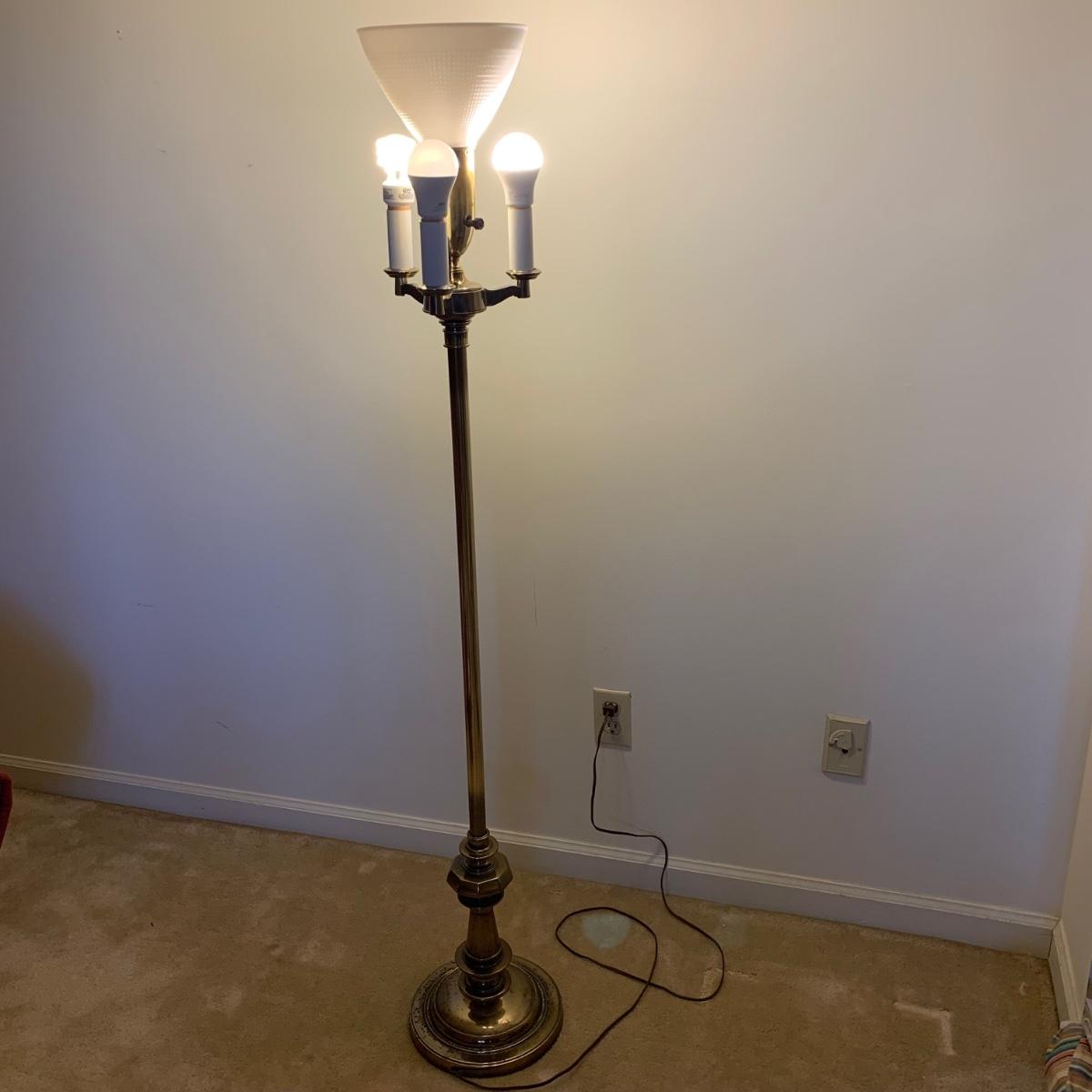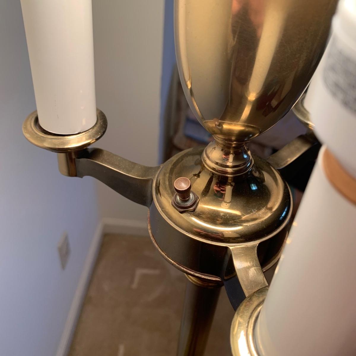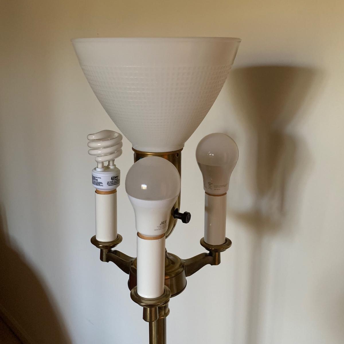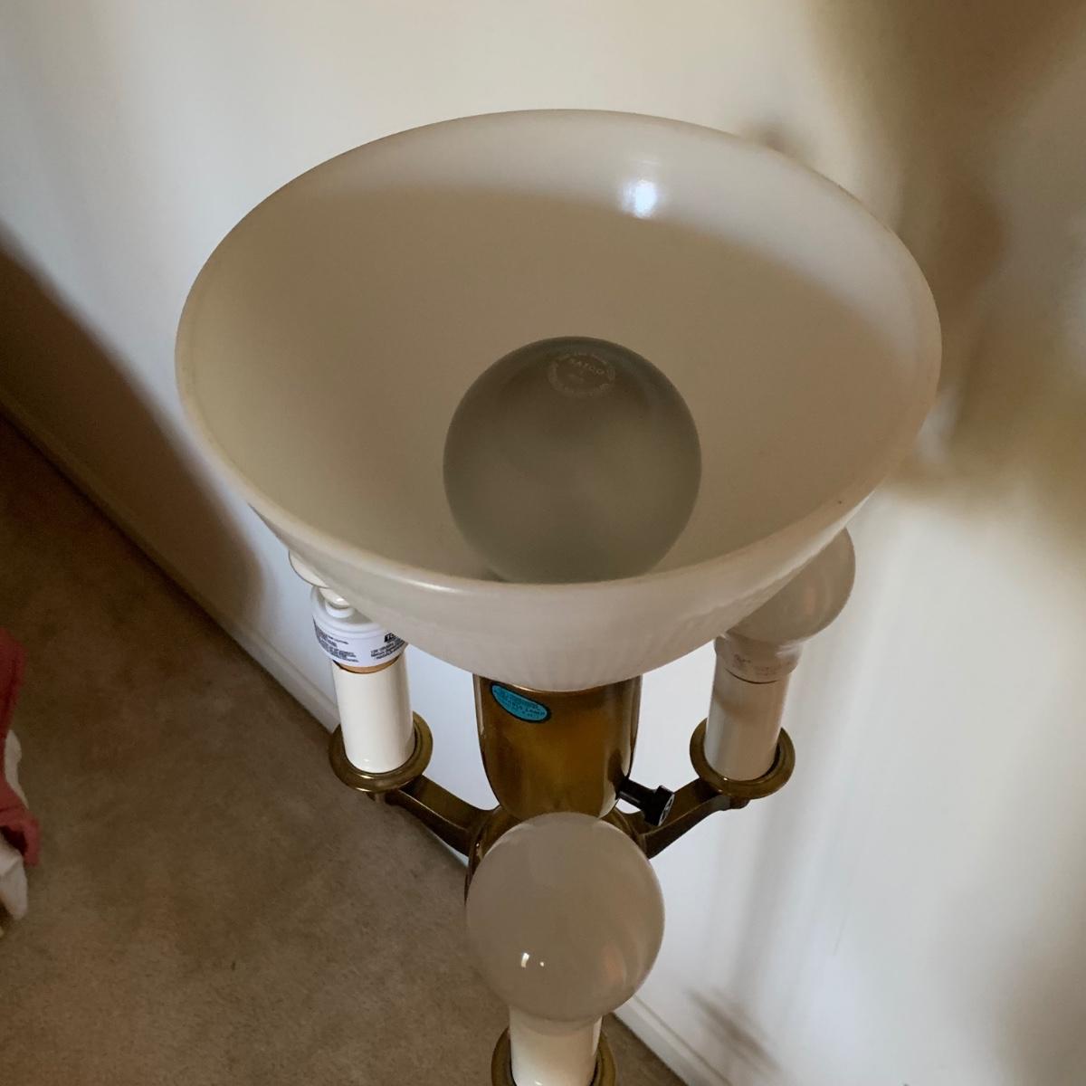Brass-like metal candelabra style floor lamp with four lights, labeled “Stiffel”. Has various levels of brightness controlled with its two switches. Lamp also can be turned on and off by pulling down on its metal body- a unique feature! Lamp has a white glass shade. Currently also has a beige colored shade that is resting on top; would be unnecessary if you replaced the bulbs with dimmer candelabra style light bulbs. Some wear is seen on the base. Lamp base is 10”D. Lamp is 59”H. Lamp powered on when plugged in.