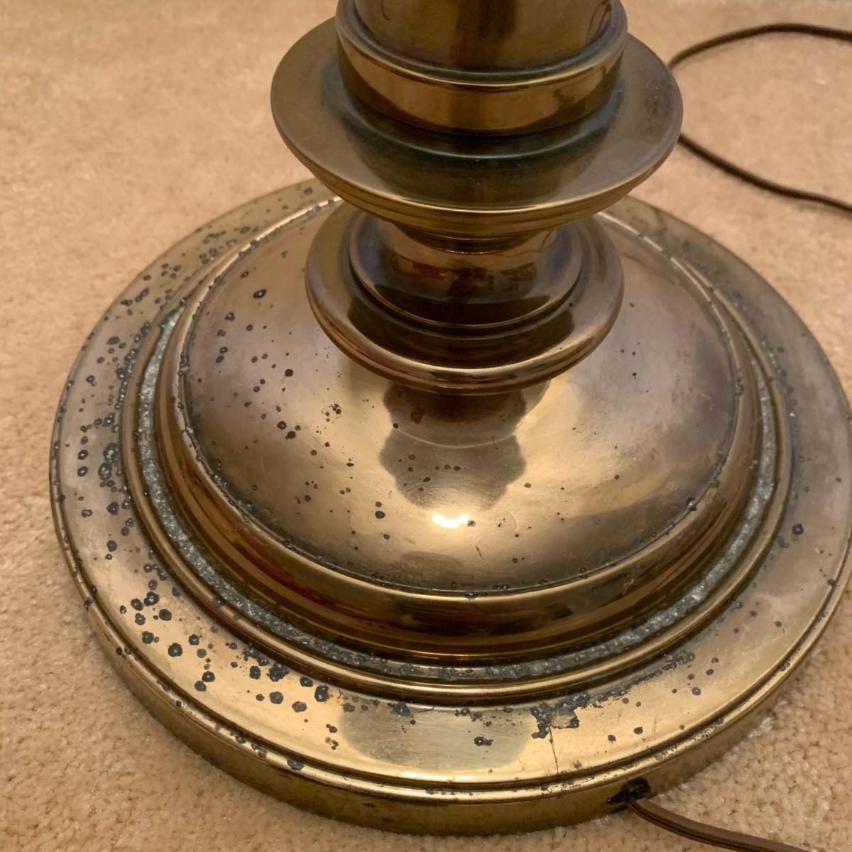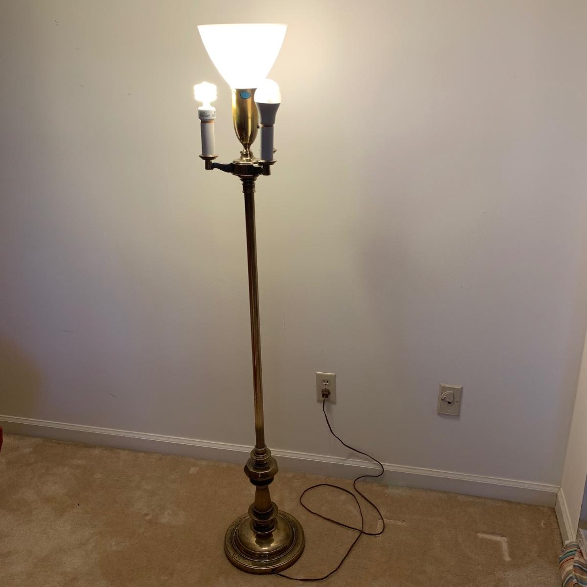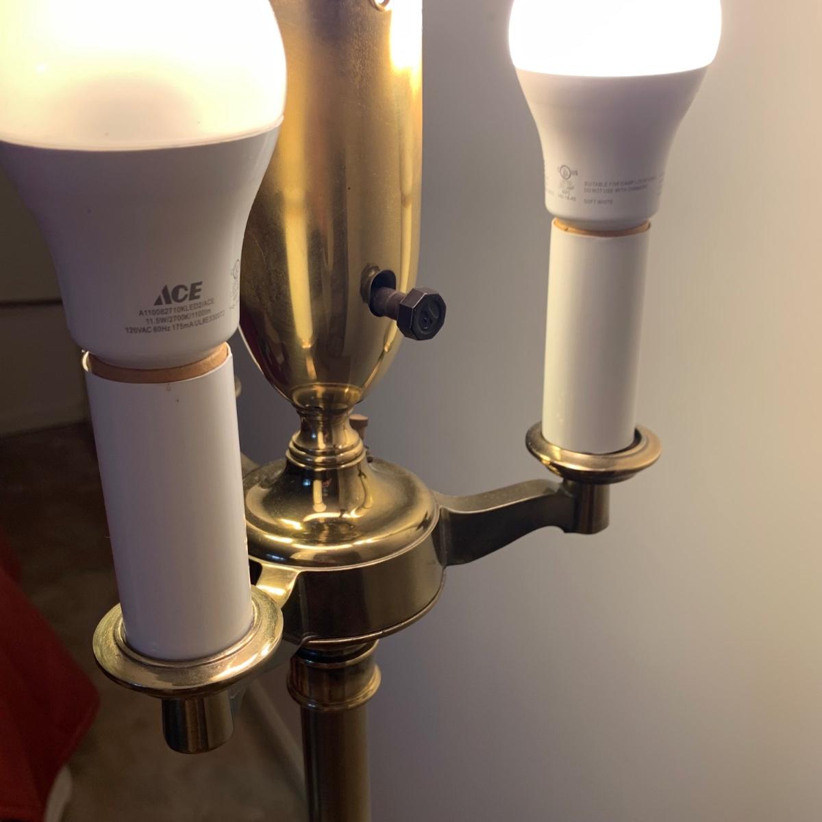 Brass-like metal candelabra style floor lamp with four lights, labeled “Stiffel”. Has various levels of brightness controlled with its two switches. Lamp also can be turned on and off by pulling down on its metal body- a unique feature! Lamp has a white glass shade. Currently also has a beige colored shade that is resting on top; would be unnecessary if you replaced the bulbs with dimmer candelabra style light bulbs. Some wear is seen on the base. Lamp base is 10”D. Lamp is 59”H. Lamp powered on when plugged in.
