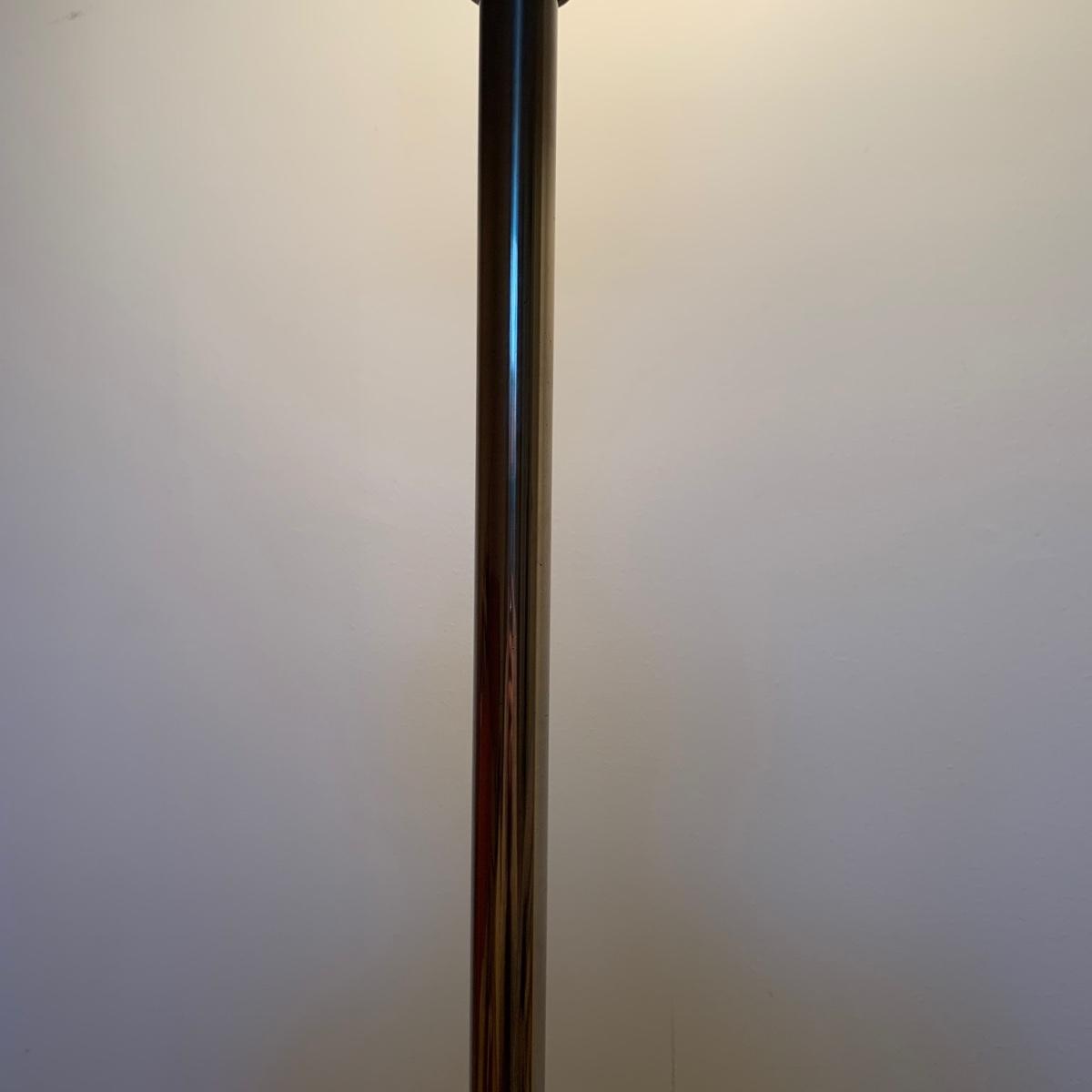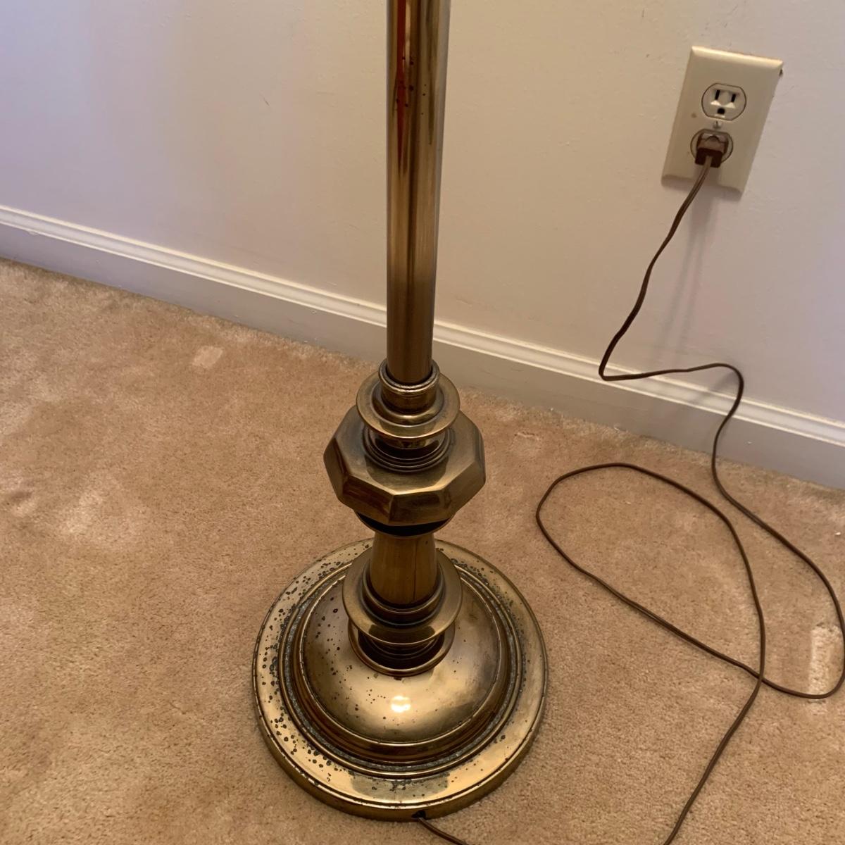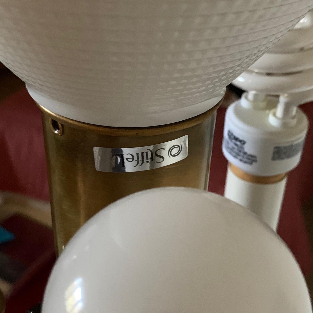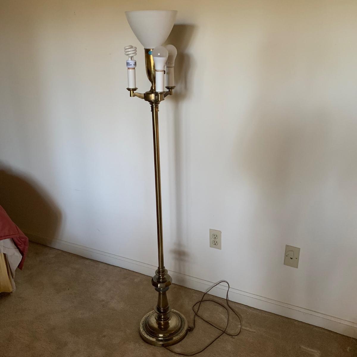 Brass-like metal candelabra style floor lamp with four lights, labeled “Stiffel”. Has various levels of brightness controlled with its two switches. Lamp also can be turned on and off by pulling down on its metal body- a unique feature! Lamp has a white glass shade. Currently also has a beige colored shade that is resting on top; would be unnecessary if you replaced the bulbs with dimmer candelabra style light bulbs. Some wear is seen on the base. Lamp base is 10”D. Lamp is 59”H. Lamp powered on when plugged in.