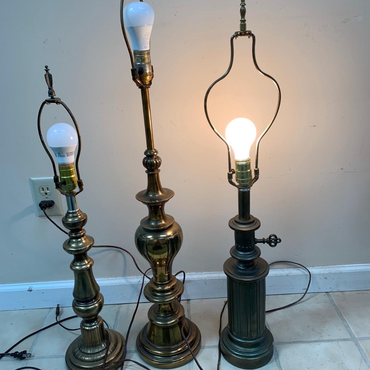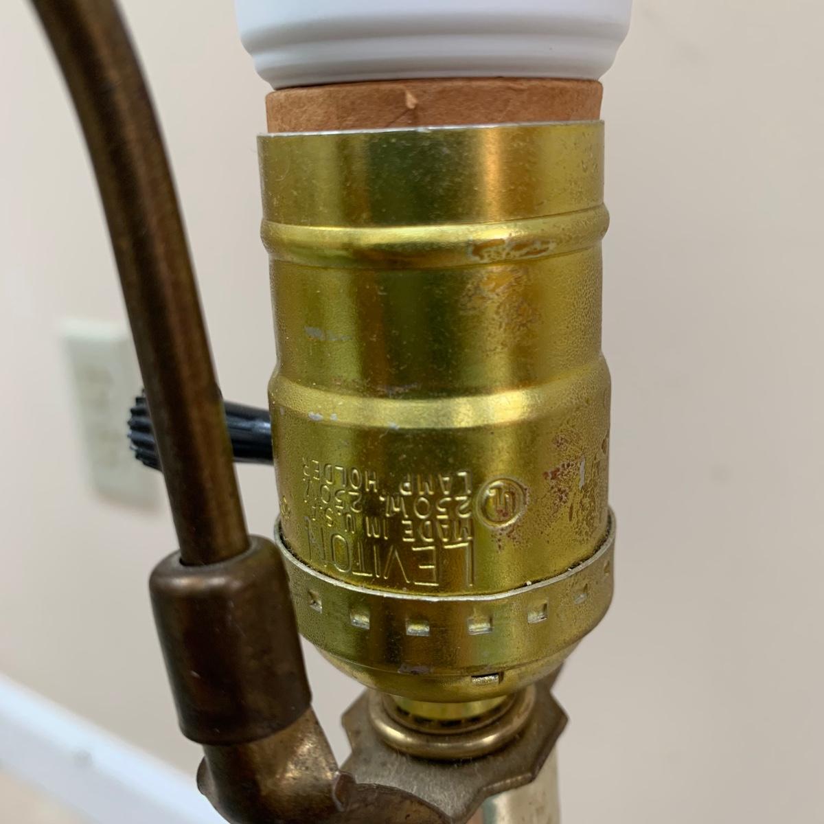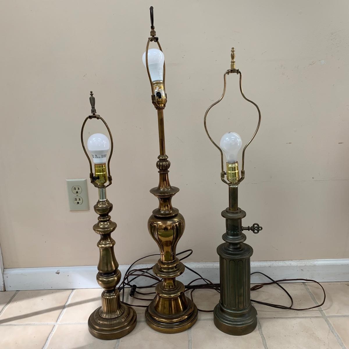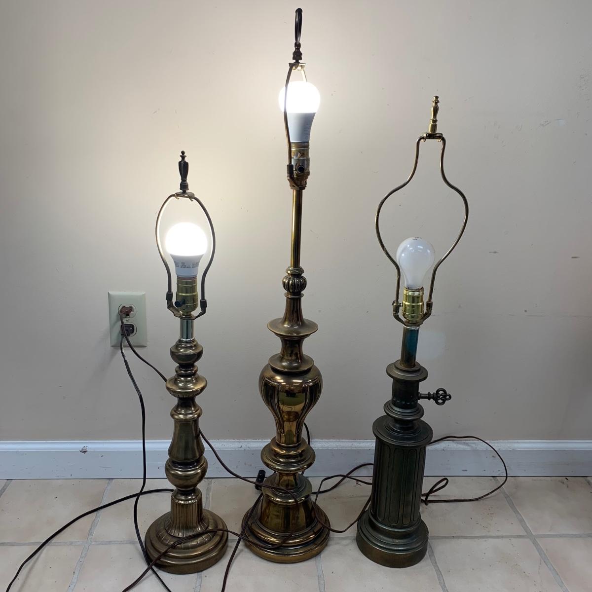 Three lamps that have bases that appear to be brass. One has more of a bronze finish. The tallest lamp has a Stiffel Company label. This one is 3 ft. tall. It has a loose light socket that will need to be reattached. The other two have sockets that are marked “Leviton”. All three turned on when tested. Lamps show some wear but are otherwise in good condition.