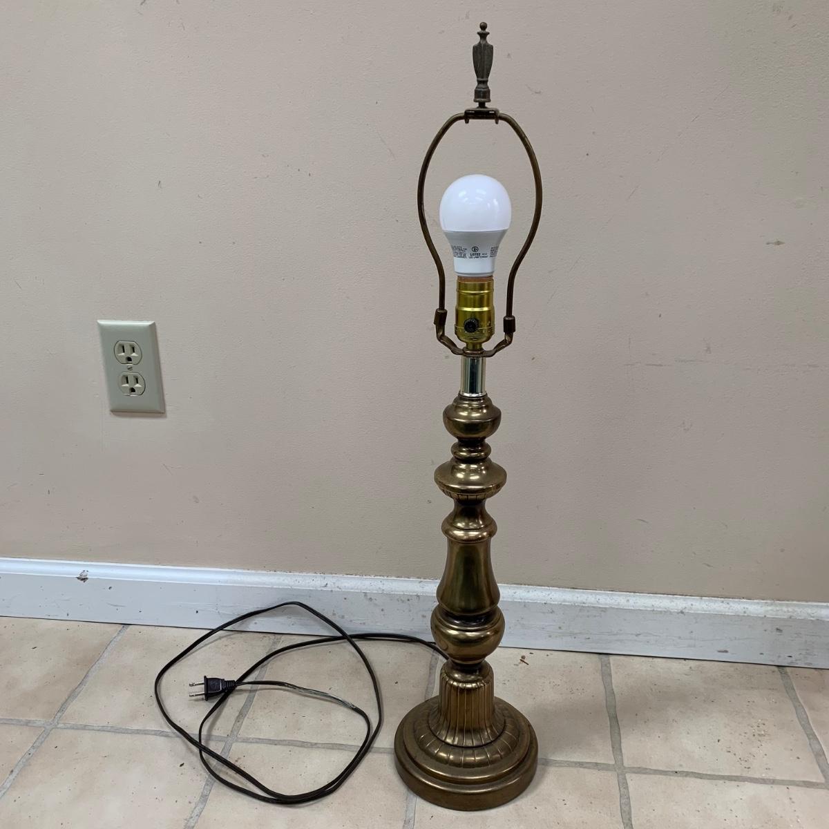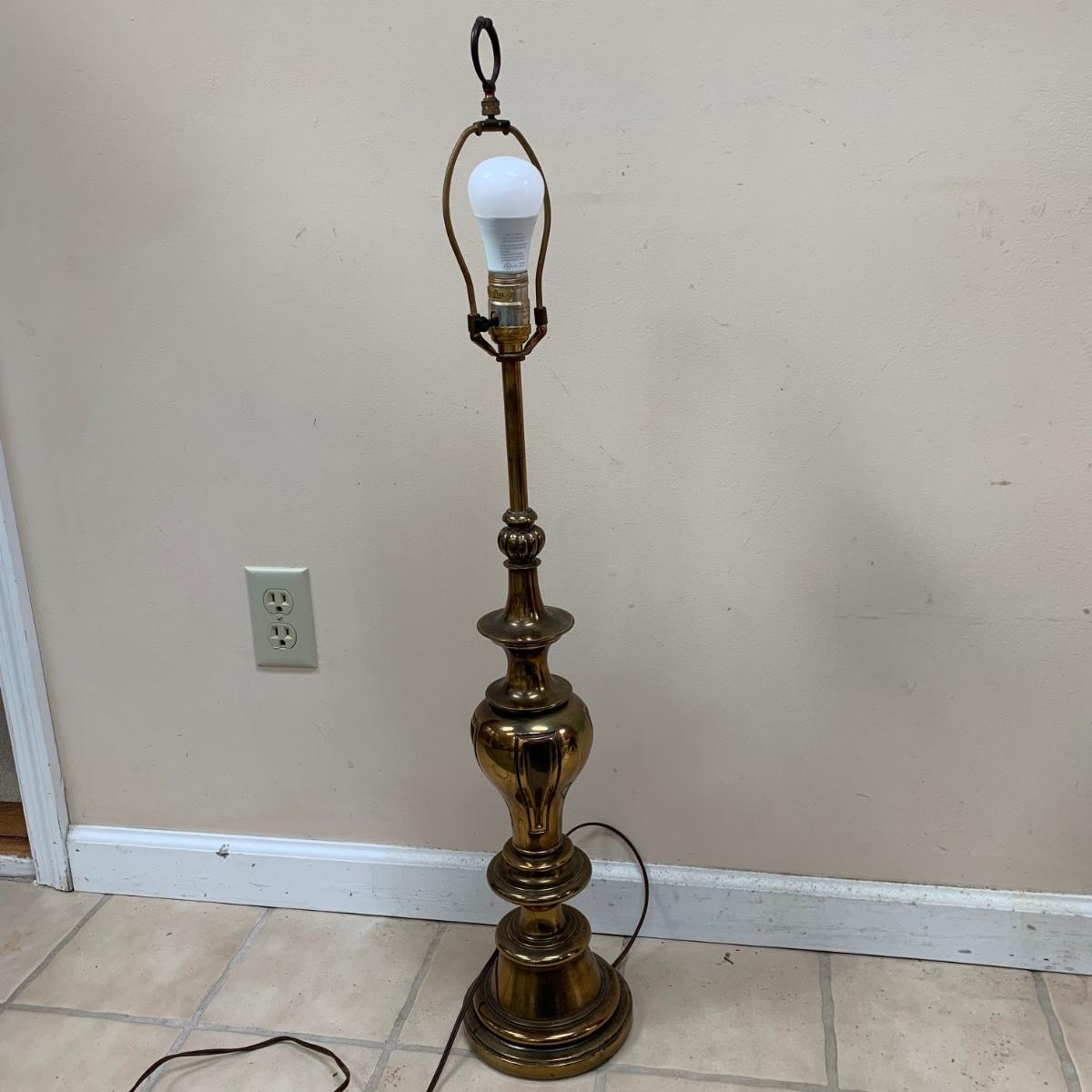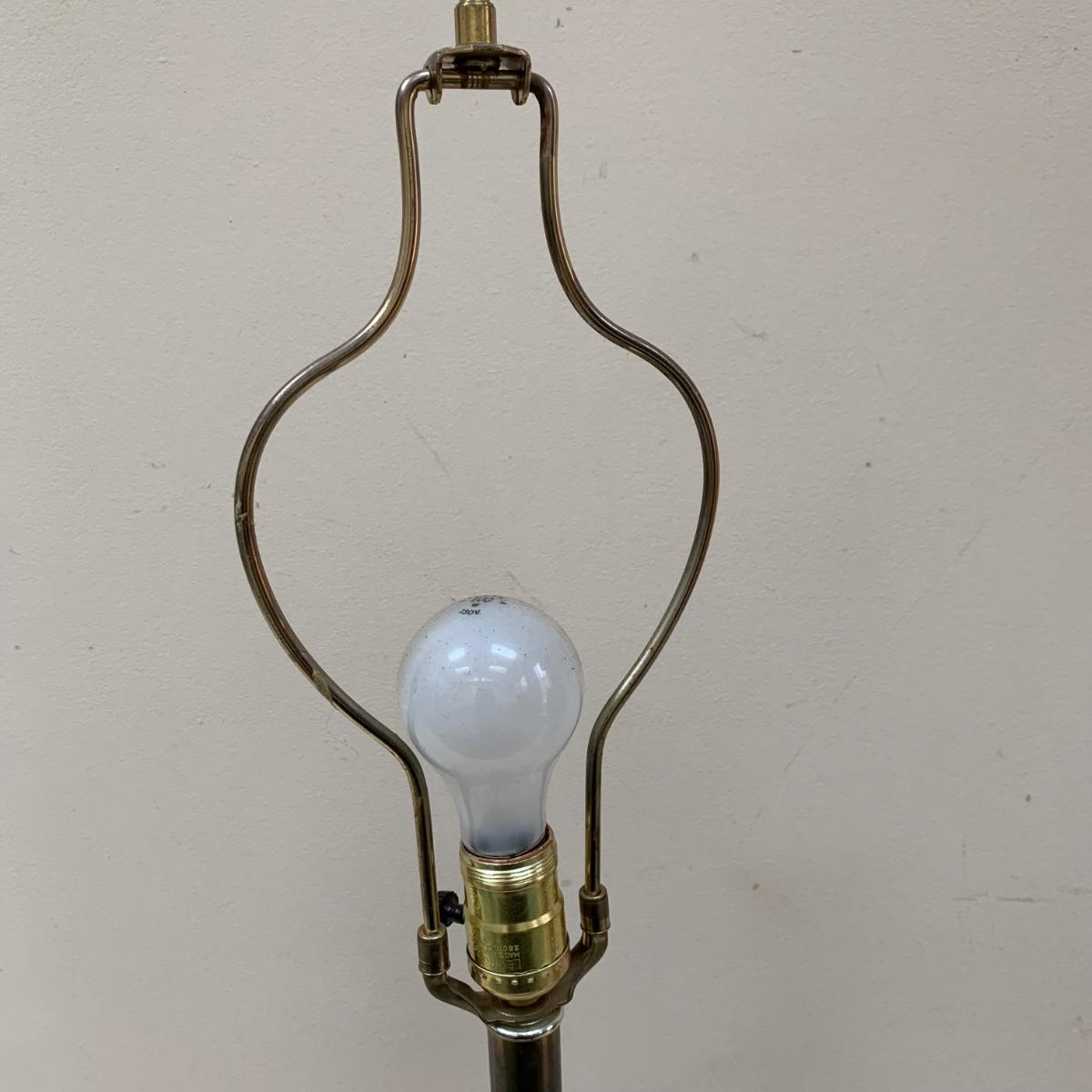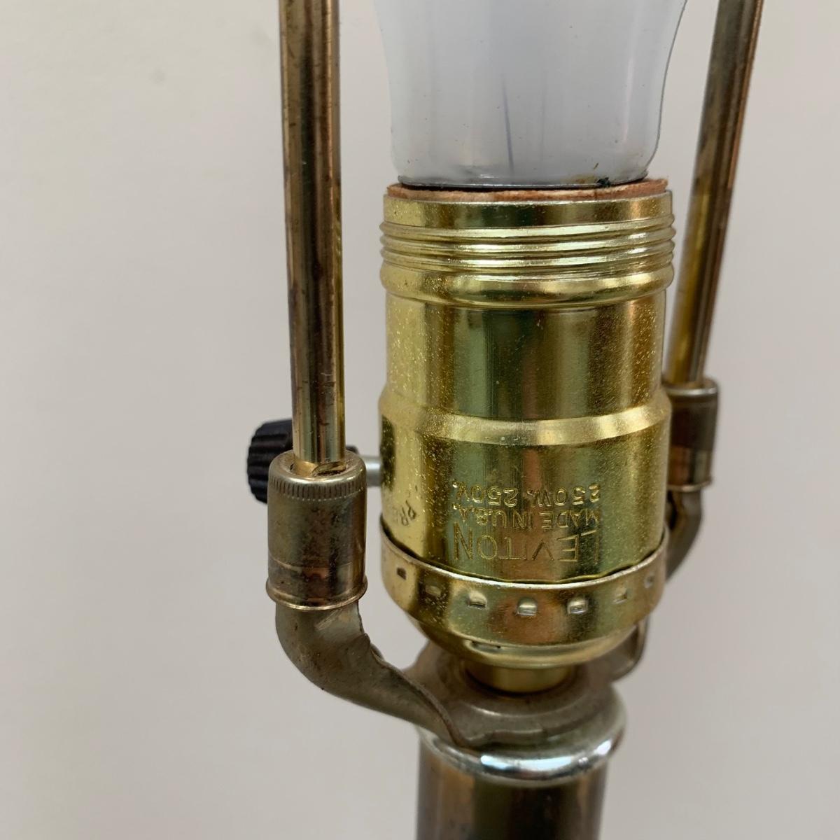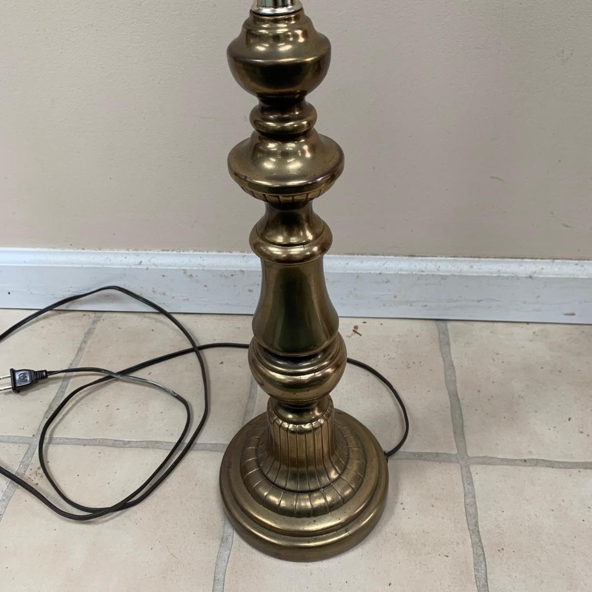 Three lamps that have bases that appear to be brass. One has more of a bronze finish. The tallest lamp has a Stiffel Company label. This one is 3 ft. tall. It has a loose light socket that will need to be reattached. The other two have sockets that are marked “Leviton”. All three turned on when tested. Lamps show some wear but are otherwise in good condition.