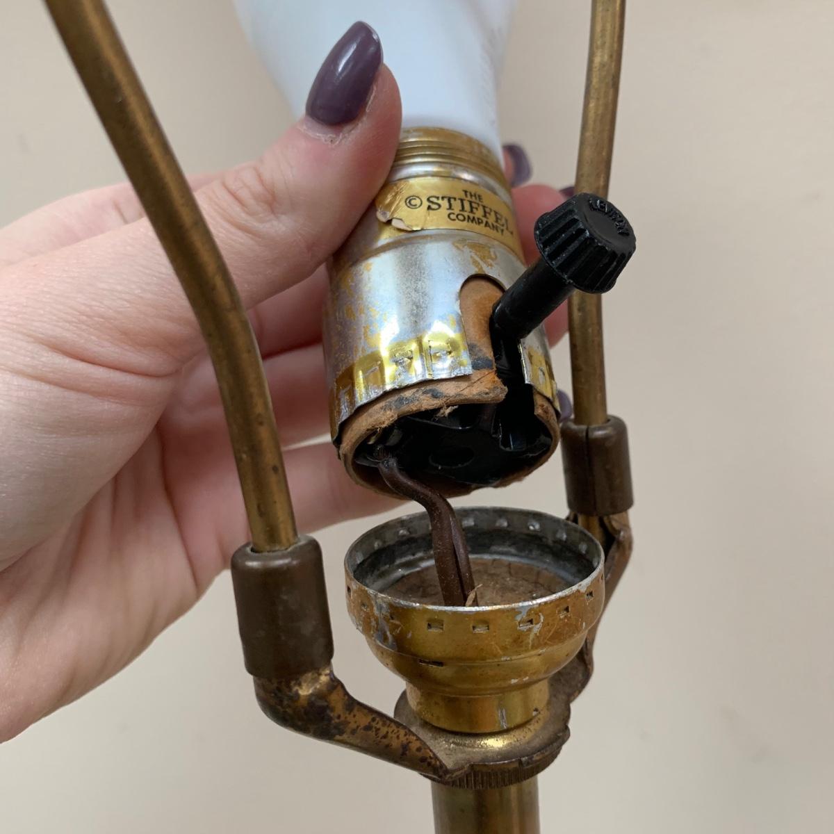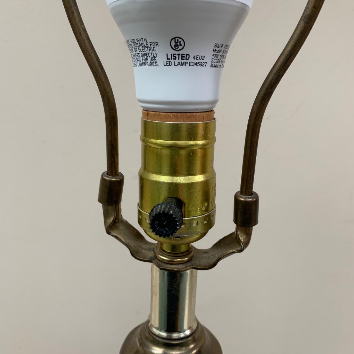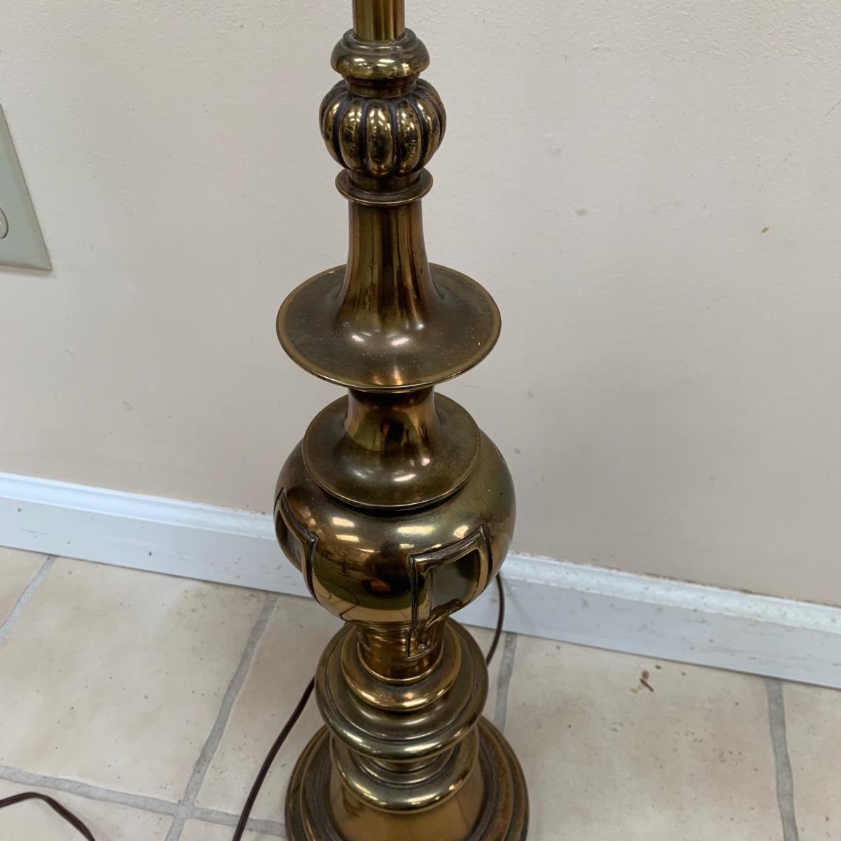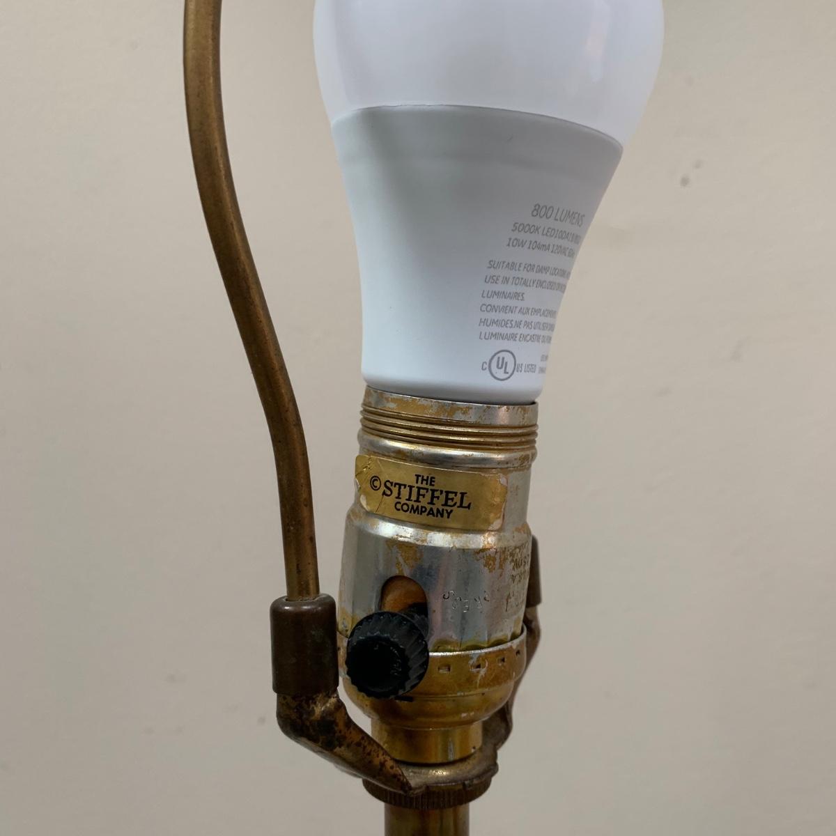 Three lamps that have bases that appear to be brass. One has more of a bronze finish. The tallest lamp has a Stiffel Company label. This one is 3 ft. tall. It has a loose light socket that will need to be reattached. The other two have sockets that are marked “Leviton”. All three turned on when tested. Lamps show some wear but are otherwise in good condition.
