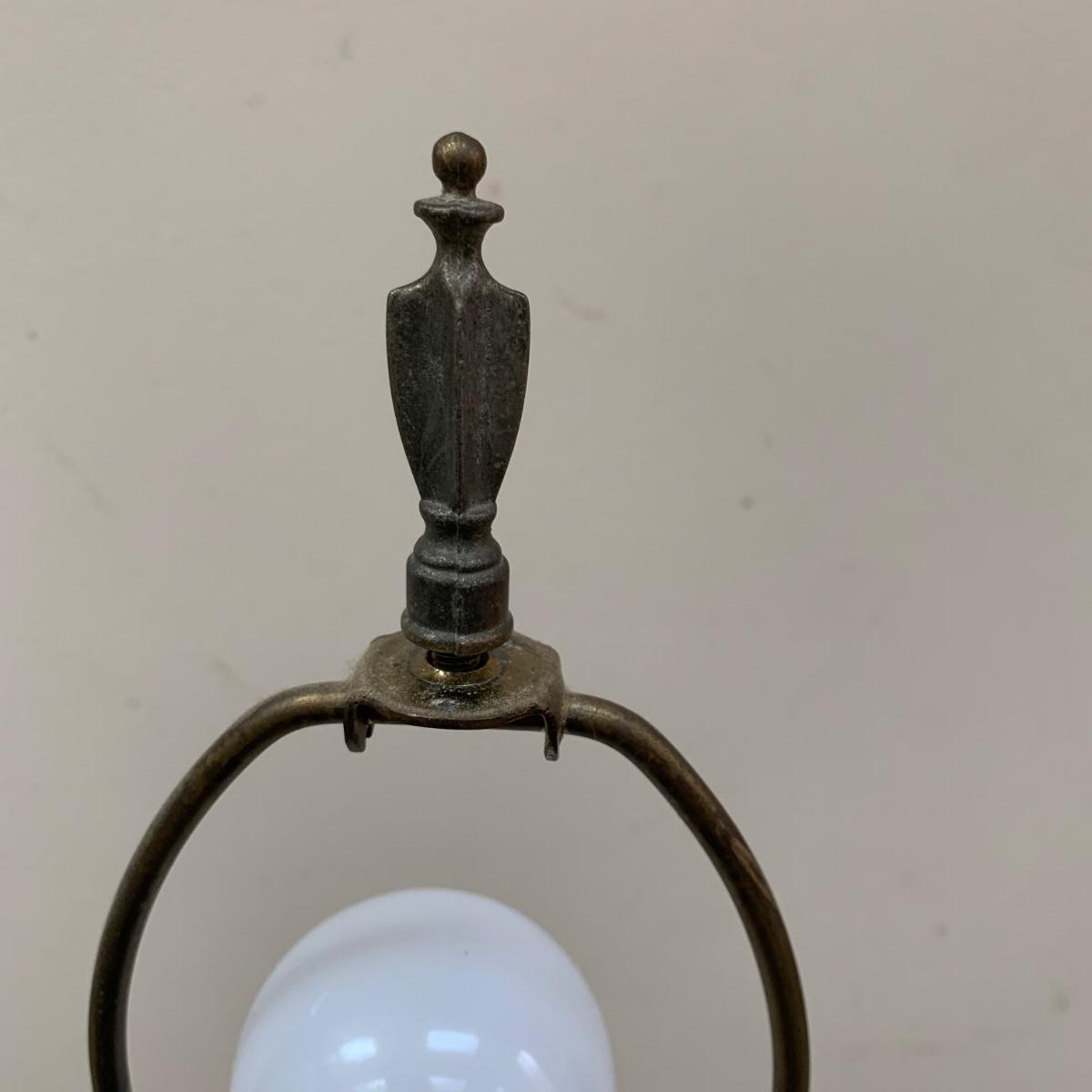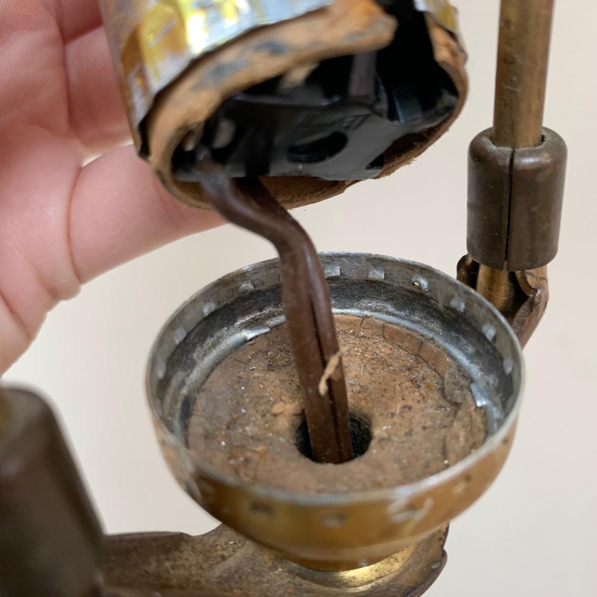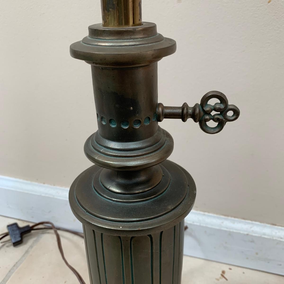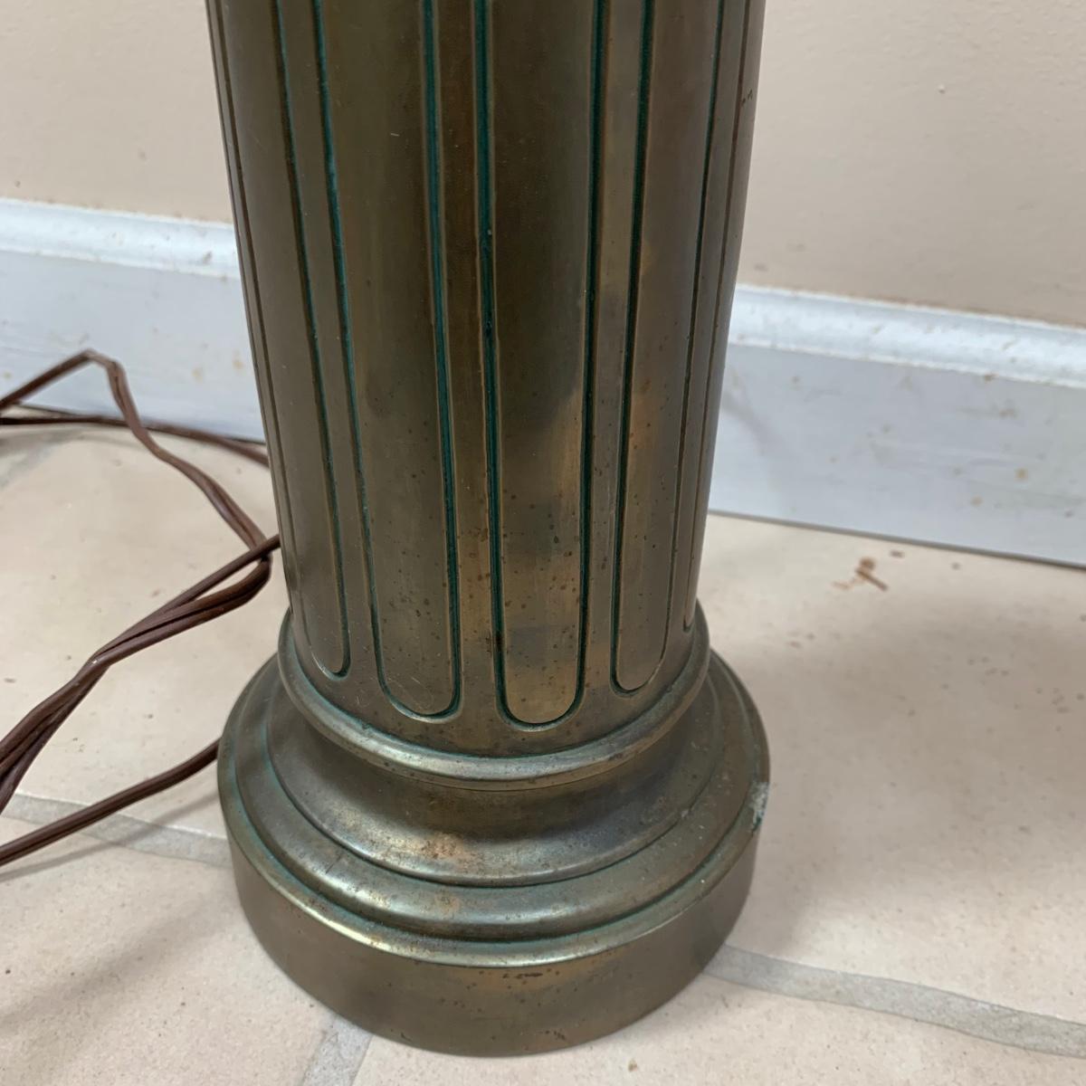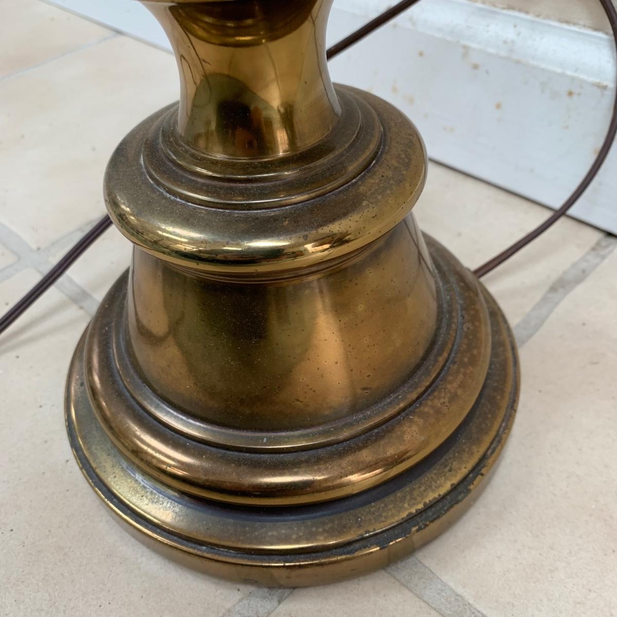 Three lamps that have bases that appear to be brass. One has more of a bronze finish. The tallest lamp has a Stiffel Company label. This one is 3 ft. tall. It has a loose light socket that will need to be reattached. The other two have sockets that are marked “Leviton”. All three turned on when tested. Lamps show some wear but are otherwise in good condition.