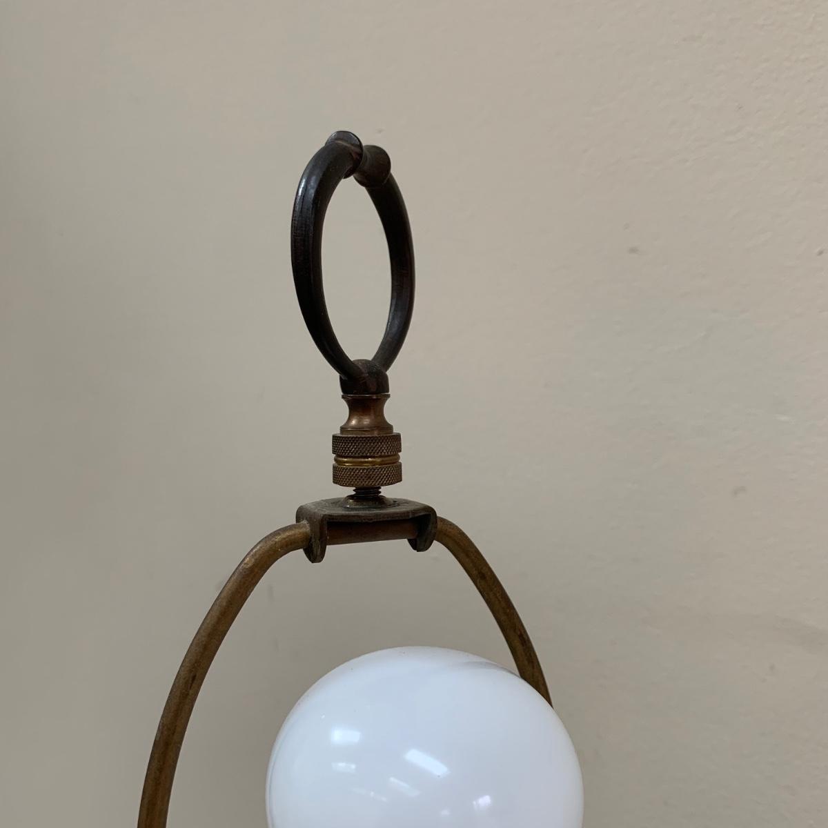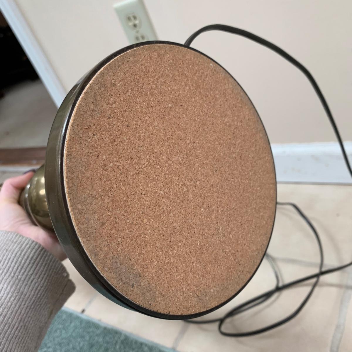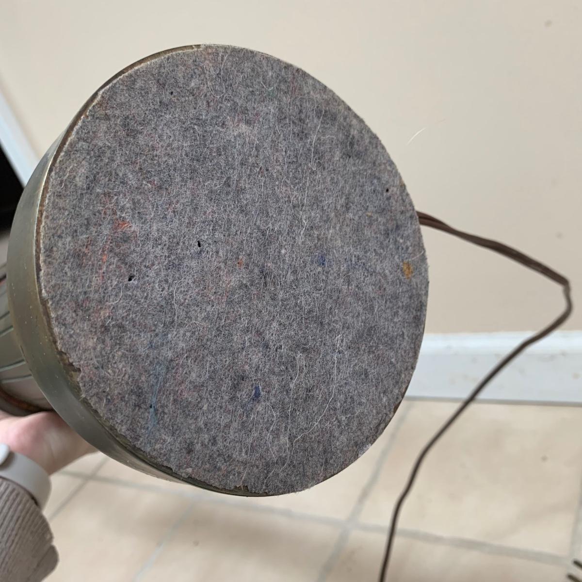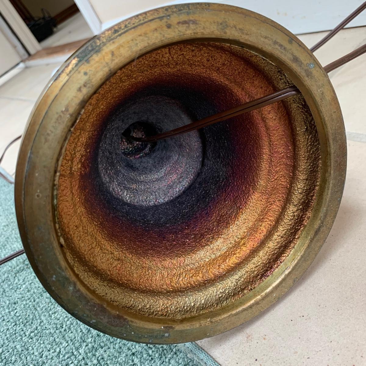 Three lamps that have bases that appear to be brass. One has more of a bronze finish. The tallest lamp has a Stiffel Company label. This one is 3 ft. tall. It has a loose light socket that will need to be reattached. The other two have sockets that are marked “Leviton”. All three turned on when tested. Lamps show some wear but are otherwise in good condition.