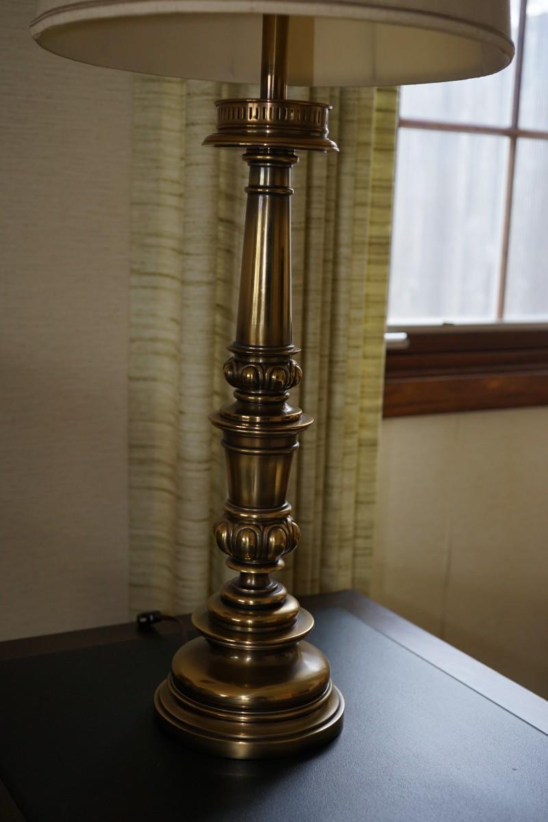 STIFFEL QUALITY BRASS TABLE LAMP WITH ORIGINAL FABRIC SHADE.