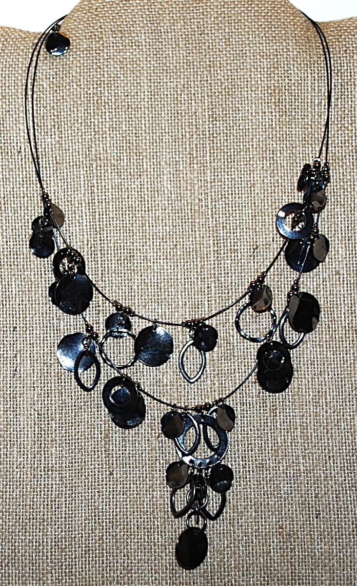 Stiff-Wired "Circles & Coins" NECKLACE with Dark Silver Colored Bead Accents and Lobster Clasp 20" L