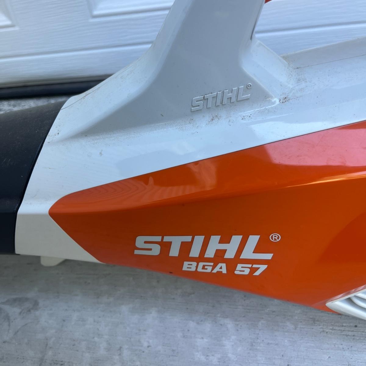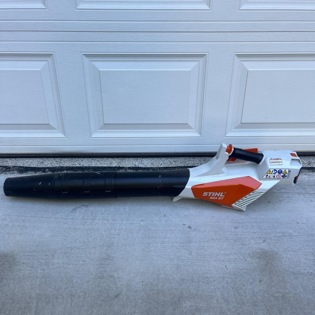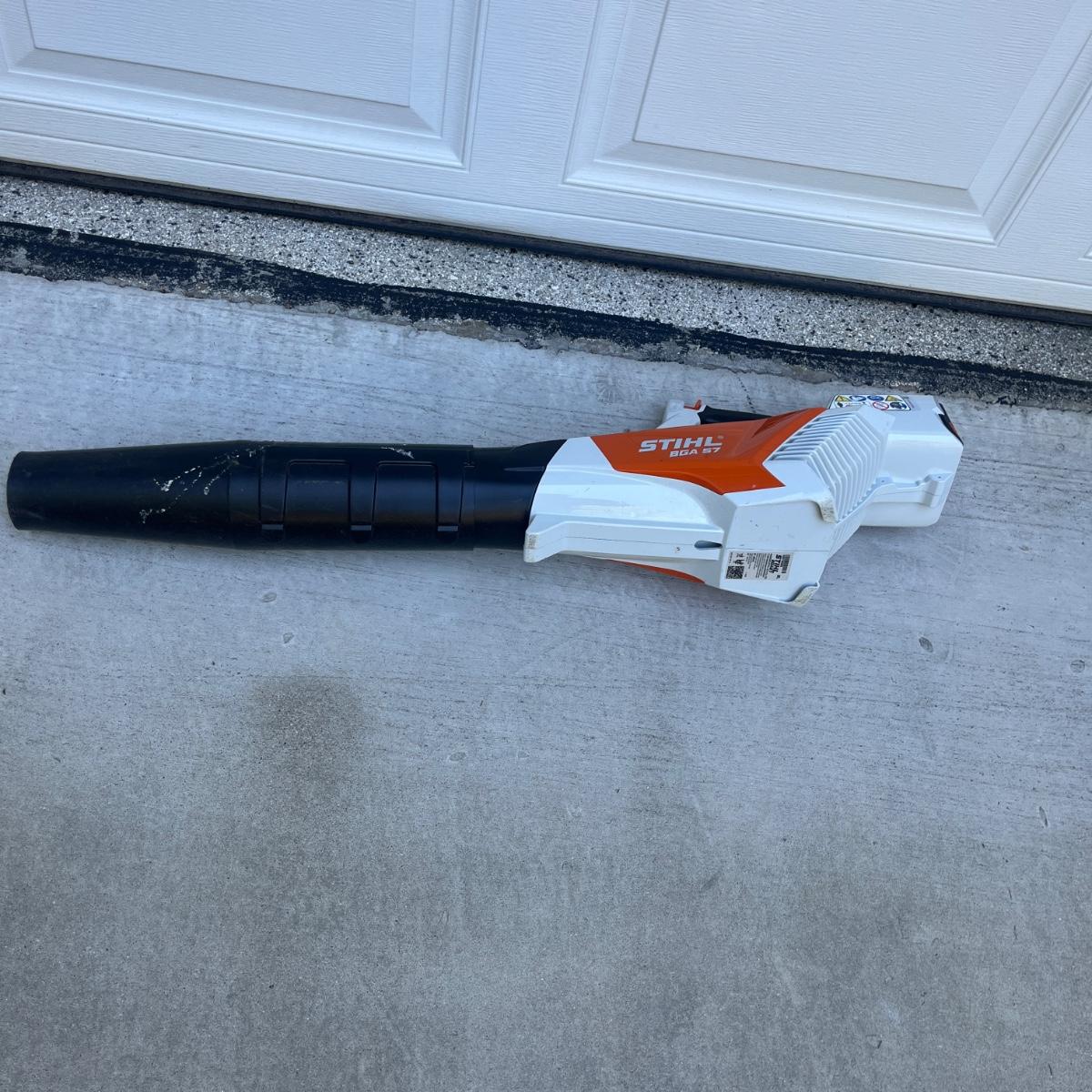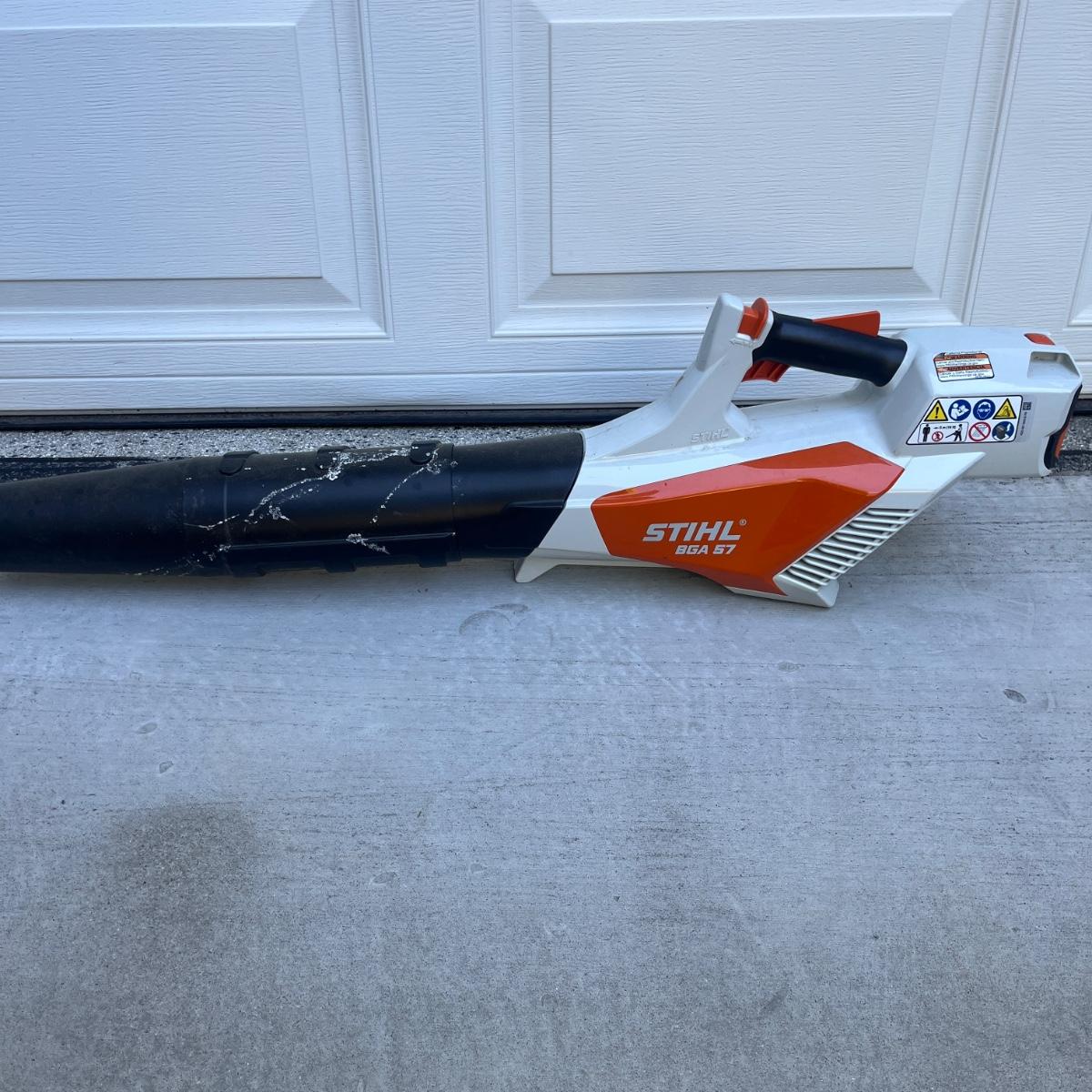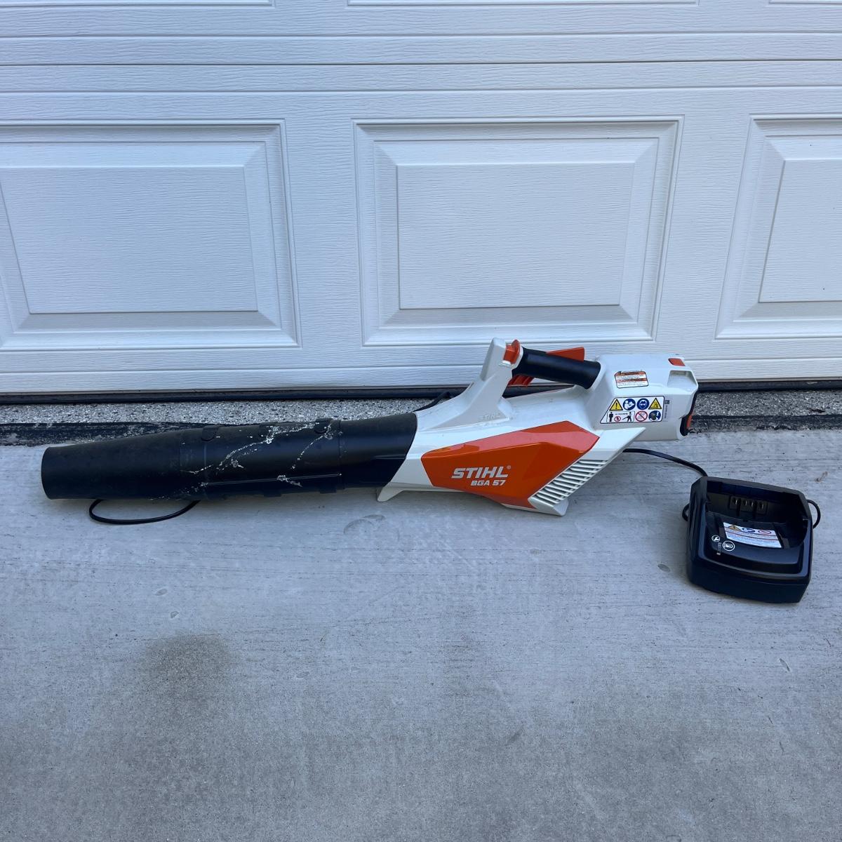 This Stihl BGA 57 cordless blower includes a battery and charger and also has adjustable length tube. Blower measures 43” x 7” x 10”H when tube is fully extended. Blower powered on when trigger pulled.