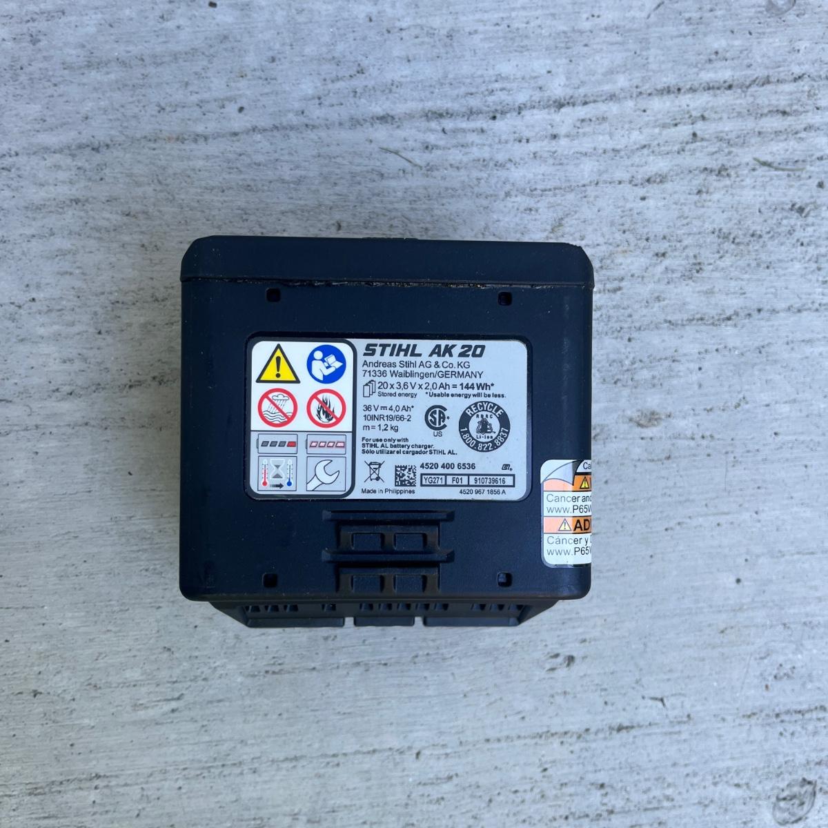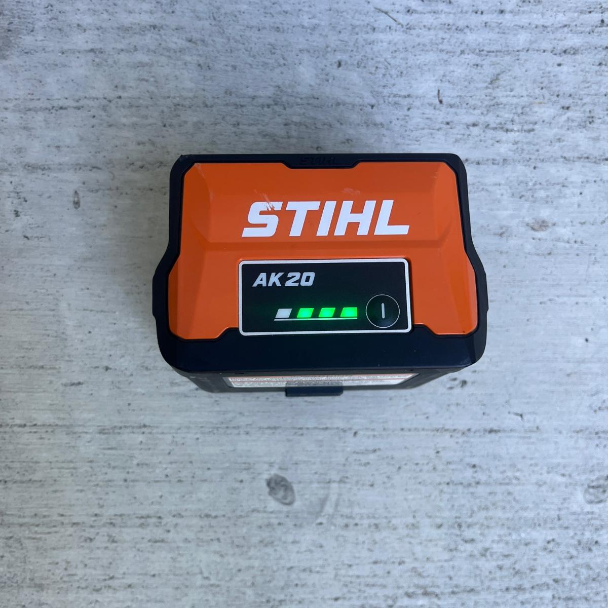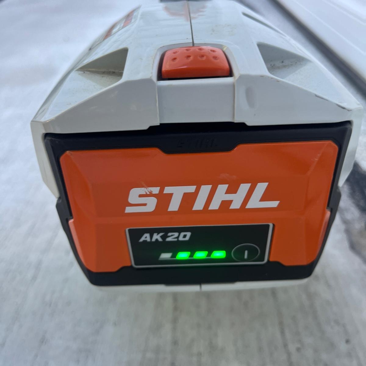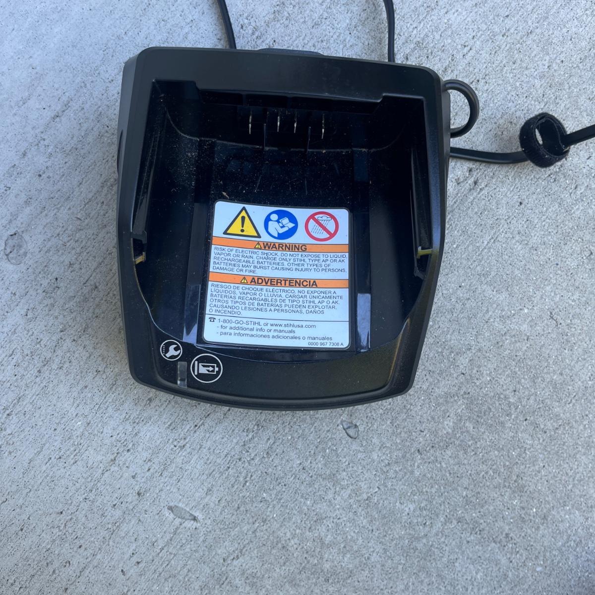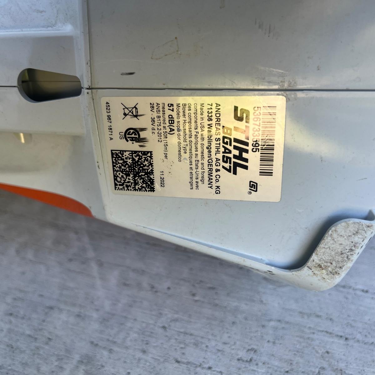This Stihl BGA 57 cordless blower includes a battery and charger and also has adjustable length tube. Blower measures 43” x 7” x 10”H when tube is fully extended. Blower powered on when trigger pulled.