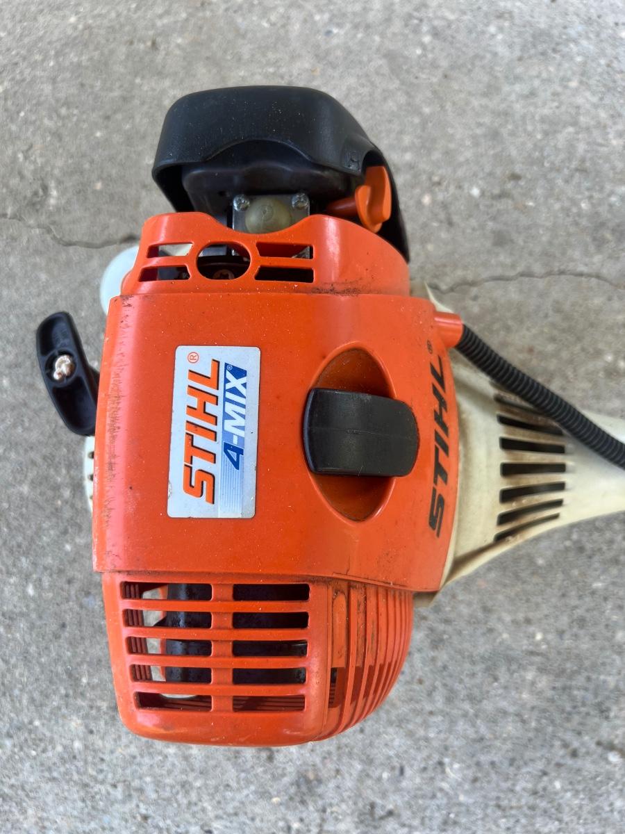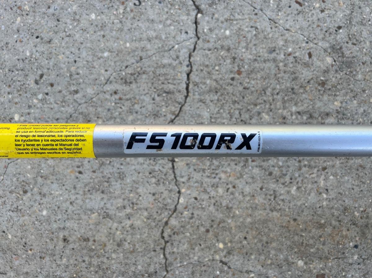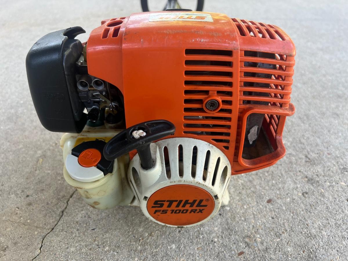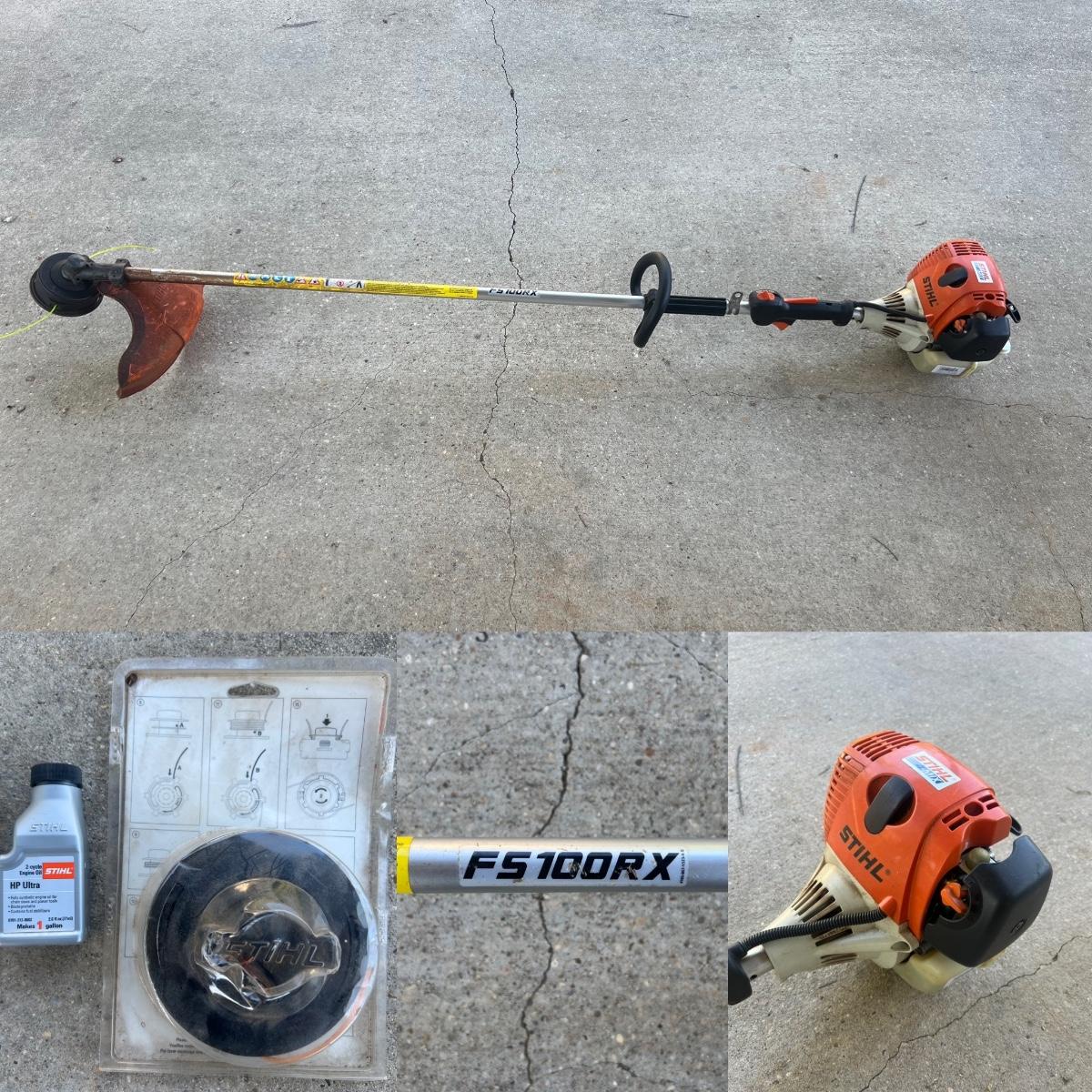 Stihl FS100RX trimmer. Started right up when testing. Works as it should. See pictures for condition. Comes with 2 - 1 gallon oil mixers and a new head.