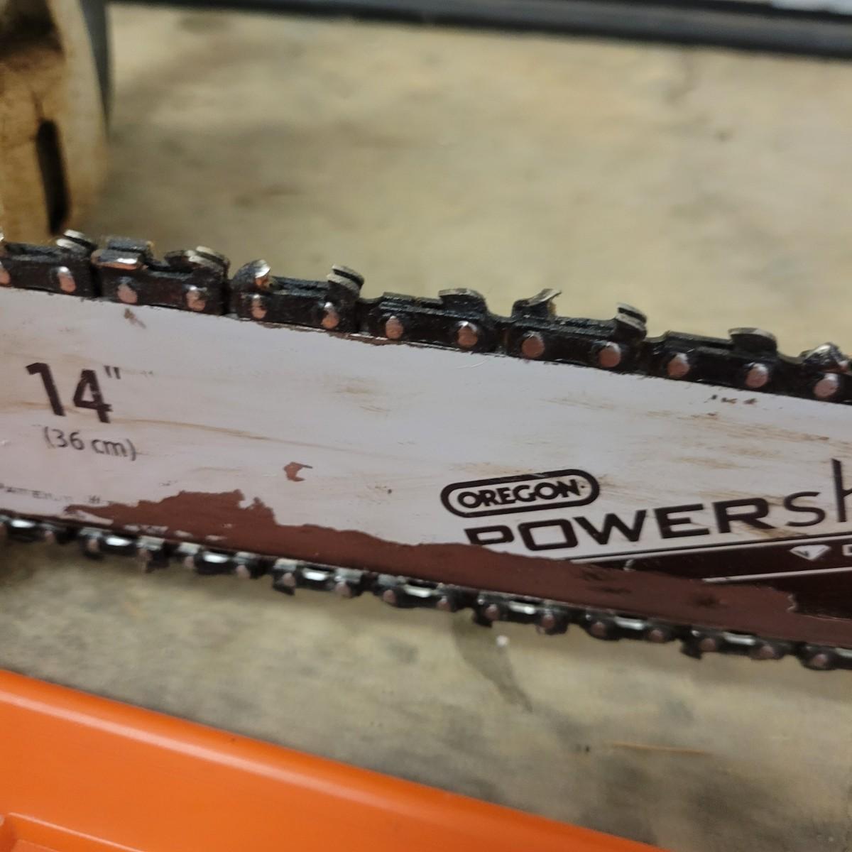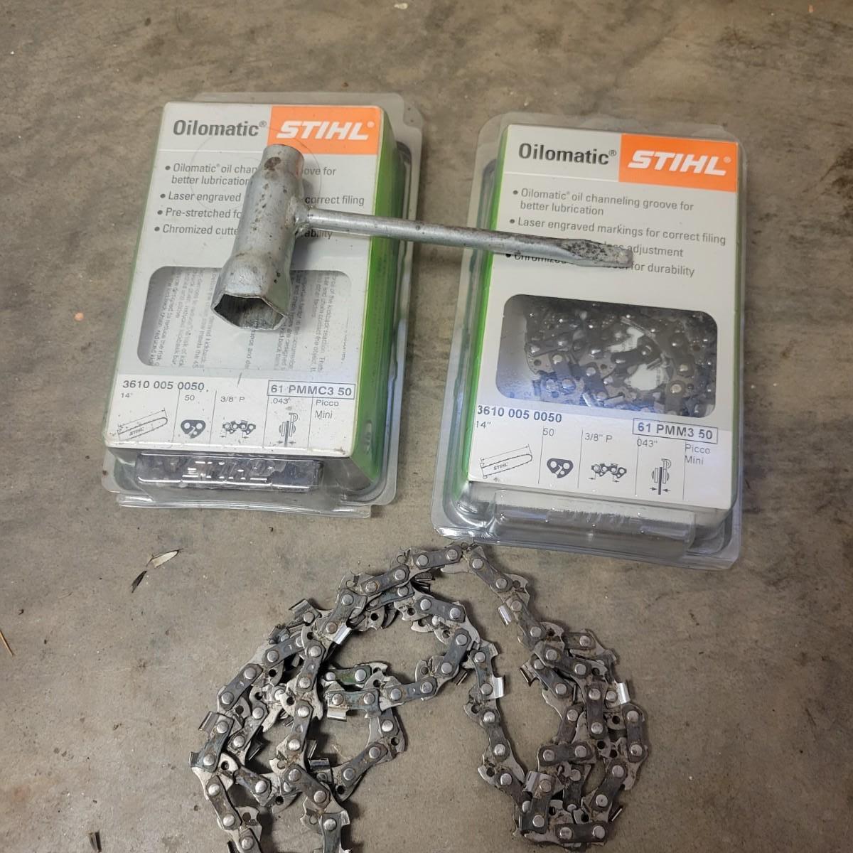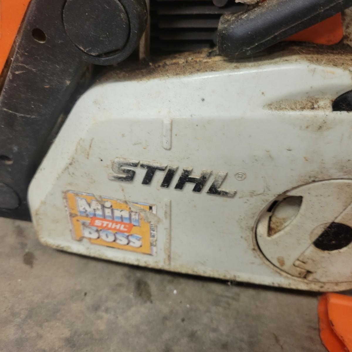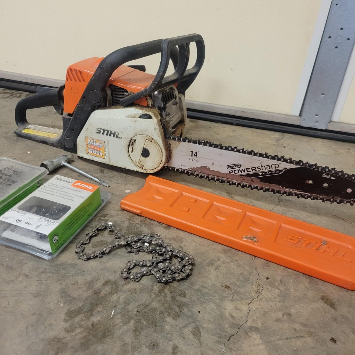 Stihl Mini Boss chainsaw, blades and multi wrench in good condition with some scratches and blemishes associated with use. This chainsaw has a 14" Oregon bar. Chainsaw turned over and pulls clean when tested. Model # MS180C. This lot also includes three extra blades, one of which is NIB and a multi wrench for adjusting chain sag, removing the bar and other uses. Local pickup only