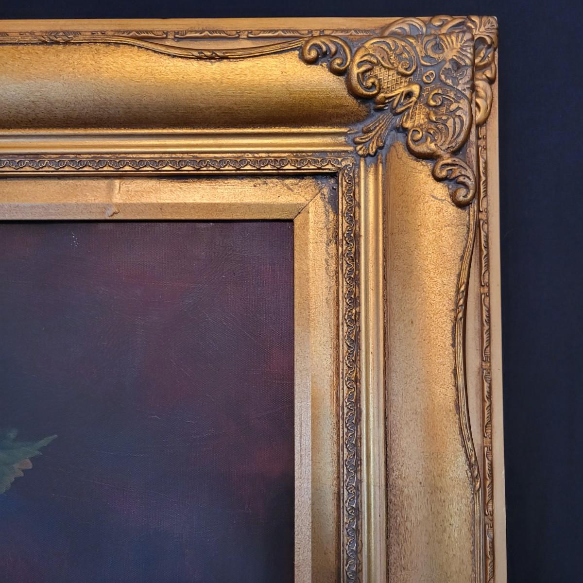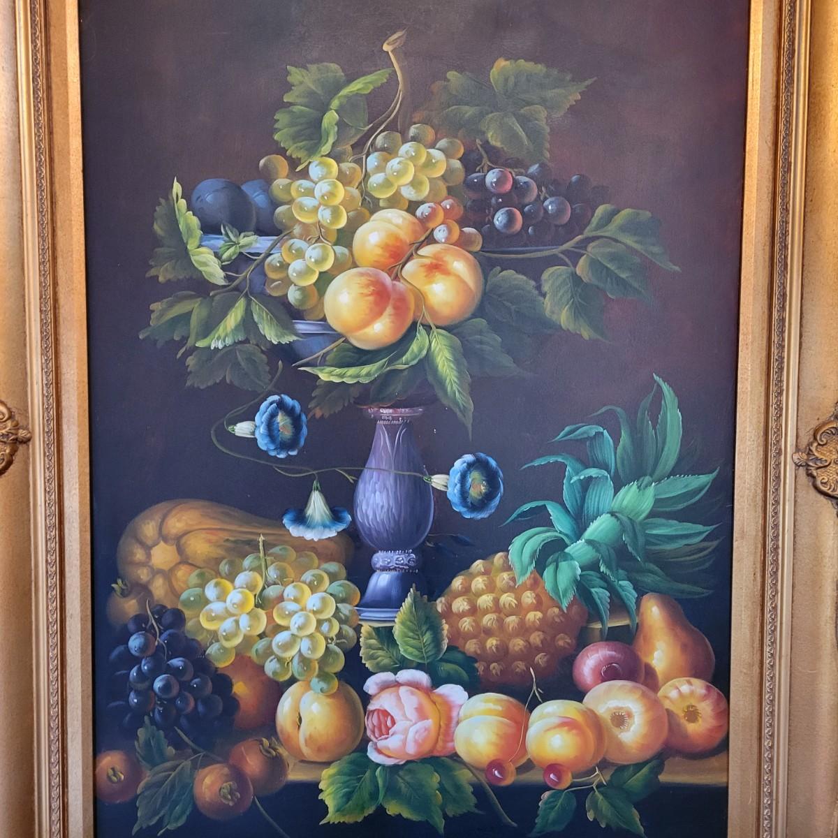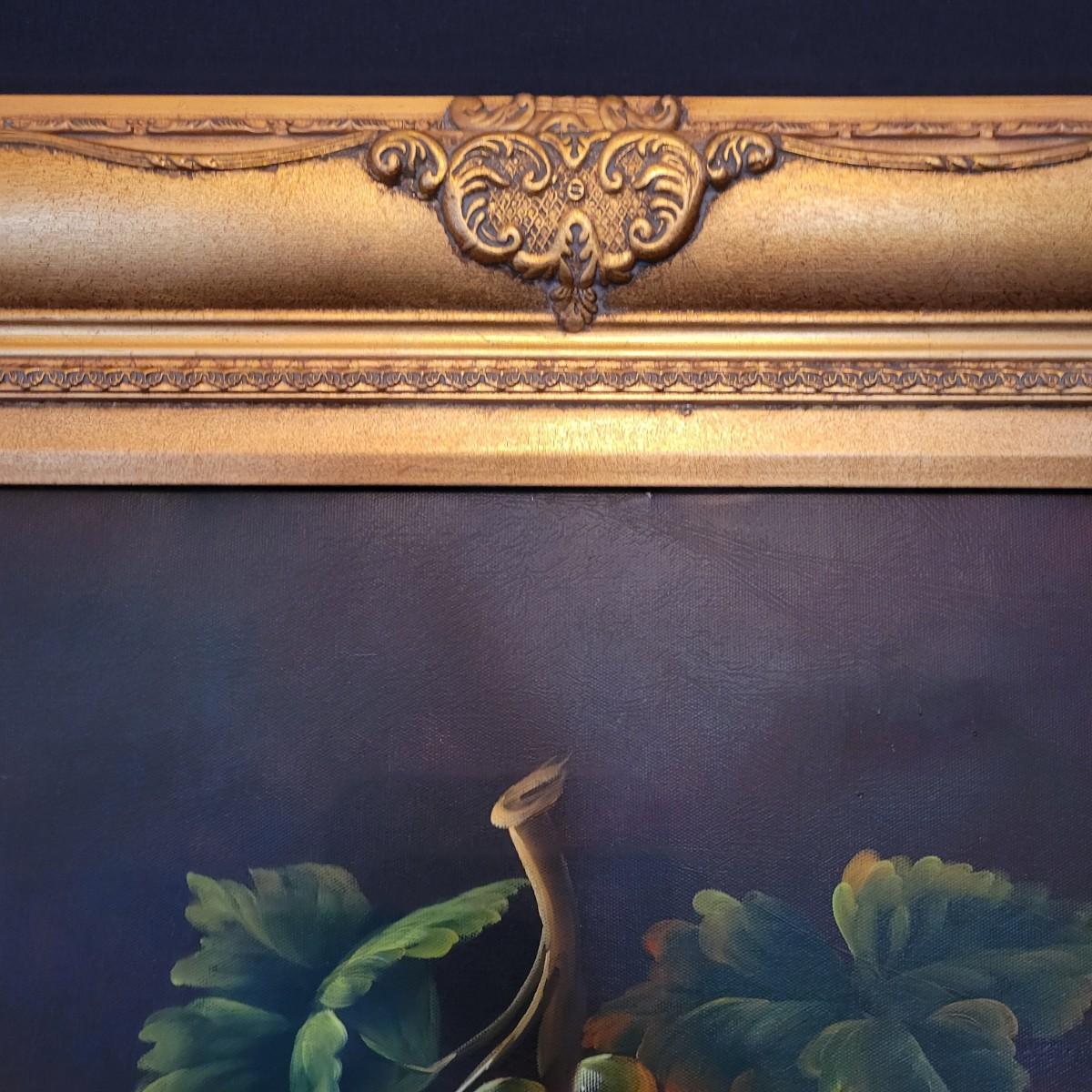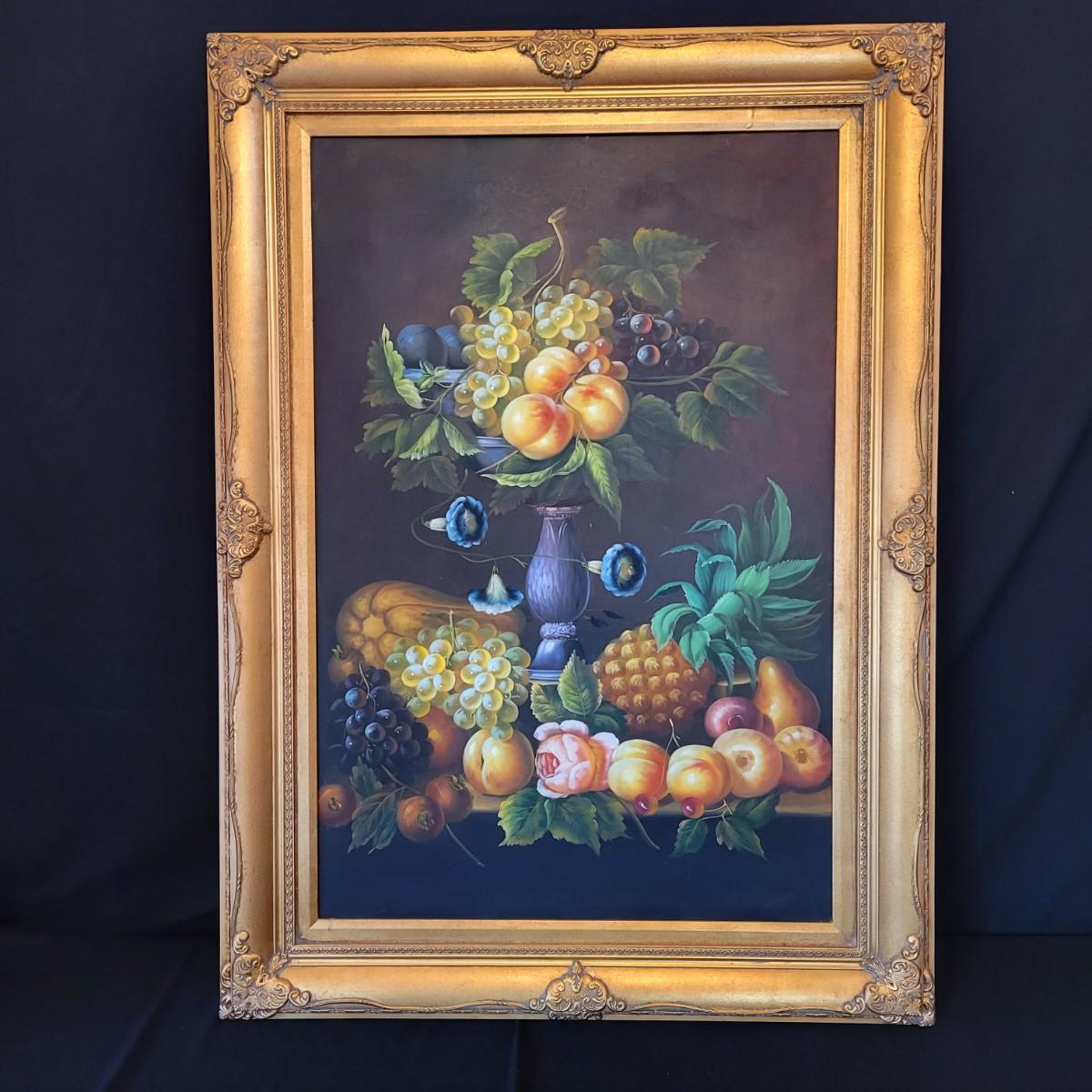 A still life on canvas with an ornate gold frame with no notable damage. This piece appears to be an original still life. It has an ornate gold frame and measures approximately 23.5" x 1.5" x 44.5" H. Local pickup only