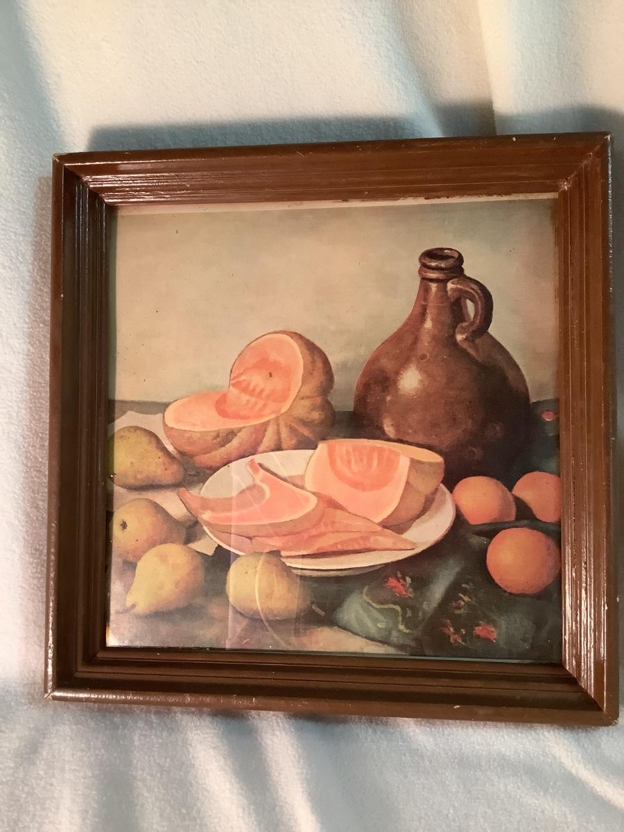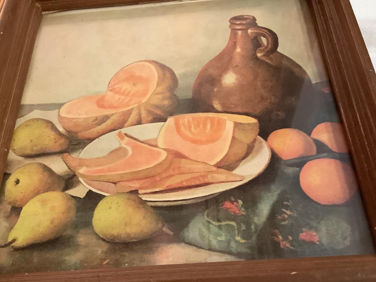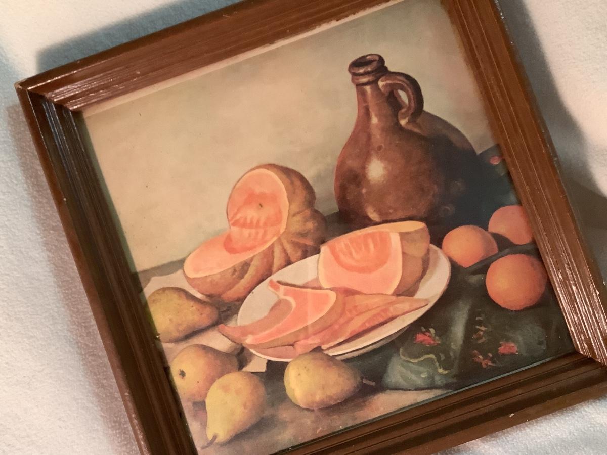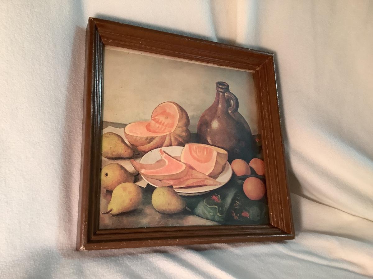 Still Life Wood frame/glass, Cantaloupe, Pears, Oranges, Jug 10" x 10"